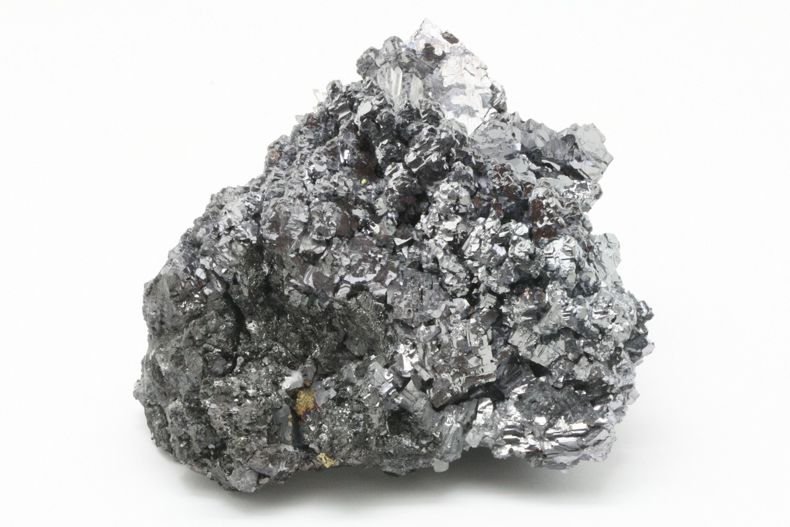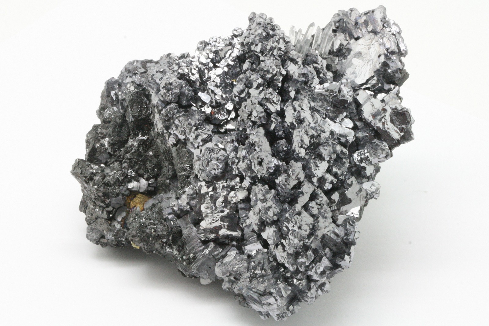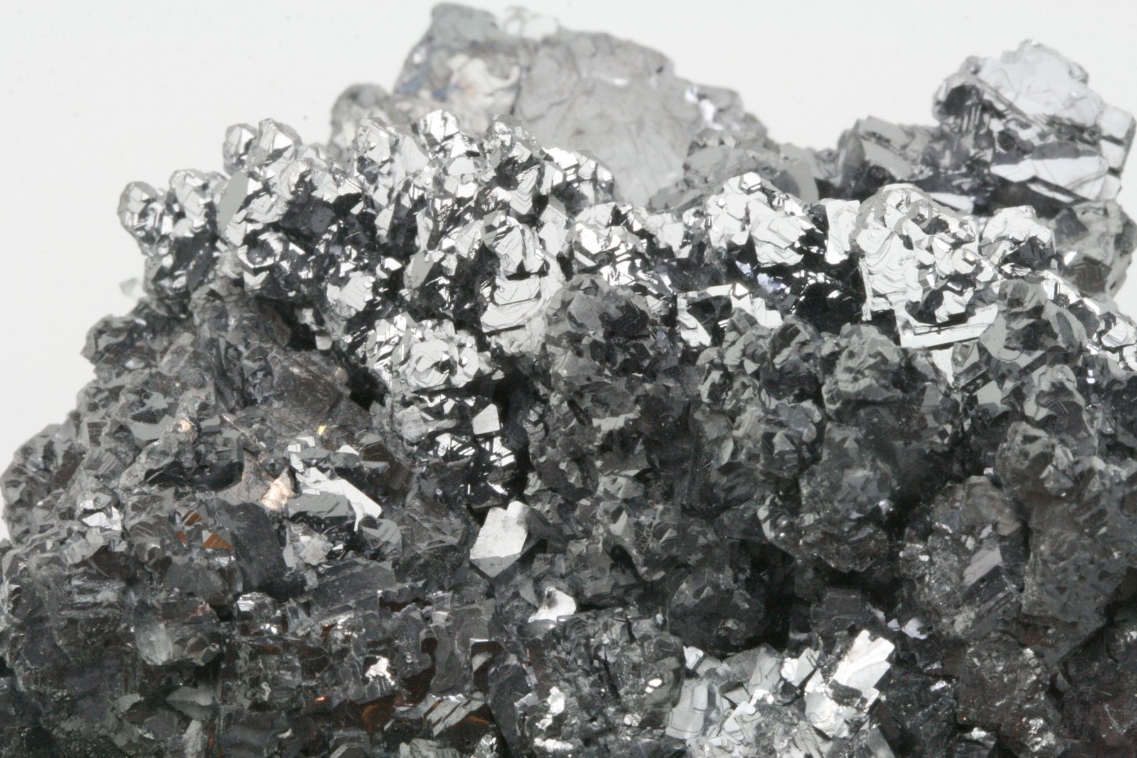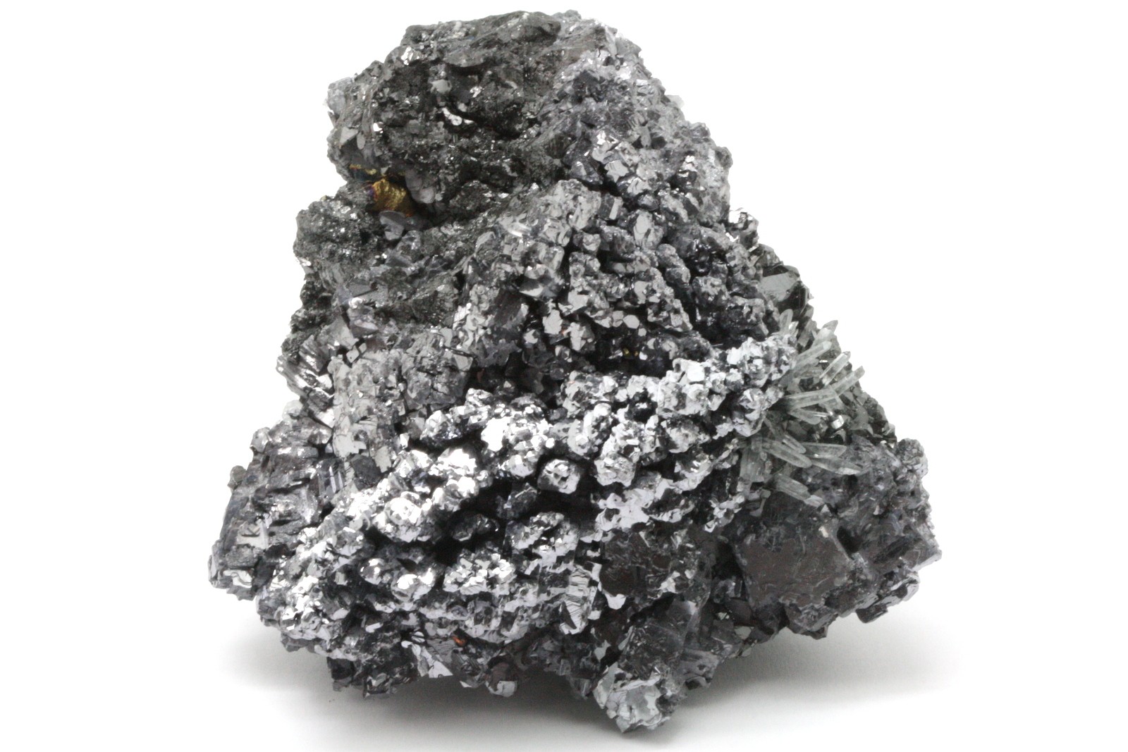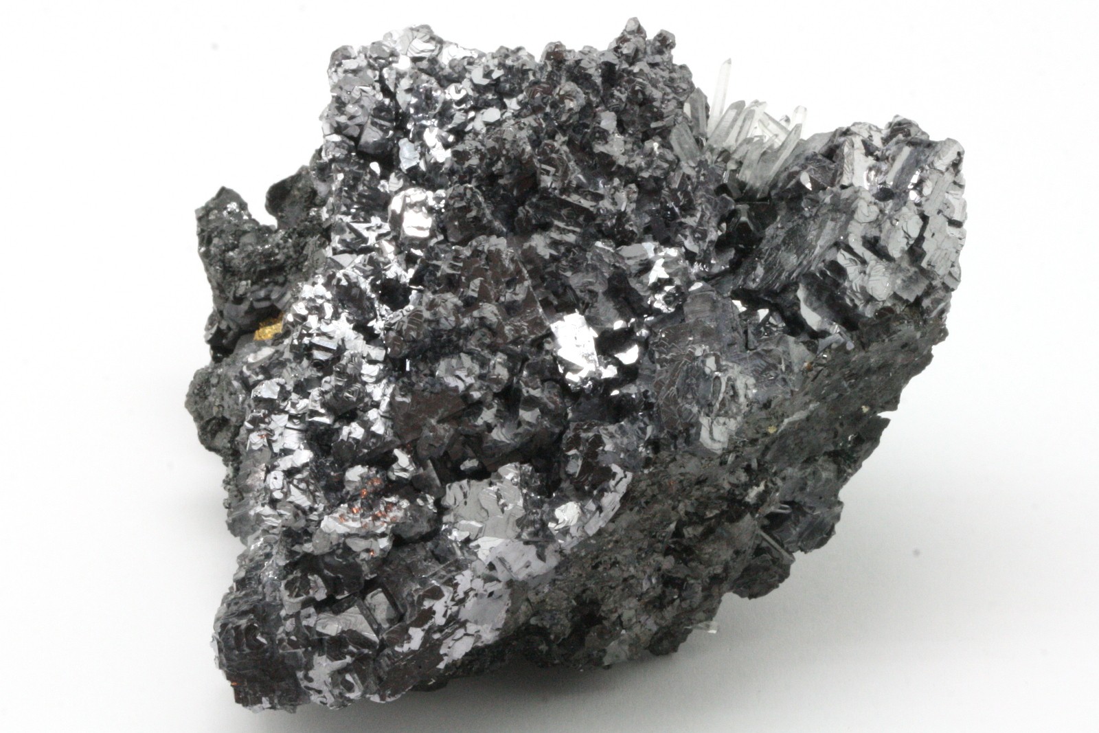 A very high-quality specimen of galenite crystals, with sphalerite crystals perched on the bottom part of the sample.
