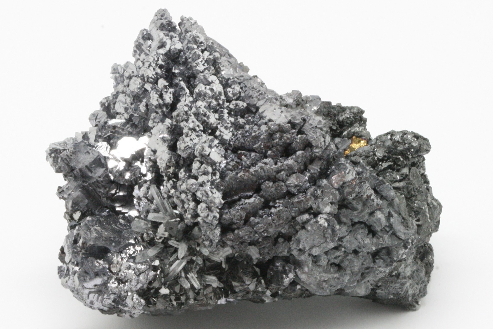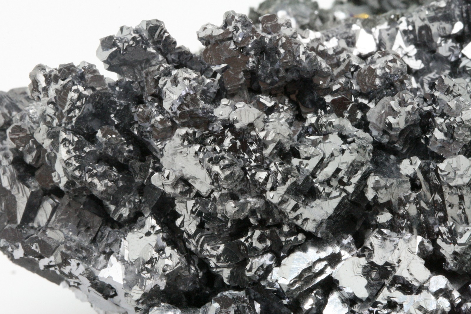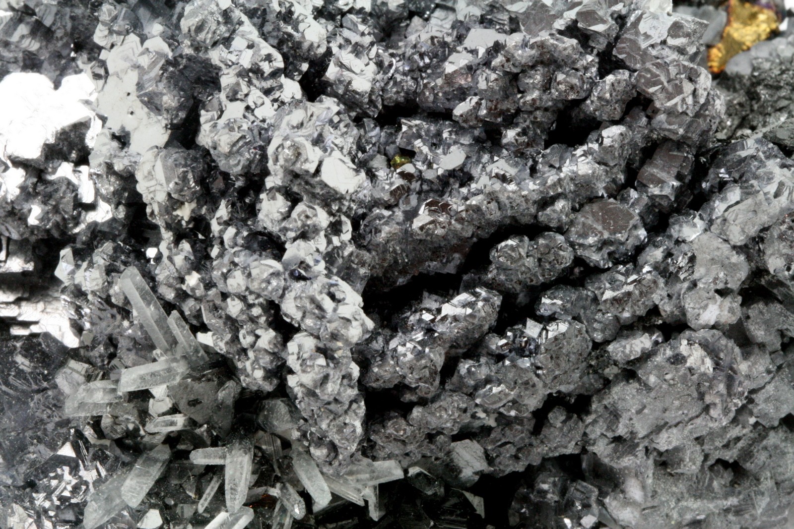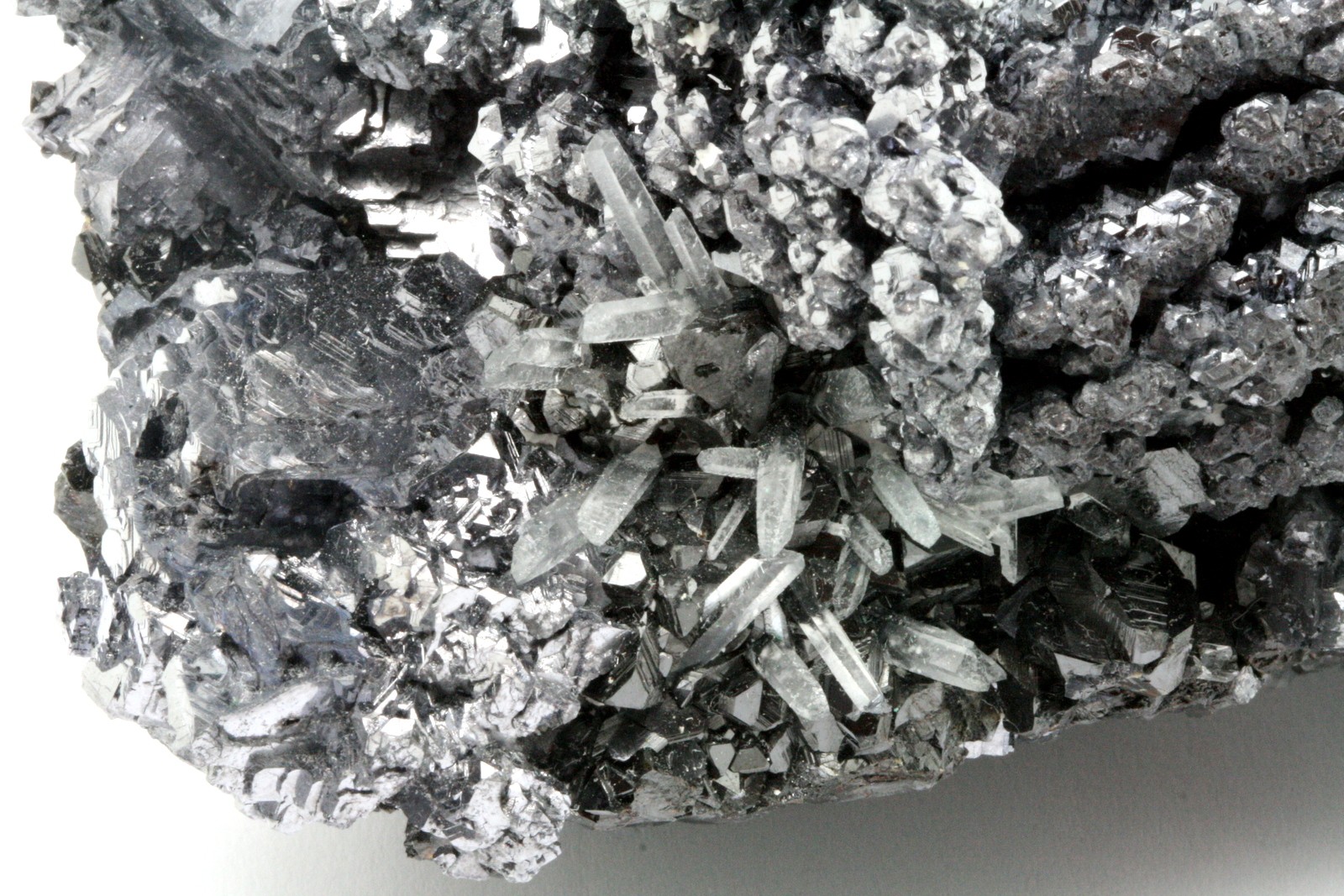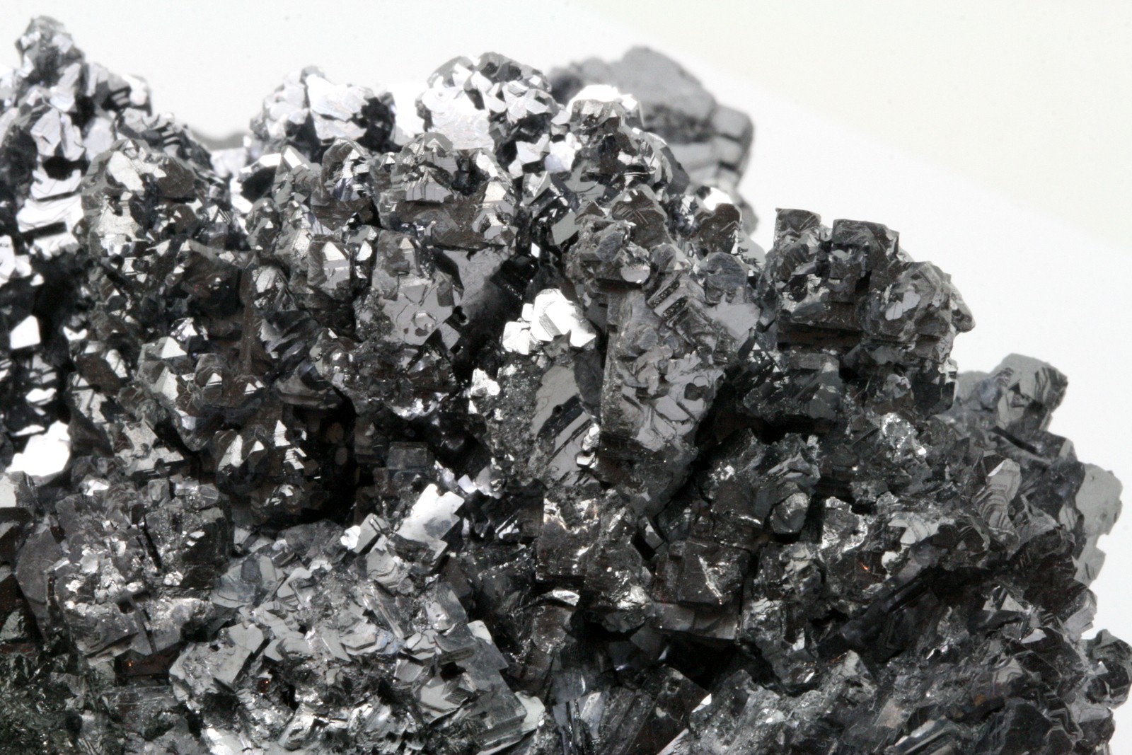 A very high-quality specimen of galenite crystals, with sphalerite crystals perched on the bottom part of the sample.