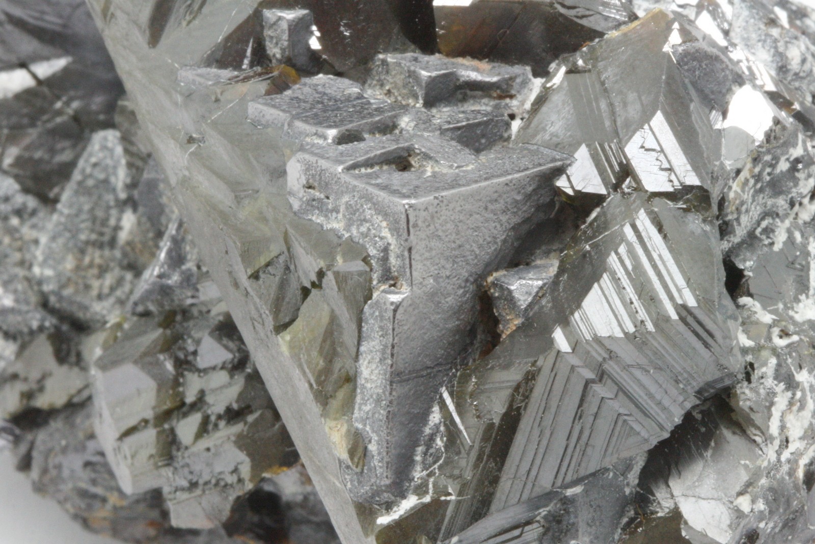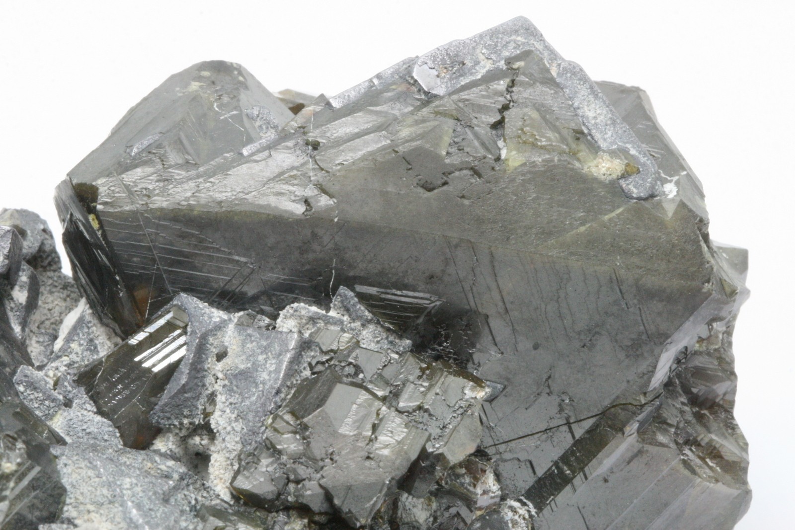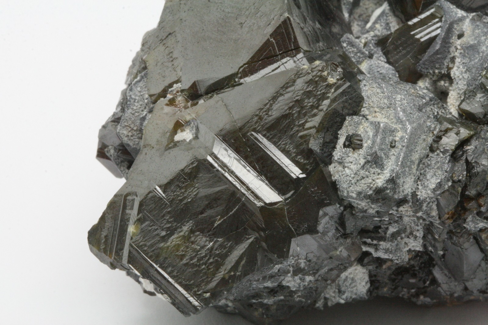A very nice specimen of sphalerite with crystals up to 6 cm in size from Madan, Bulgaria. A druse with unusually large dark brown-green crystals of sphalerite (cleophane), the largest crystal is intergrown with a cube of galena.