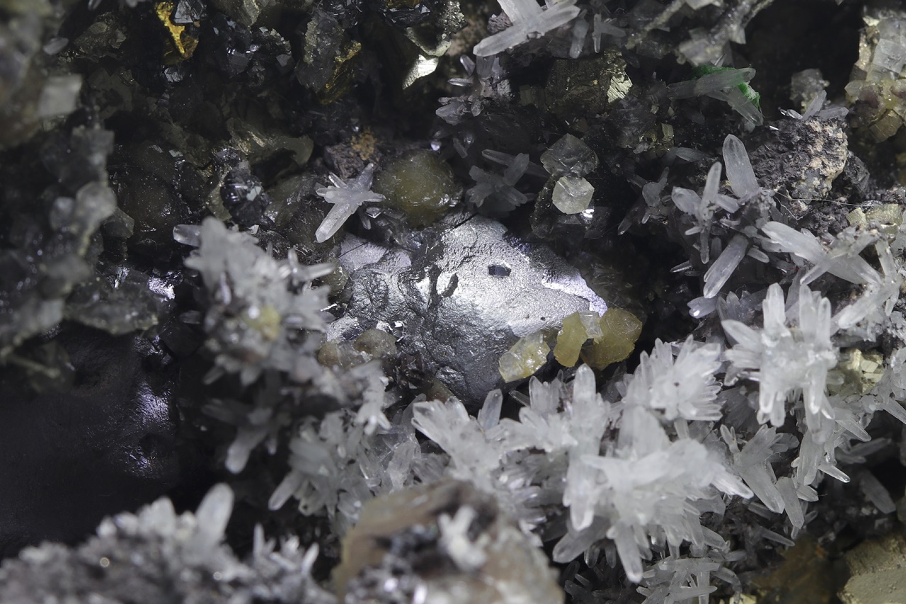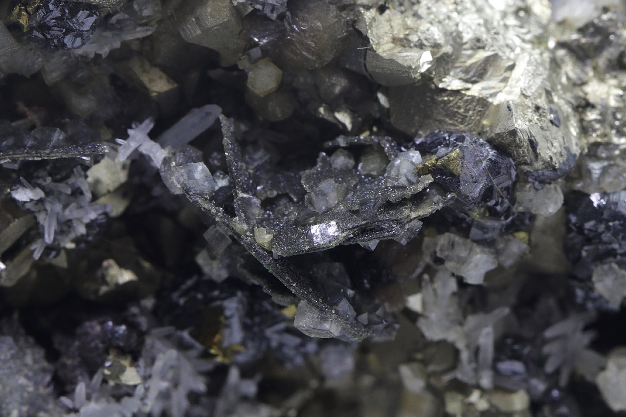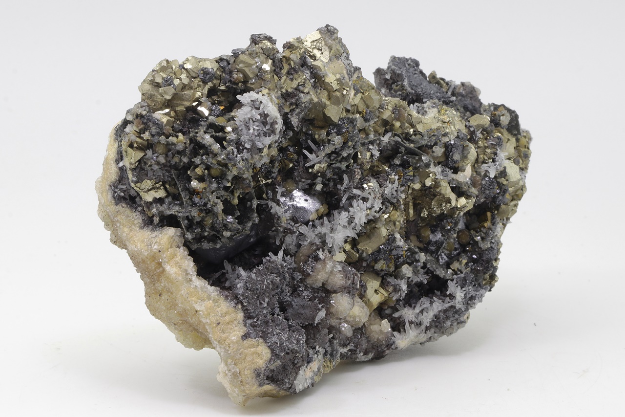 A mineralogically very diverse sample composed of large crystals of galenite and pyrite, which are overgrown with tabular pyrrhotite, spherical aggregates of dolomite and semseyite.