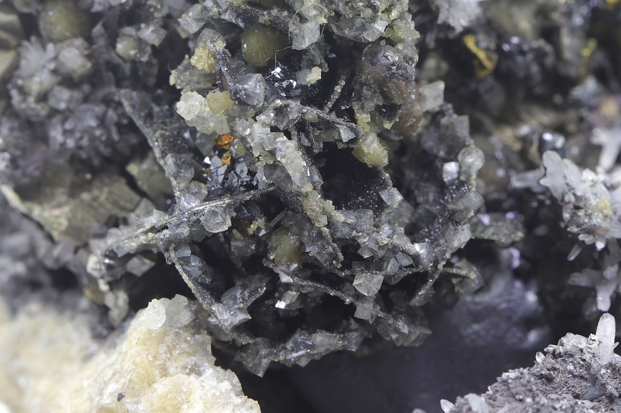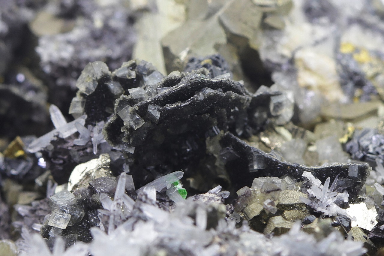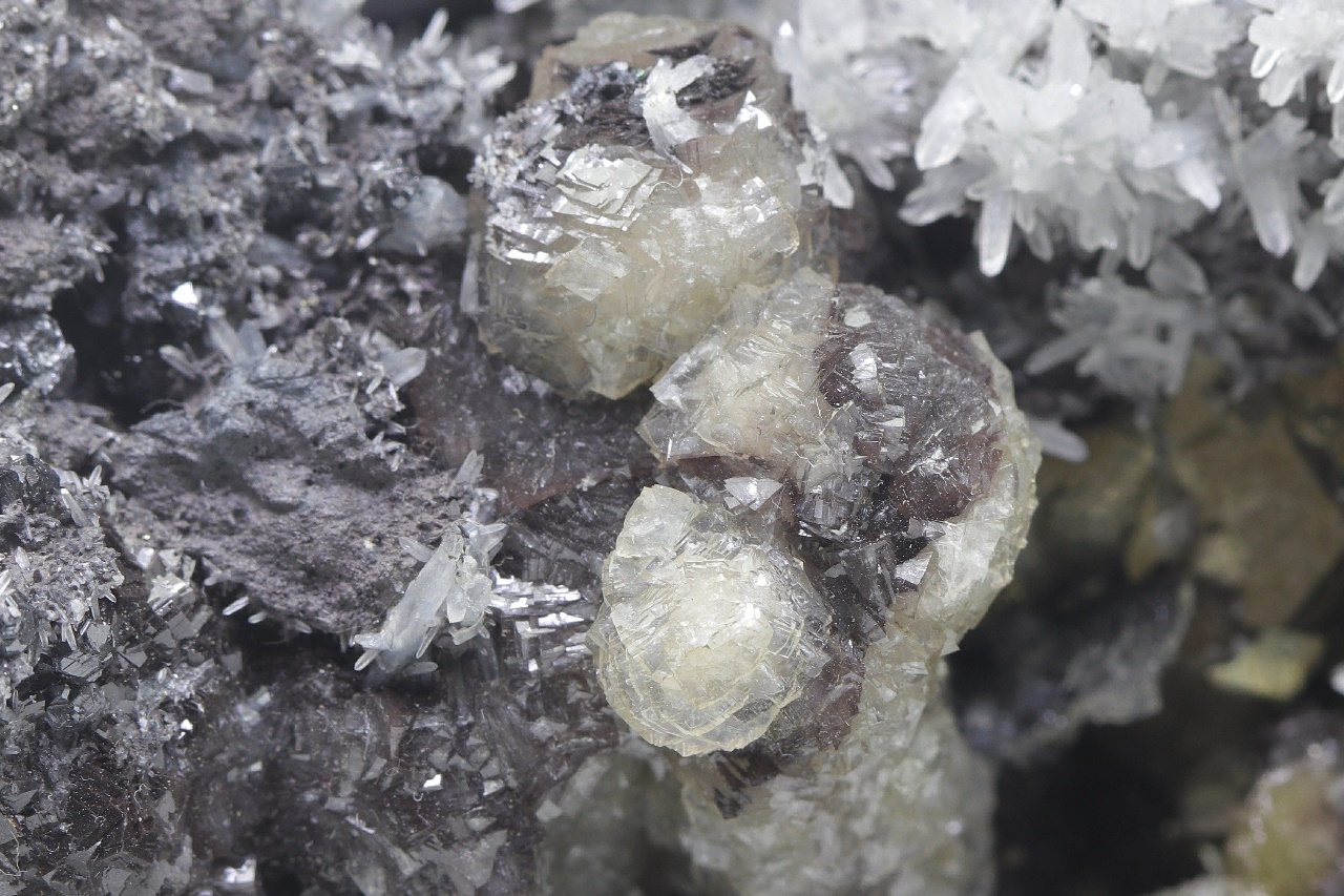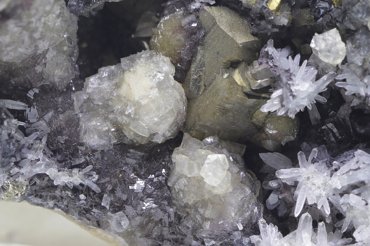 A mineralogically very diverse sample composed of large crystals of galenite and pyrite, which are overgrown with tabular pyrrhotite, spherical aggregates of dolomite and semseyite.