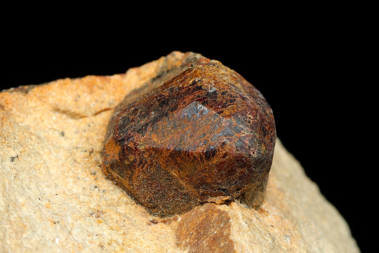 Large crystal of iron-rich almandine garnet in fine-grained rock. The crystal is 2.5 cm in size.