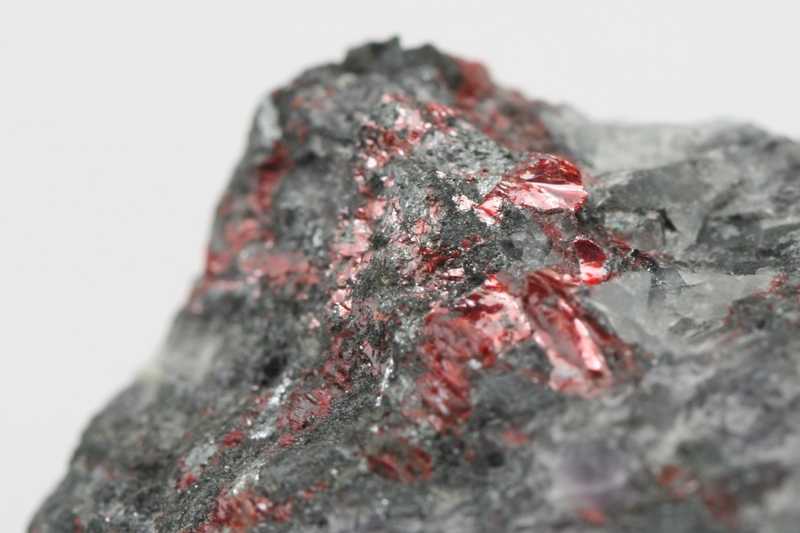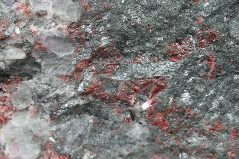 Rare dark red arsenic and antimony sulfide. Up to 4 mm large grains of scheelite.