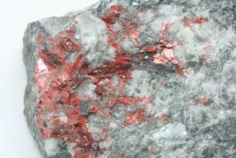 Rare dark red arsenic and antimony sulfide. Up to 4 mm large grains of geschellit.