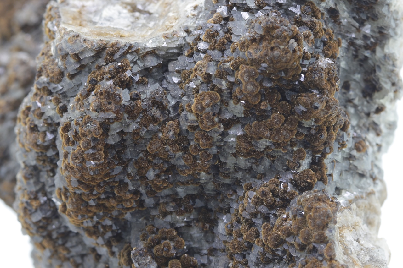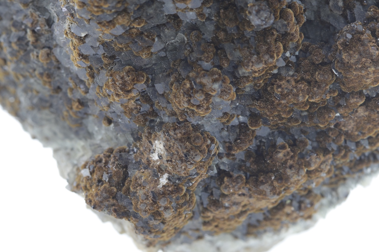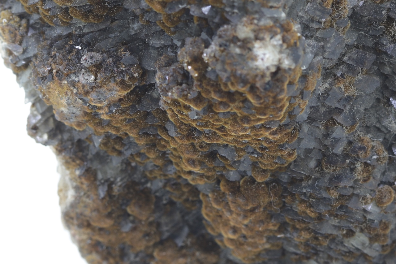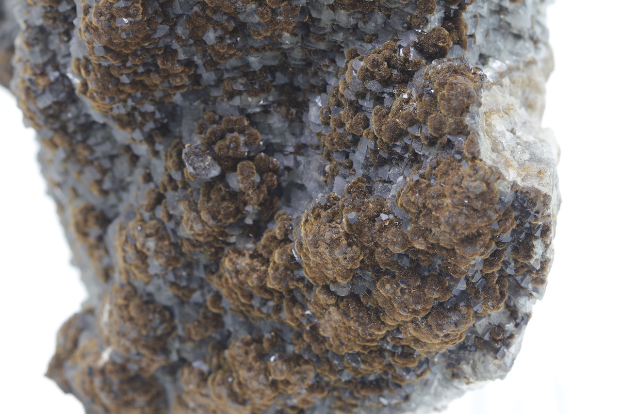 Goethite aggregates with a characteristic velvety sheen grown on cockade calcite.