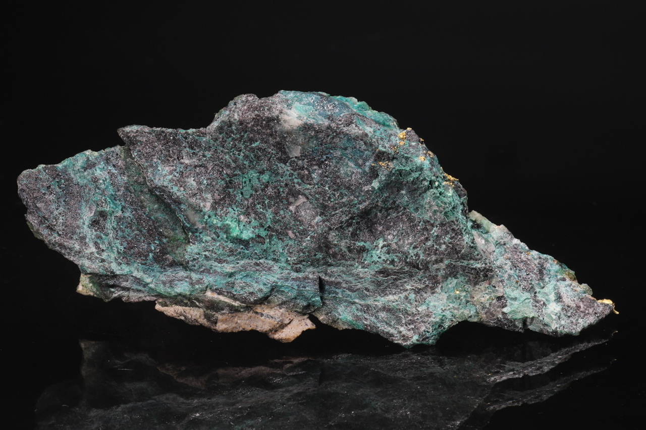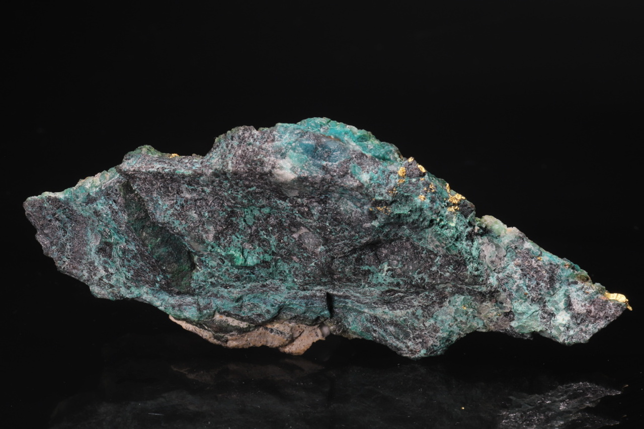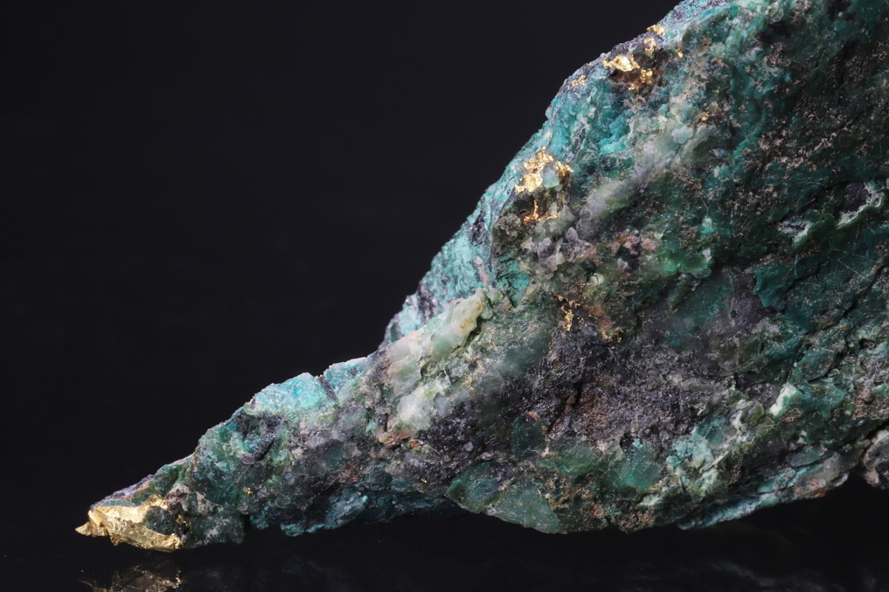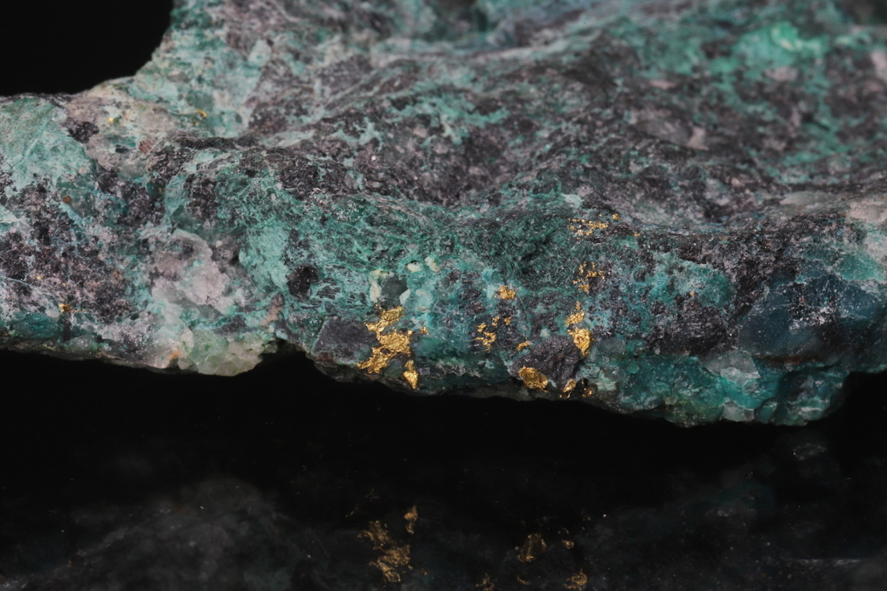 Flat contrast sample of Malachite and other Cu minerals richly intergrown with coarse aggregates of gold up to 4 mm in size.
