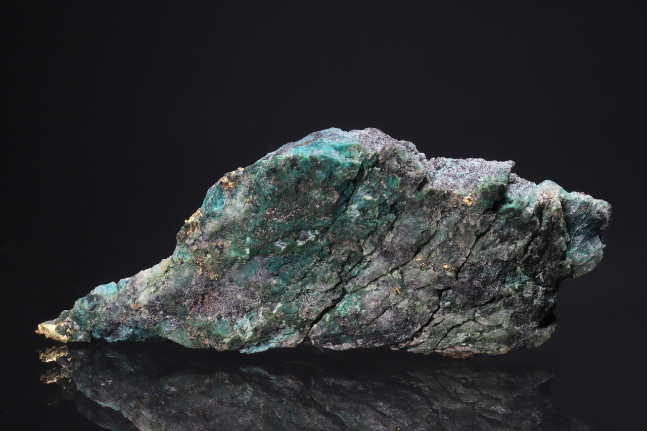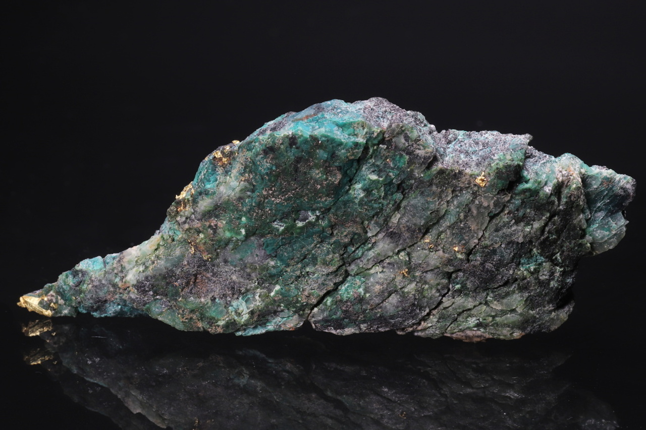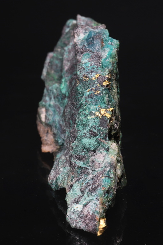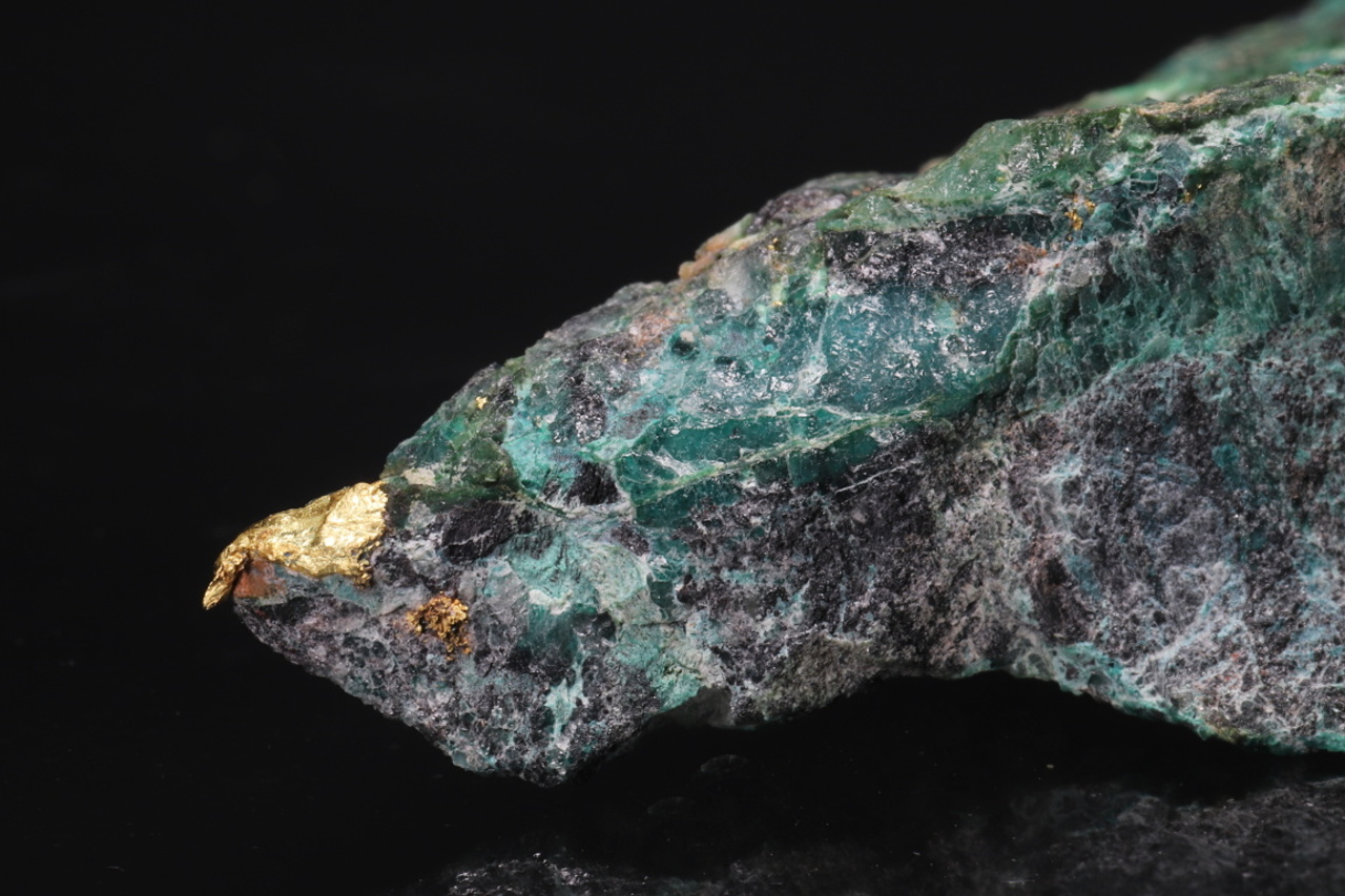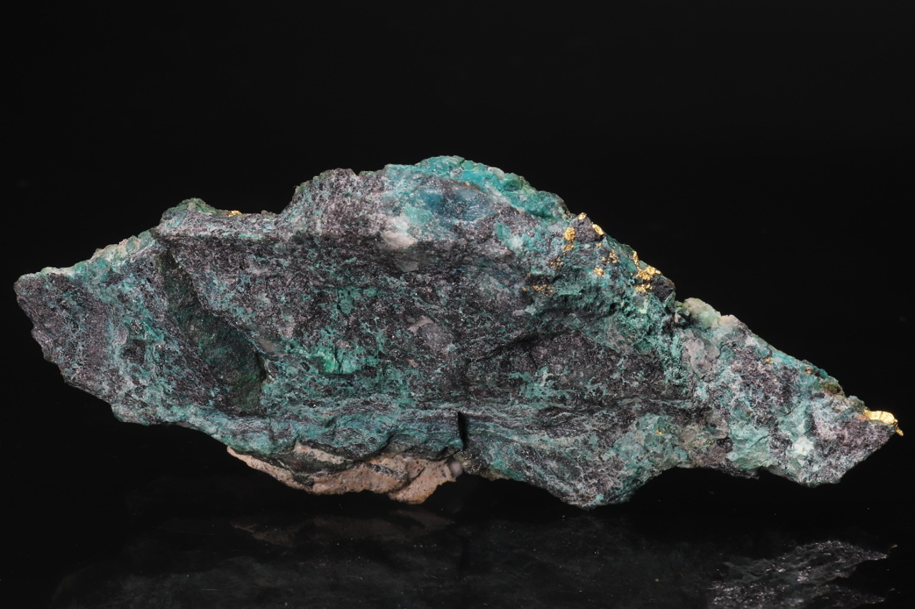Flat contrast sample of Malachite and other Cu minerals richly intergrown with coarse aggregates of gold up to 4 mm in size.