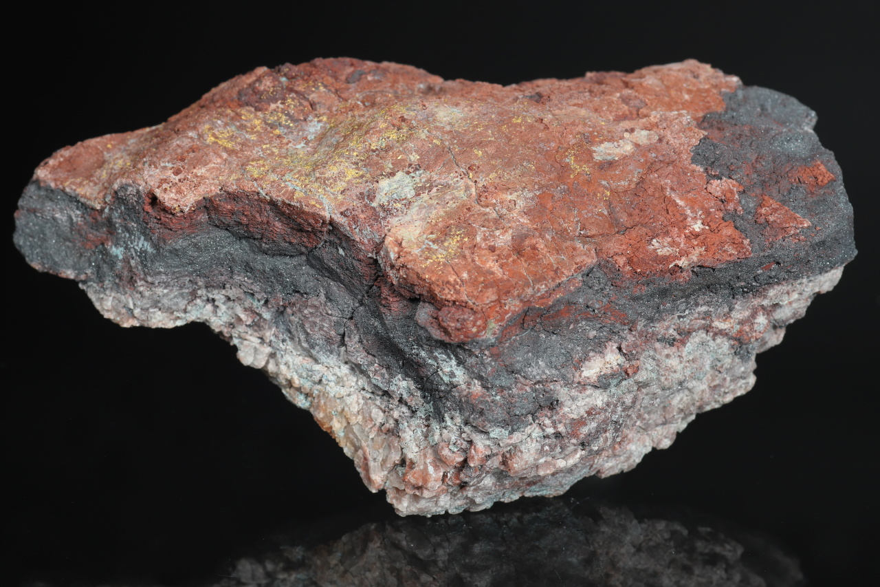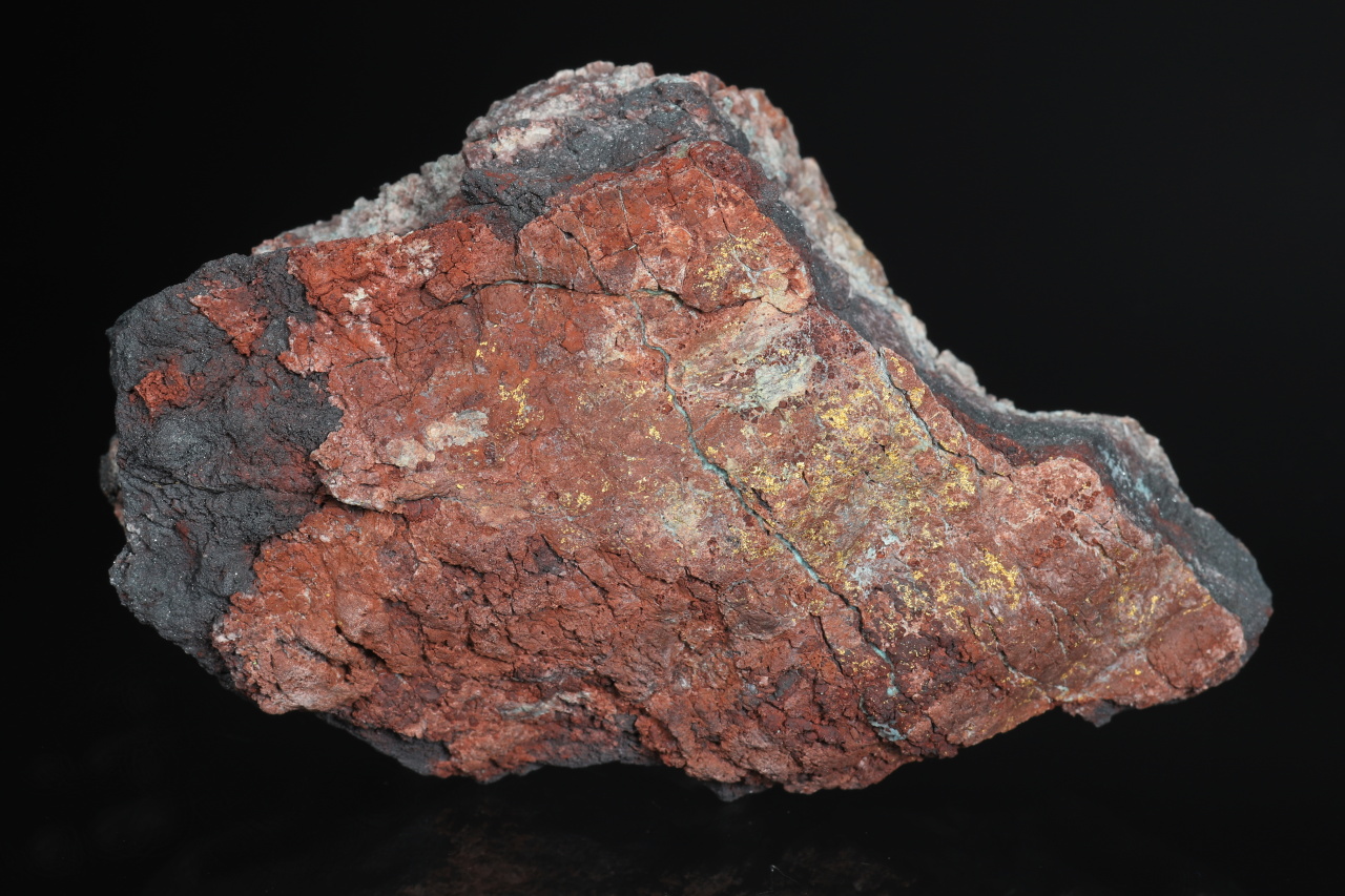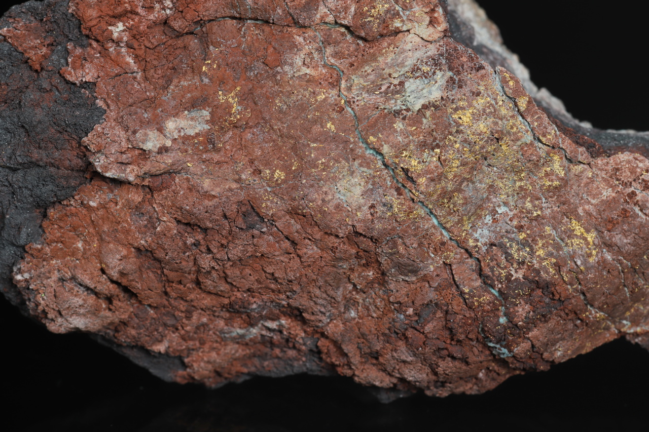 Thin flakes of gold on the surface of a vein composed largely of granular hematite.