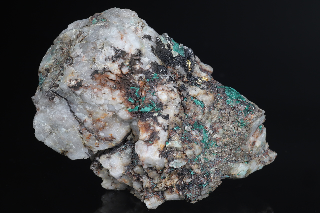 The sample is a striking yellow, approximately 3-4 mm large aggregates of gold in quartz, along with fibrous malachite. An interesting color combination of gold with malachite from the Bou Azzer site in Morocco.