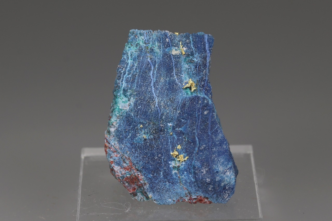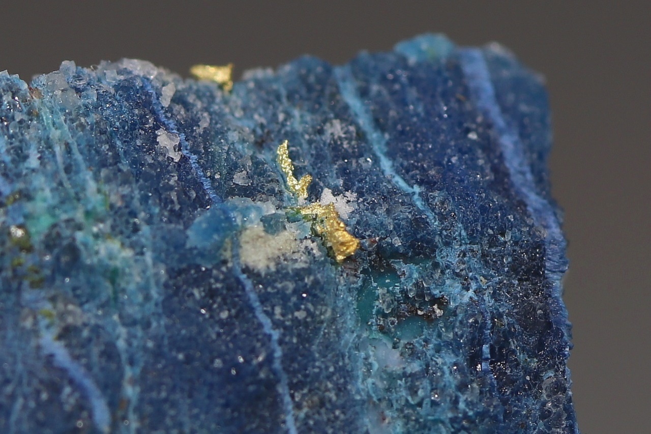 Unusual and very elegant combination of aggregates of pure gold in contrasting blue gem-quality shattuckite. The largest gold aggregate is 2 mm in size.