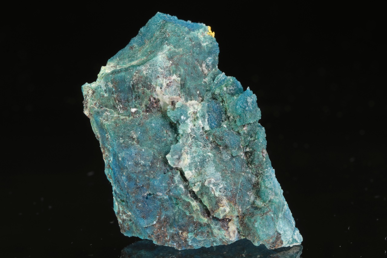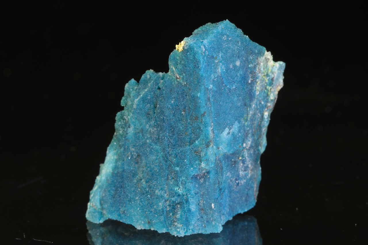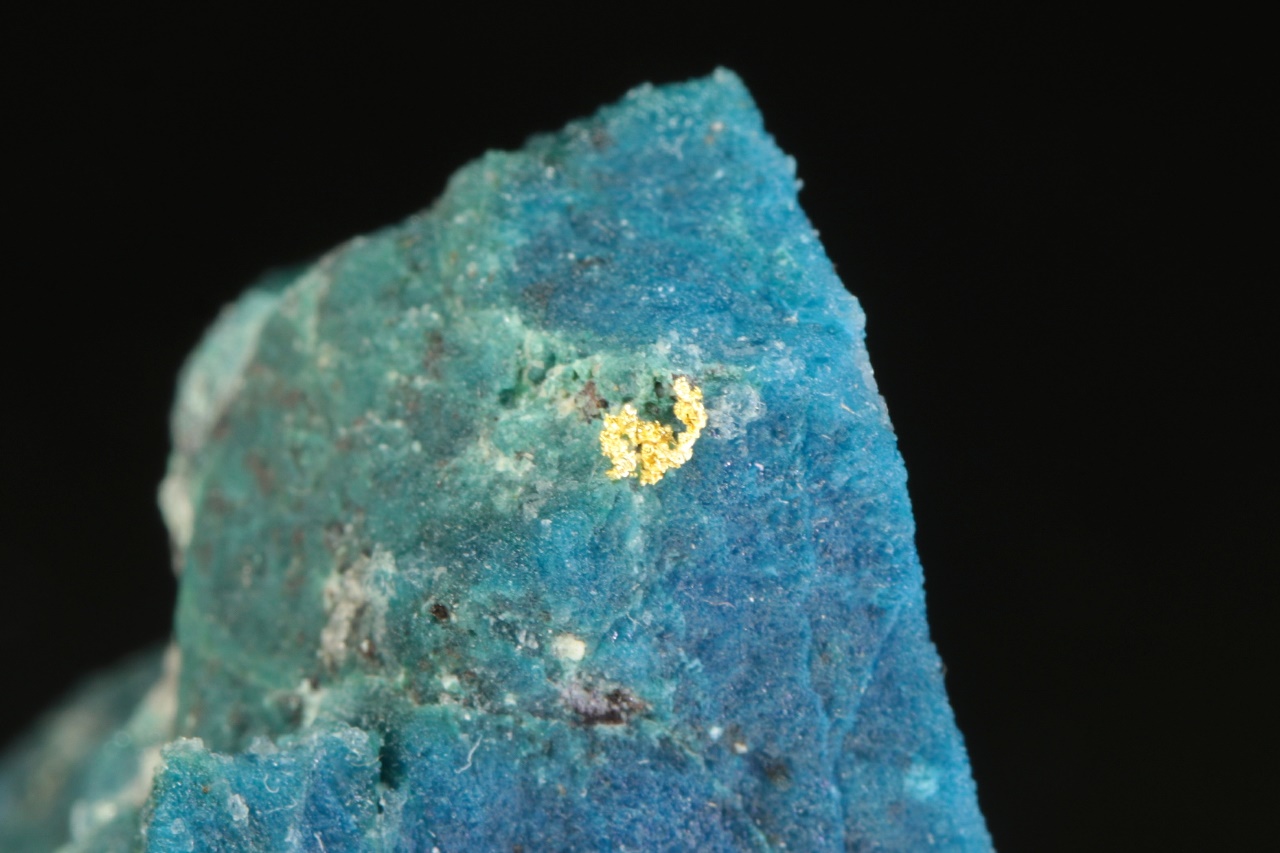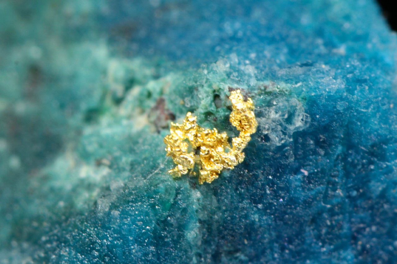 Unusual and very elegant combination of pure gold aggregates in contrasting intensely blue shattuckite of gemstone quality. The gold aggregate is 2 mm in size.