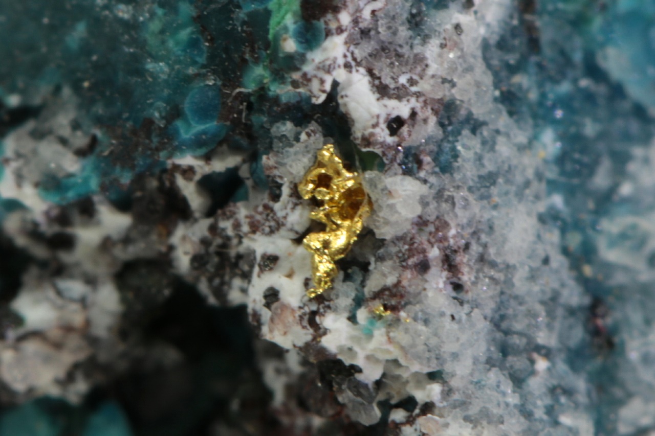 Unusual and very elegant combination of aggregates of pure gold with contrasting blue gem-quality shattuckite. The gold aggregates are approximately 1 mm in size.