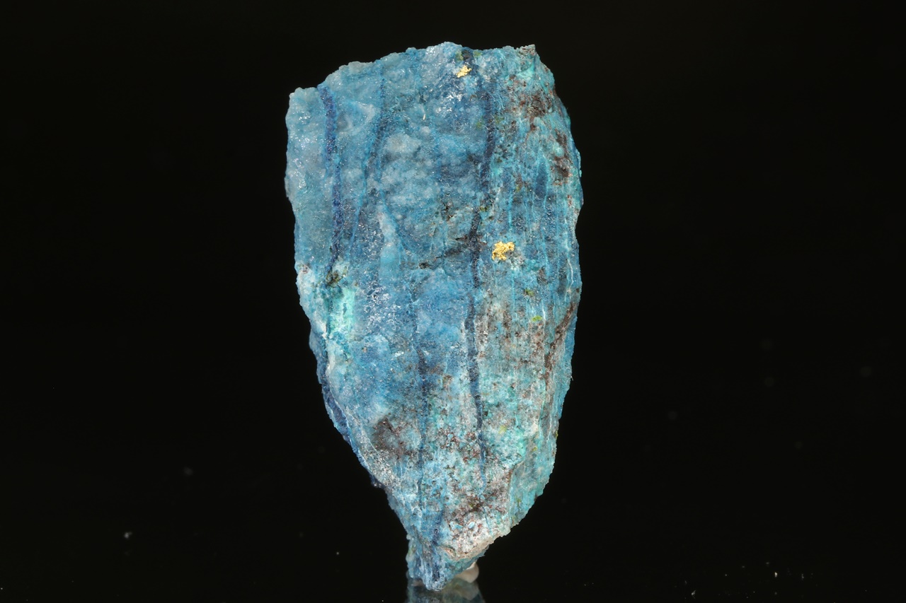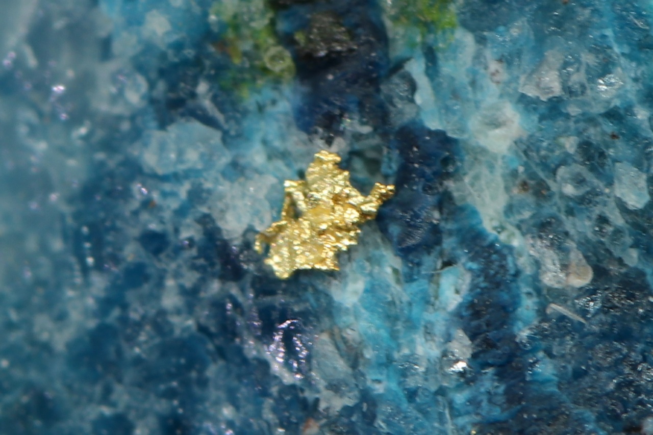 Unusual and very elegant combination of aggregates of native gold in contrasting blue shattuckite of gemstone quality. The gold aggregates are large, 1 and 1.5 mm.