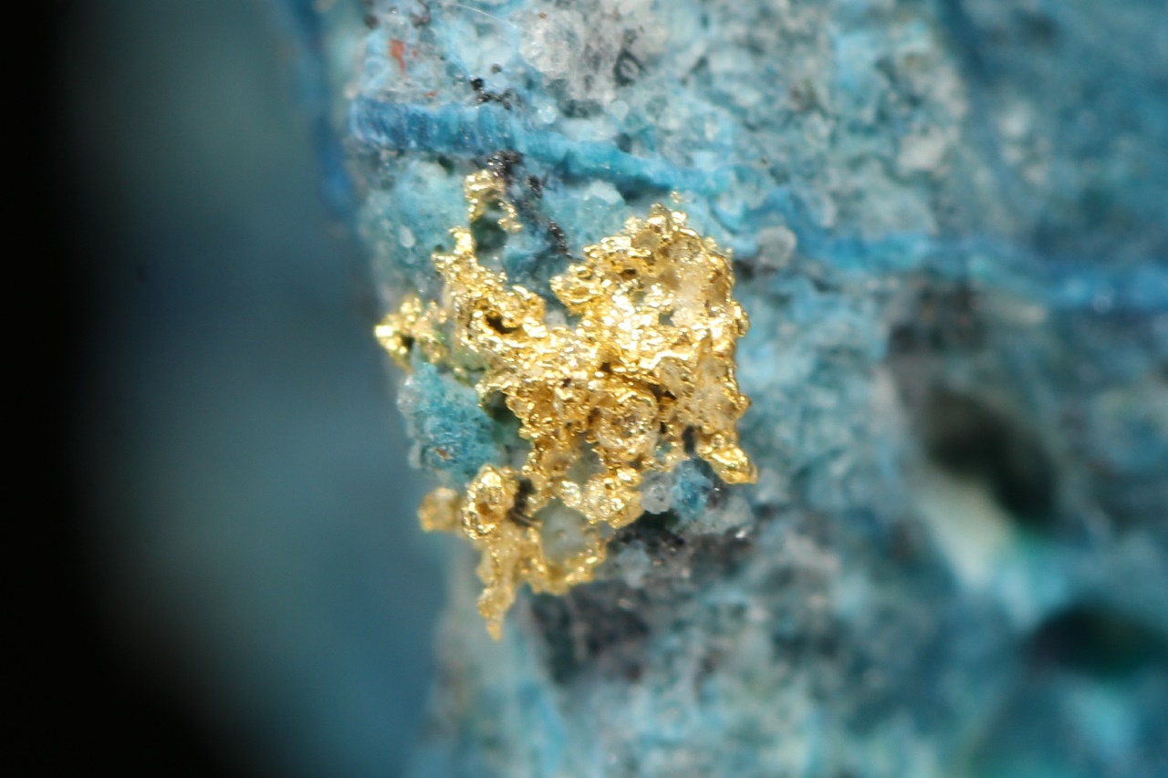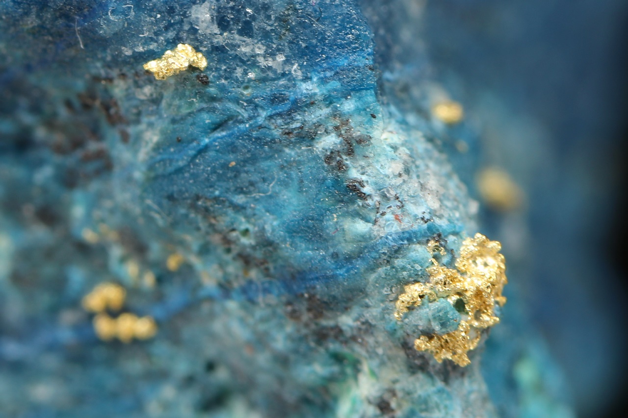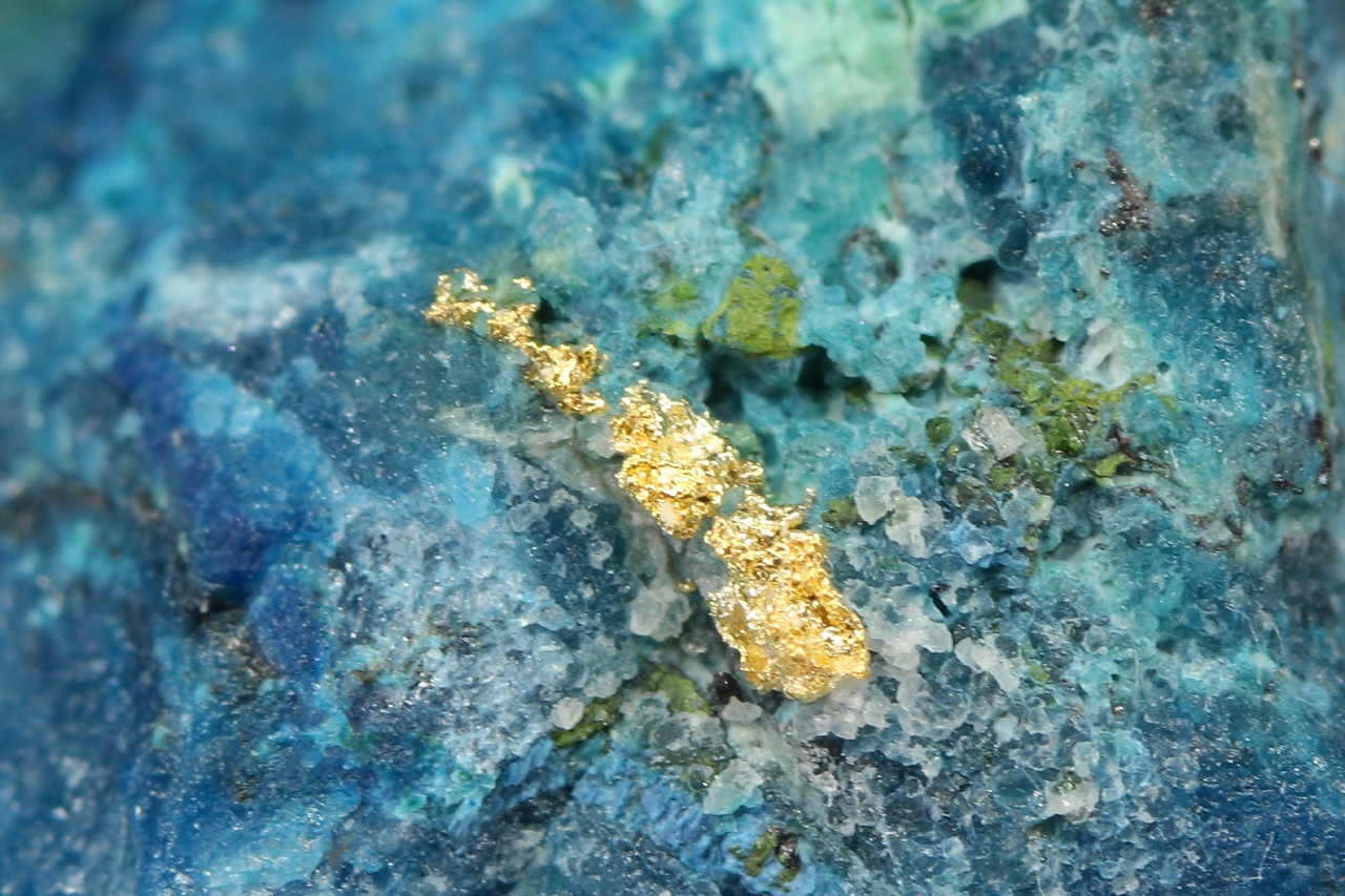 Specimen of intensely blue gem-quality shattuckite, from which pure gold aggregates protrude into the space from all sides. The longest, elongated aggregate (in the upper part of the sample) is 4 mm in size.