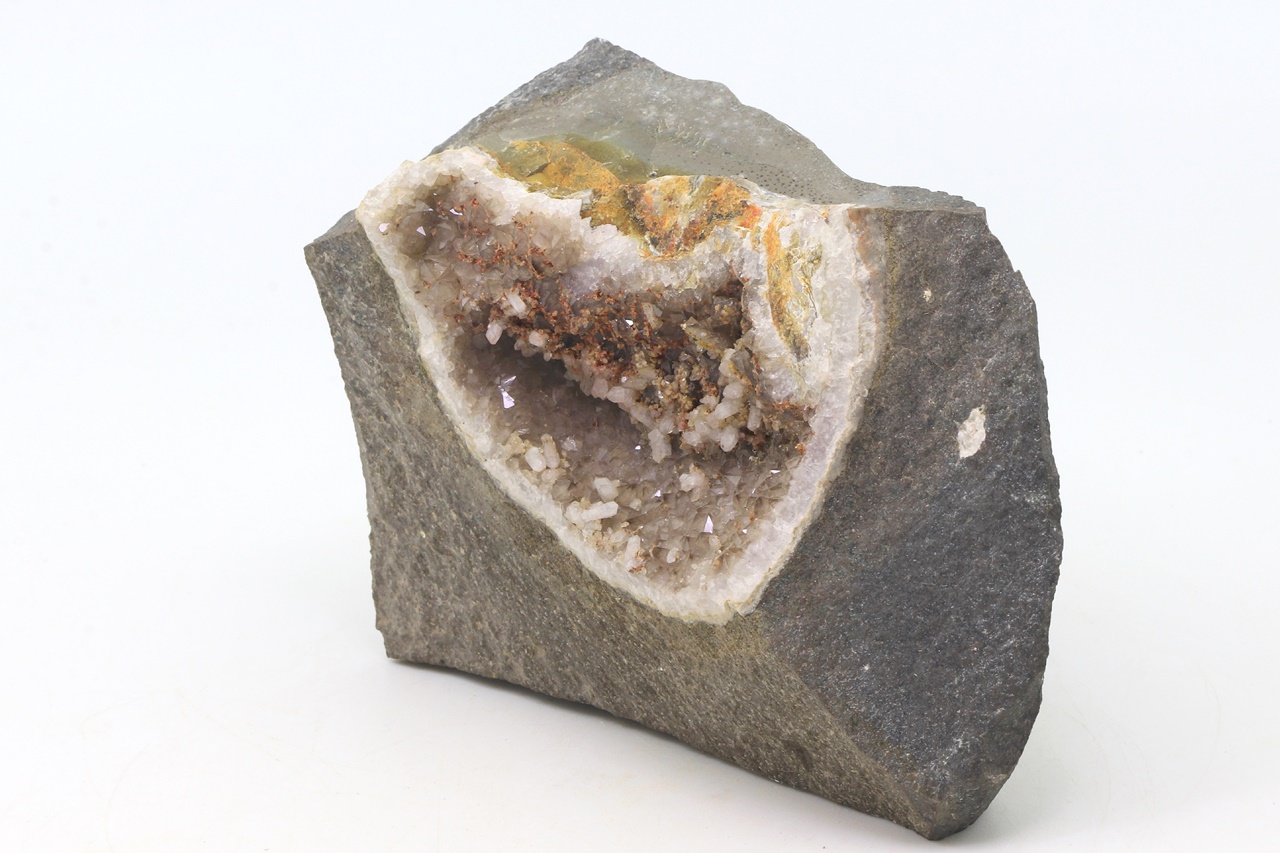 Cavity filled with crystals of quartz (light amethyst) overgrown with white harmotome up to 6 mm in size.