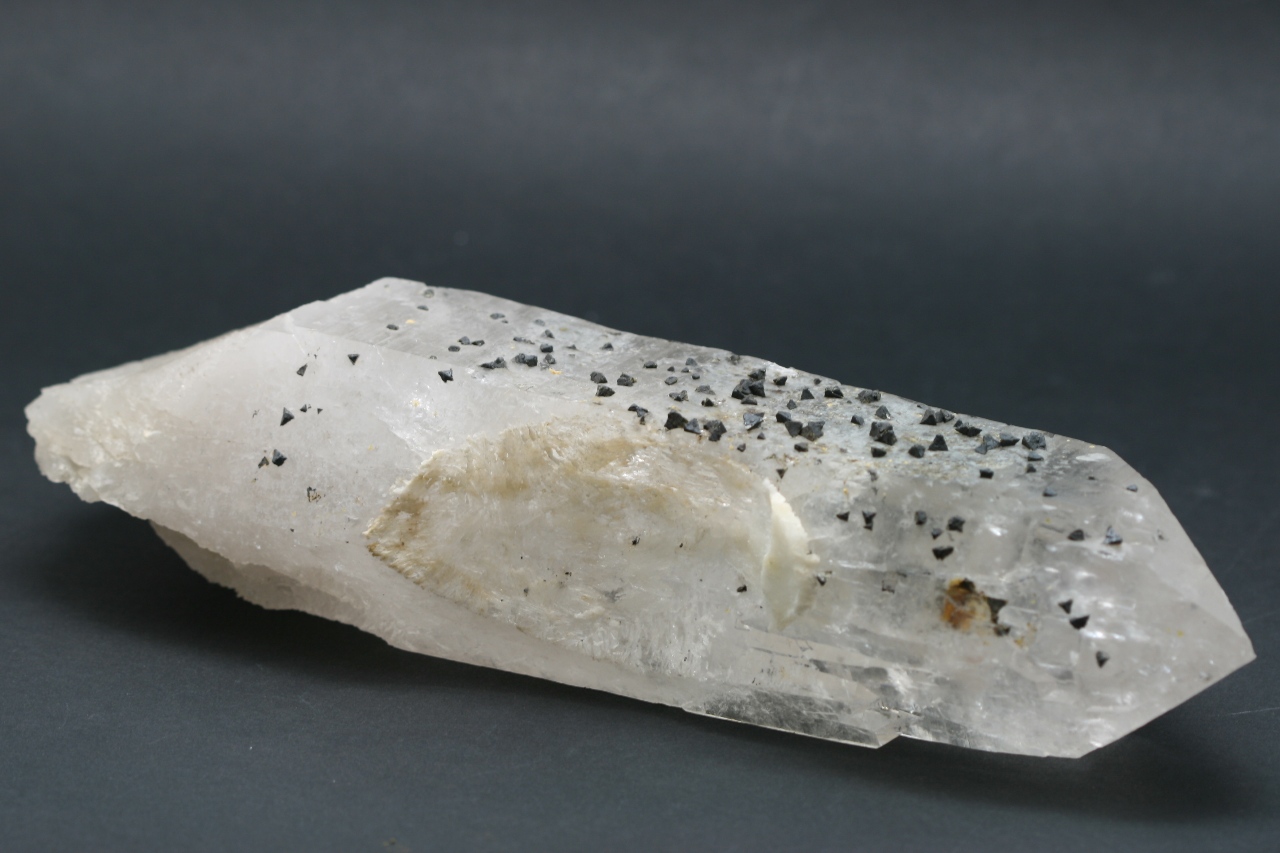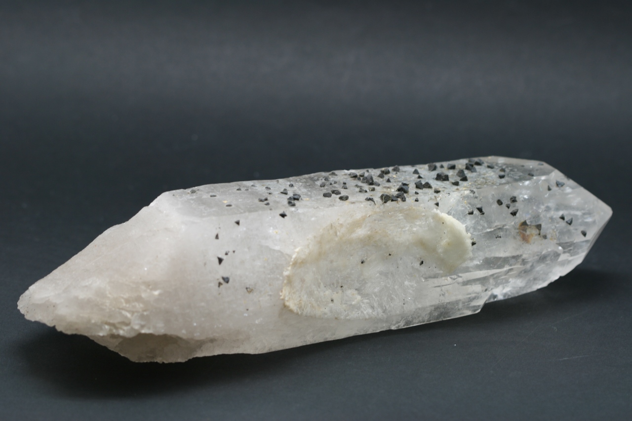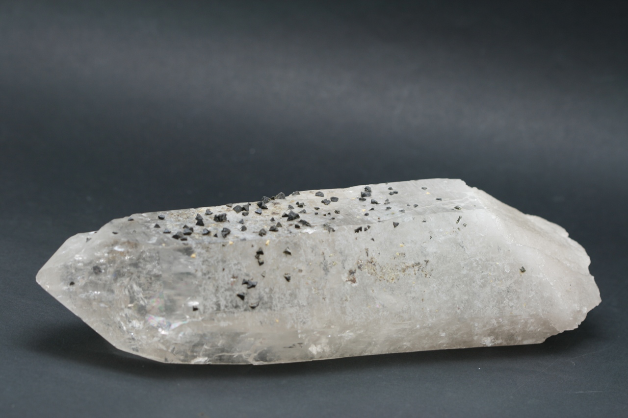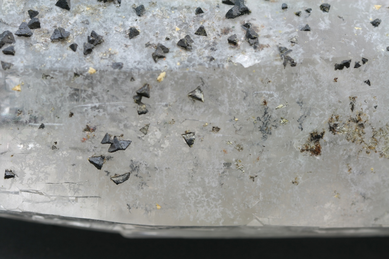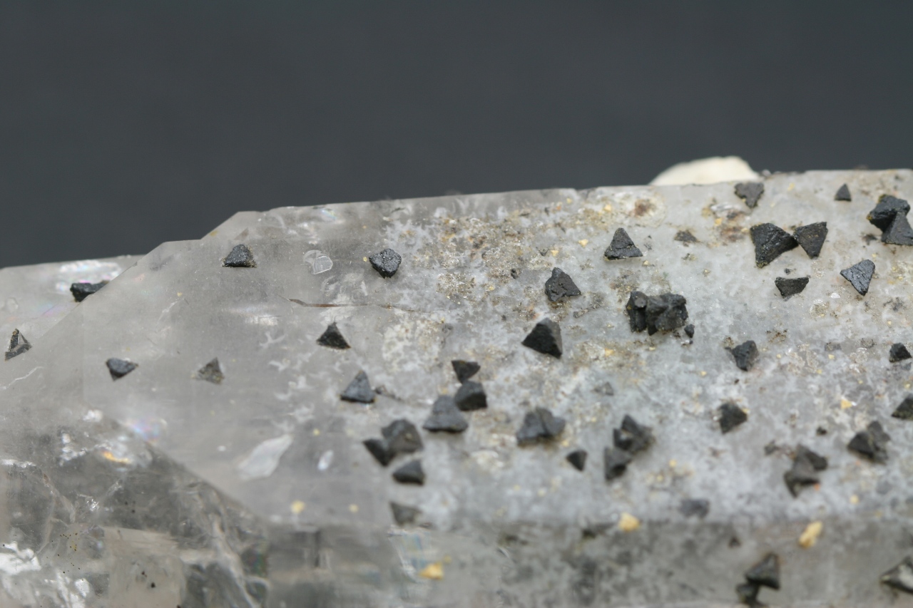 A magnificent example of black tetrahedral crystals of the rare silicate Beryl from Brazil grown on a Rock Crystal.