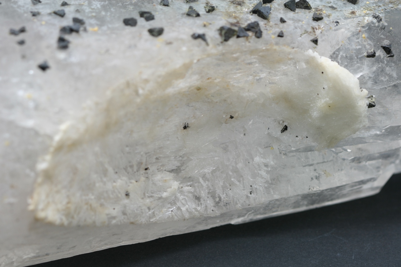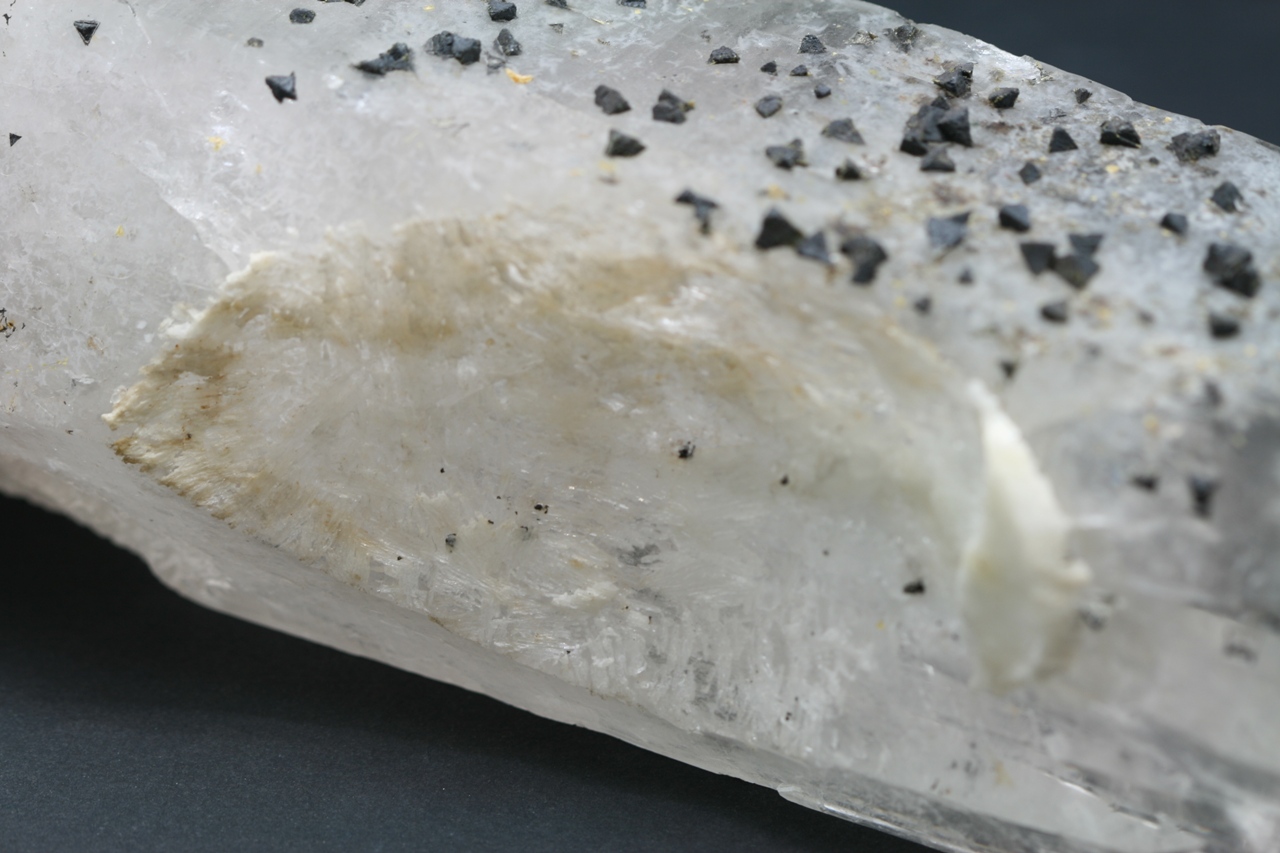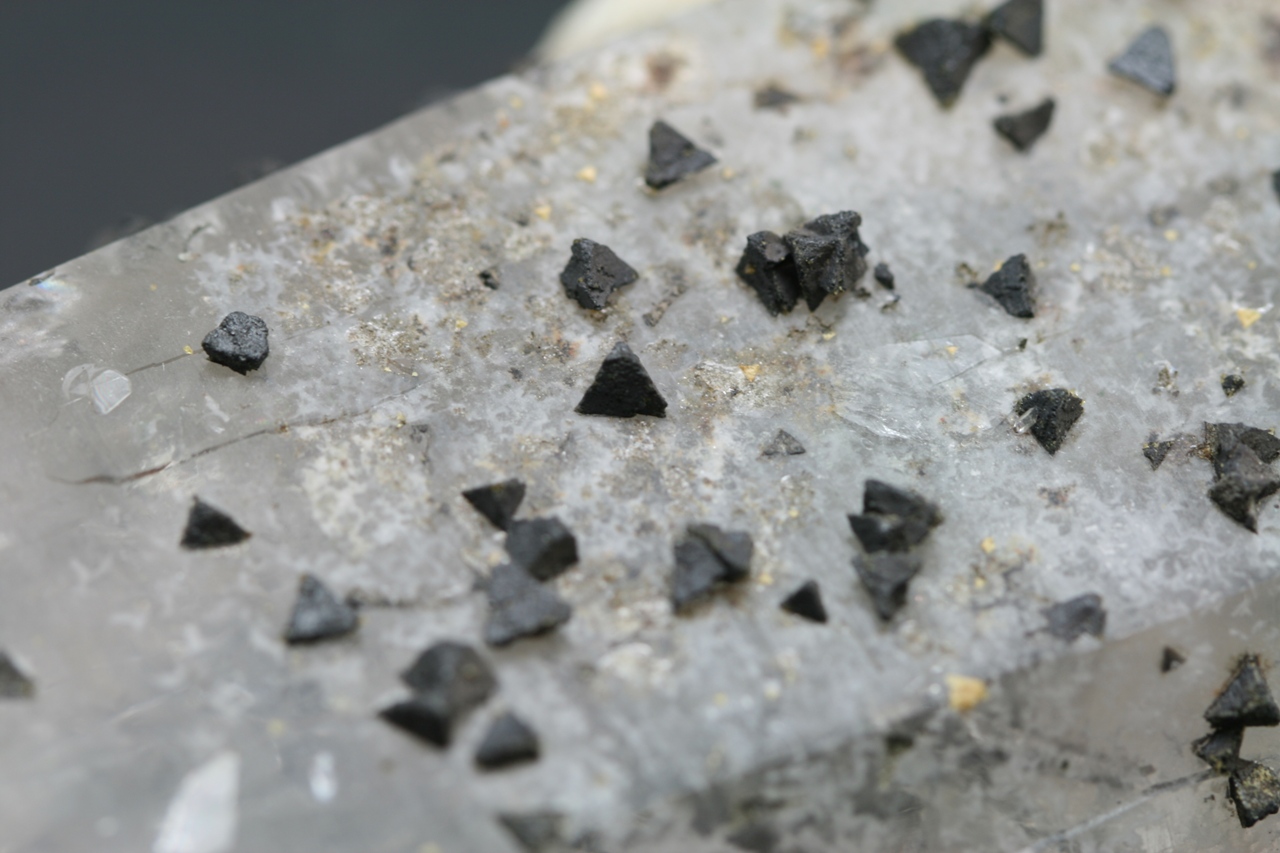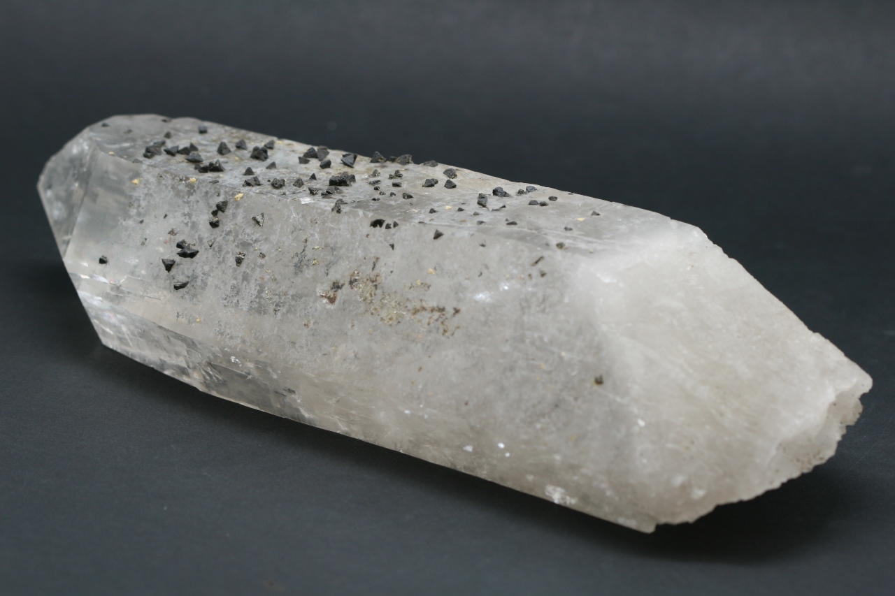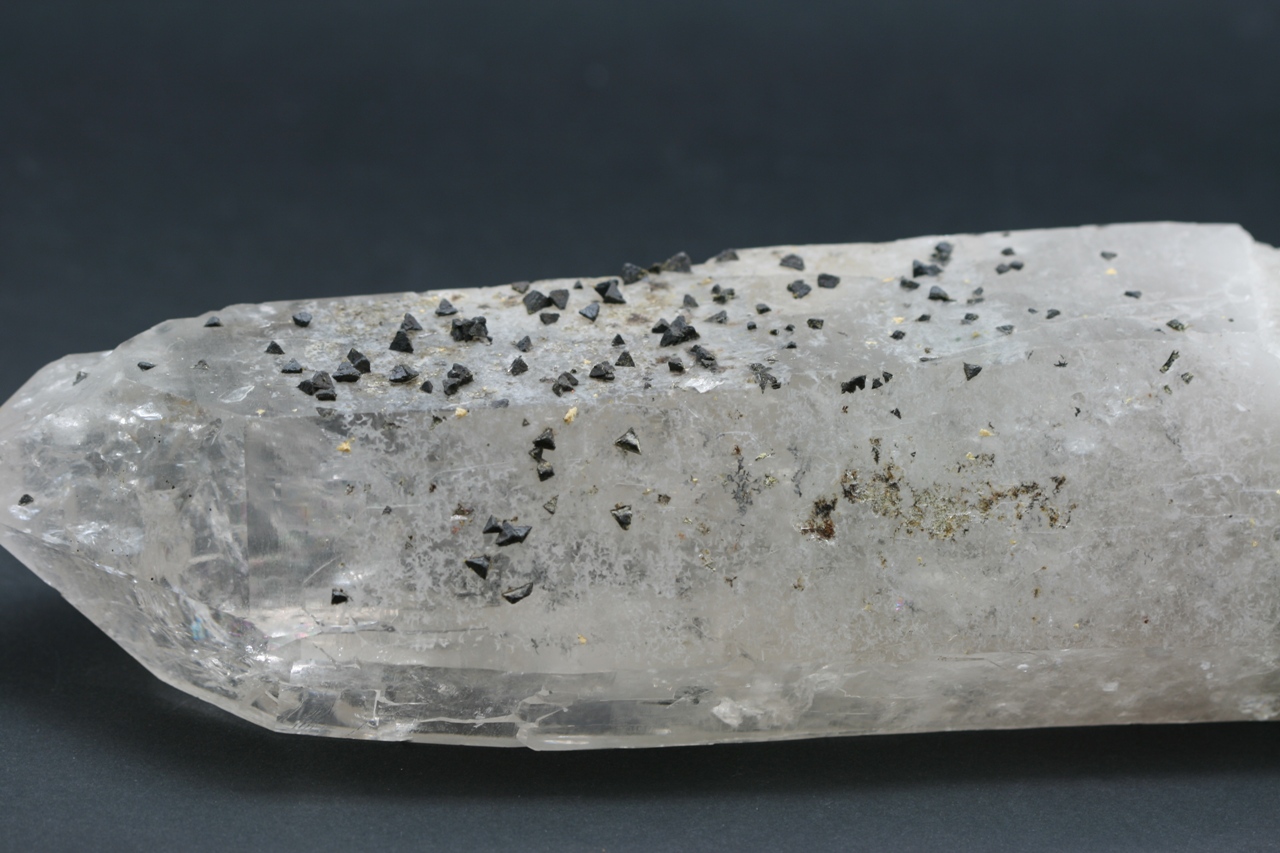 A magnificent example of black tetrahedral crystals of the rare silicate Beryl from Brazil grown on a Rock Crystal.