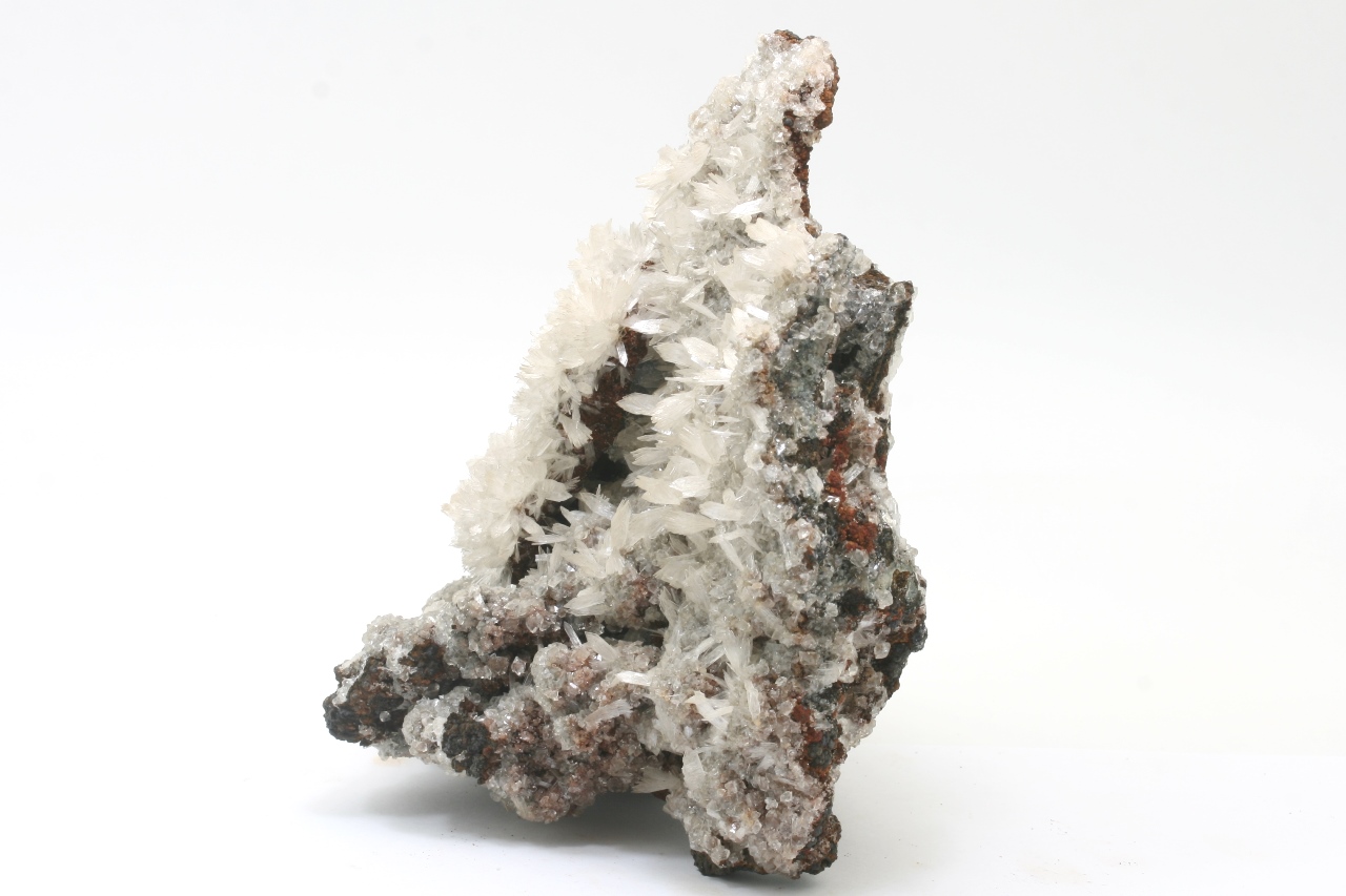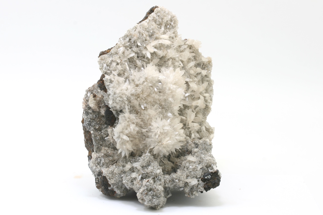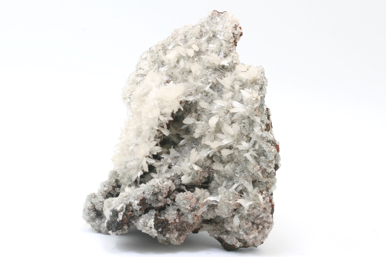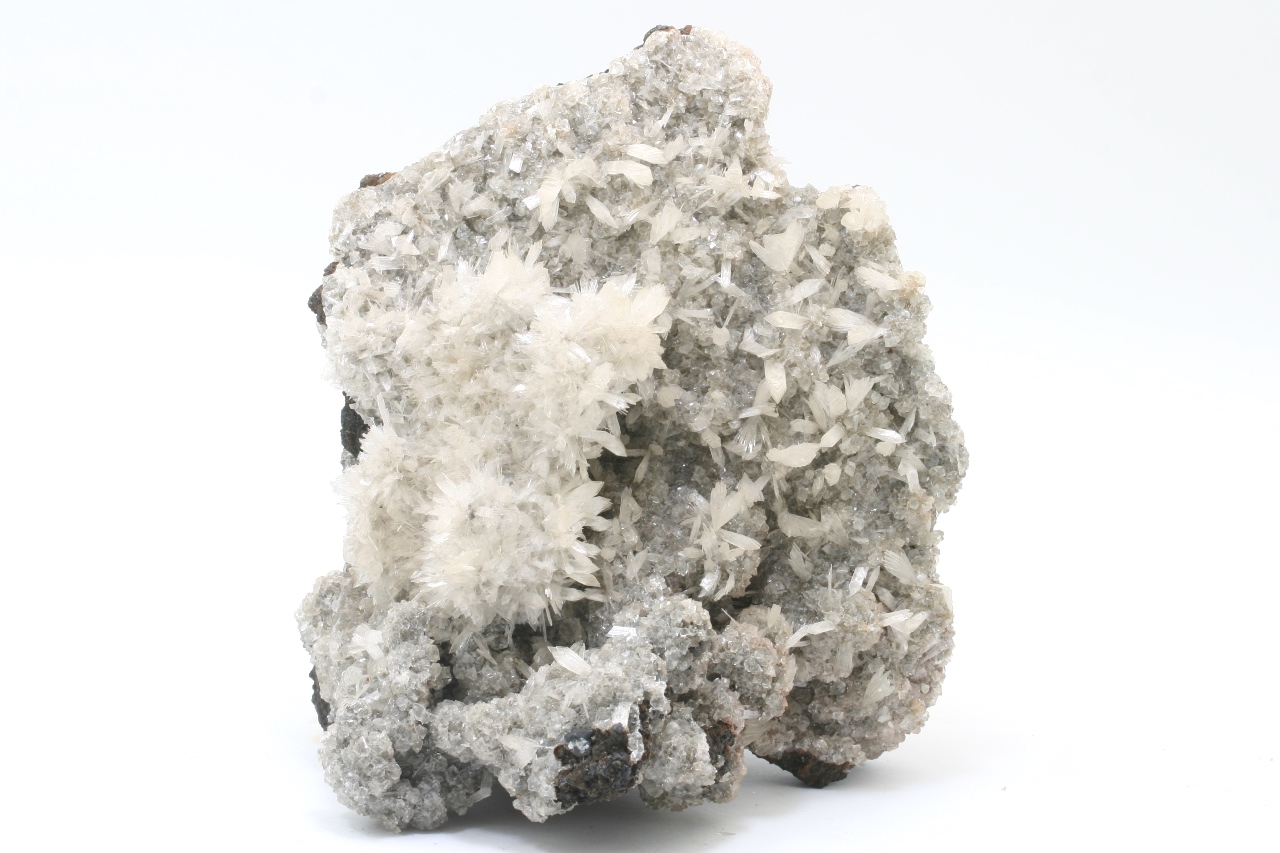 Large, aesthetic specimen of white hemimorphite fans up to 1 cm in size grown on rhombohedra of calcite.