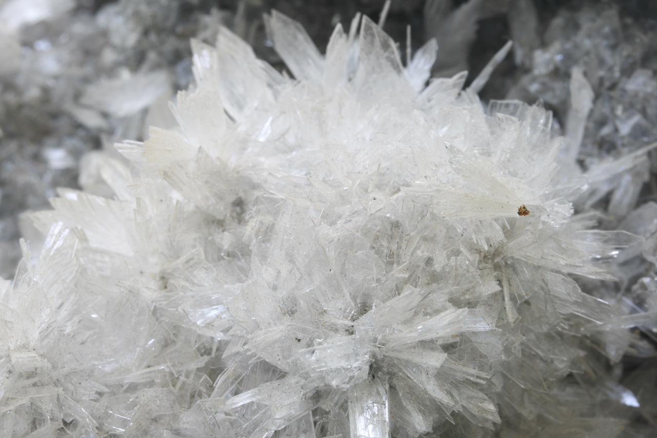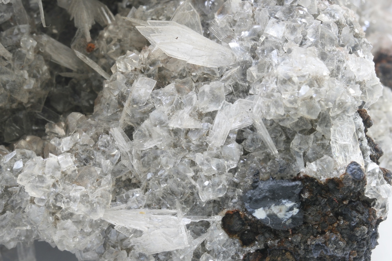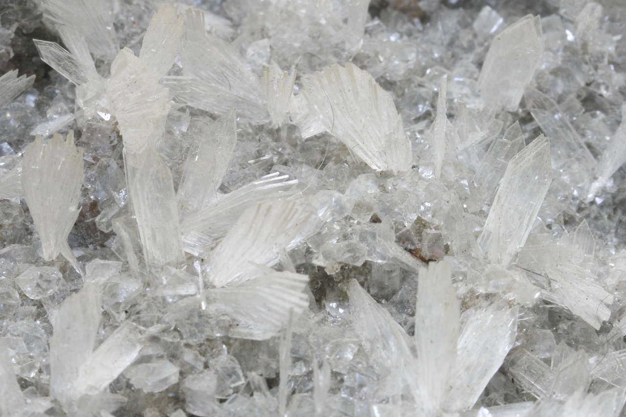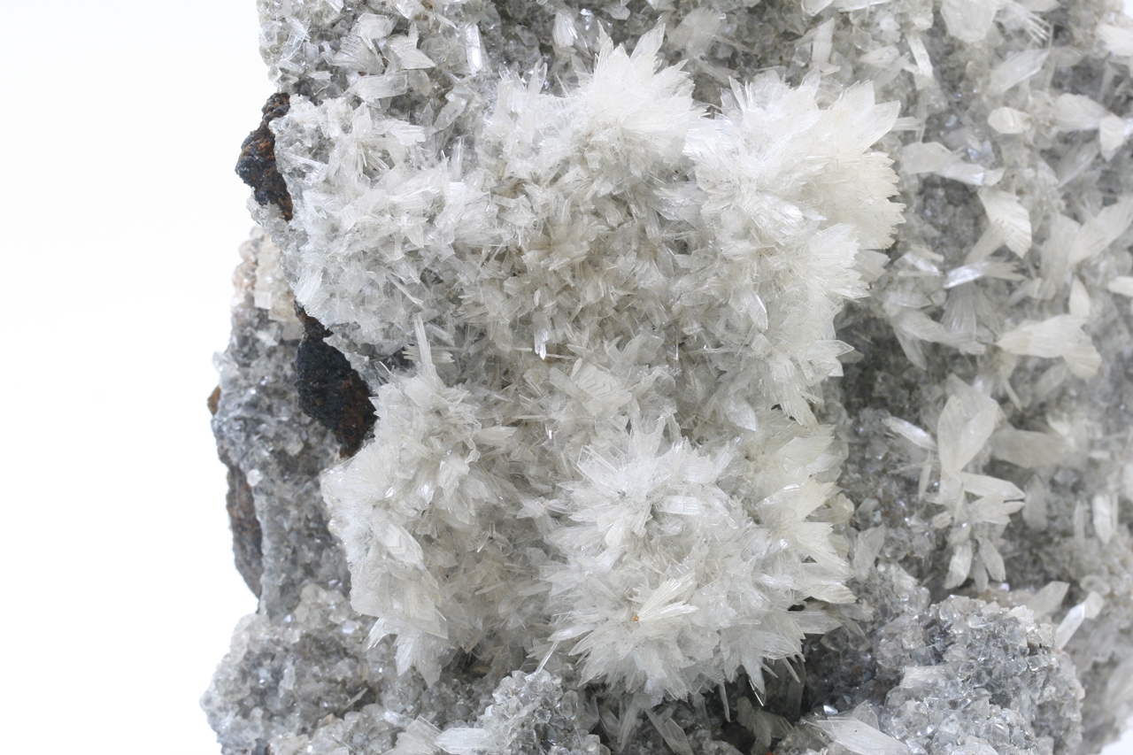Large, aesthetic specimen of white hemimorphite fans up to 1 cm in size grown on rhombohedra of calcite.
