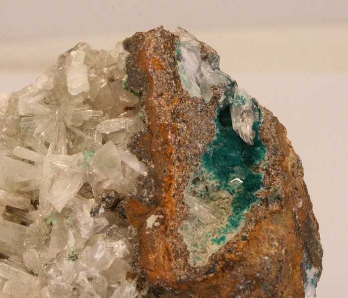 White tabular hemimorphite crystals with spherical aggregates of rosasite. The size of the hemimorphite crystals is 1 to 1.5 cm .