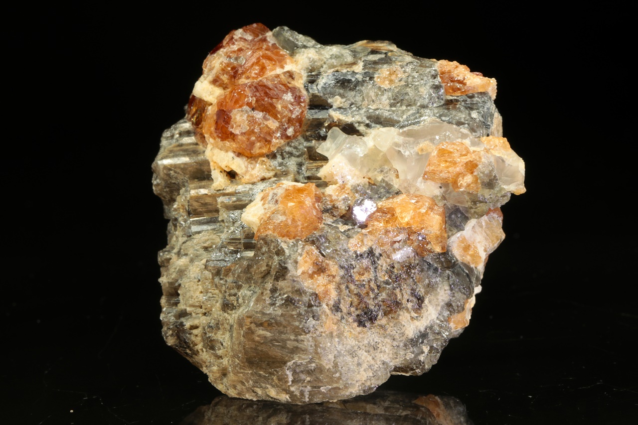 Cluster of lustrous brownish-orange hessonite crystals in gray diopside. The largest crystal is 12 mm in size.