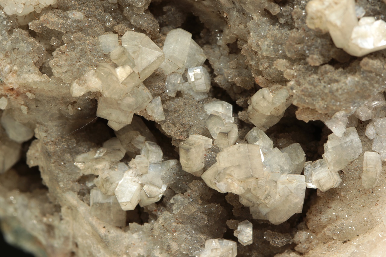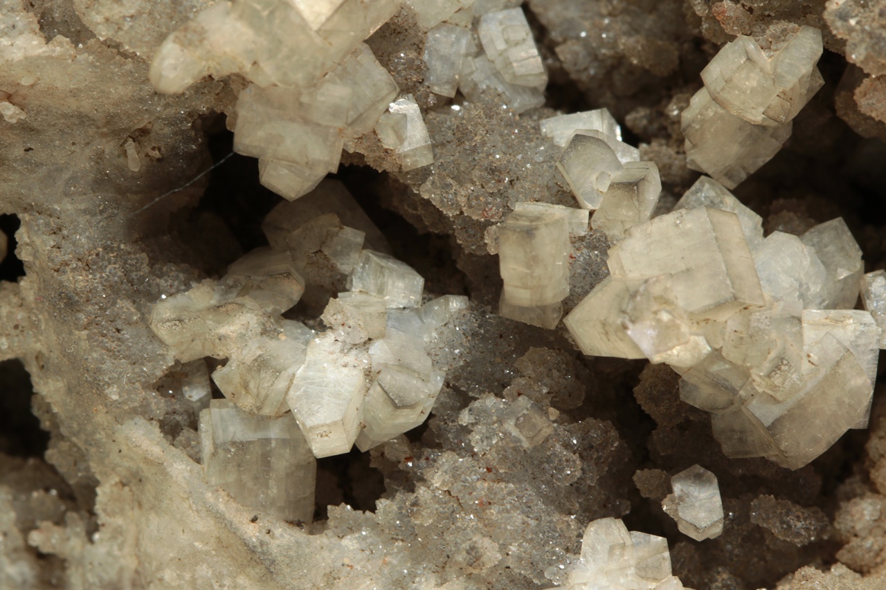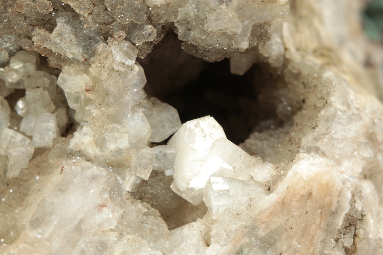 Bílé, perleťově lesklé krystaly heulanditu až 4 mm velké narostlé v křemenné dutině.