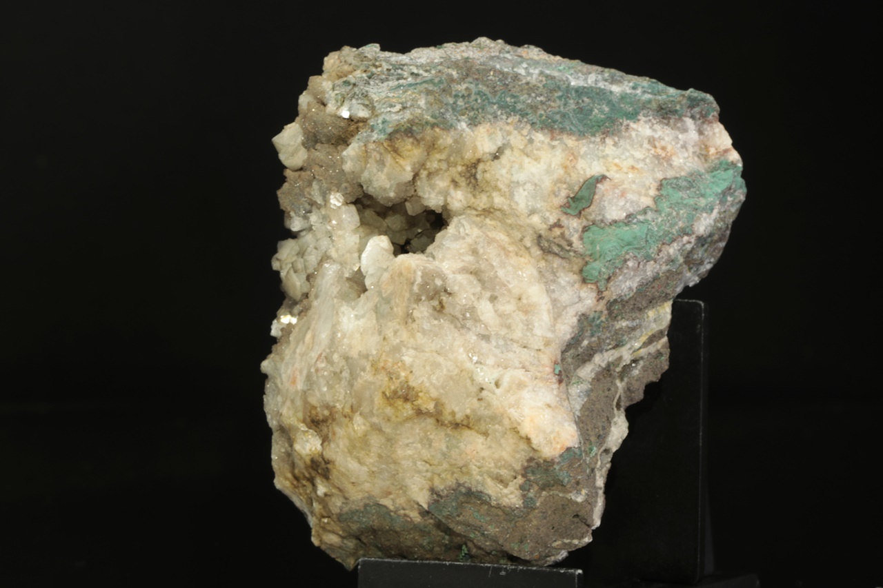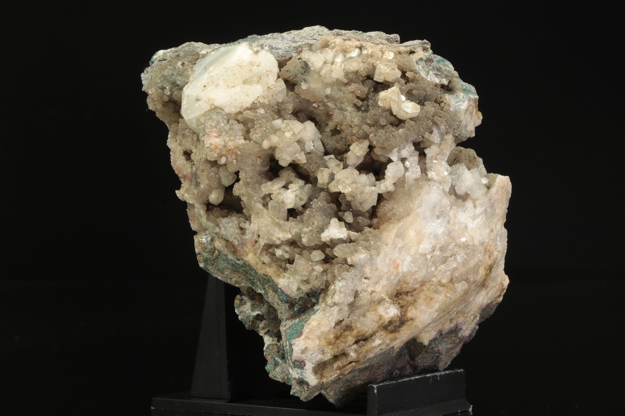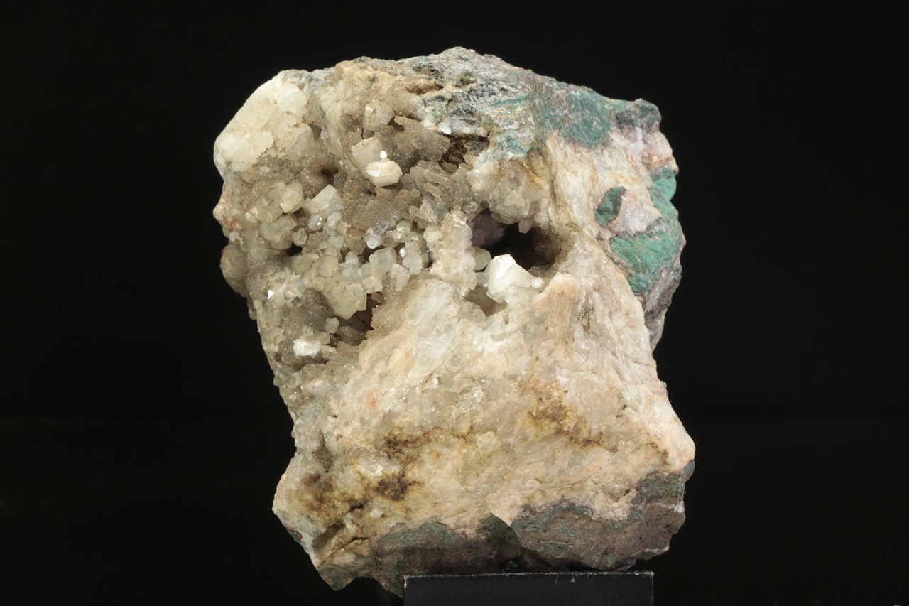 Bílé, perleťově lesklé krystaly heulanditu až 4 mm velké narostlé v křemenné dutině.