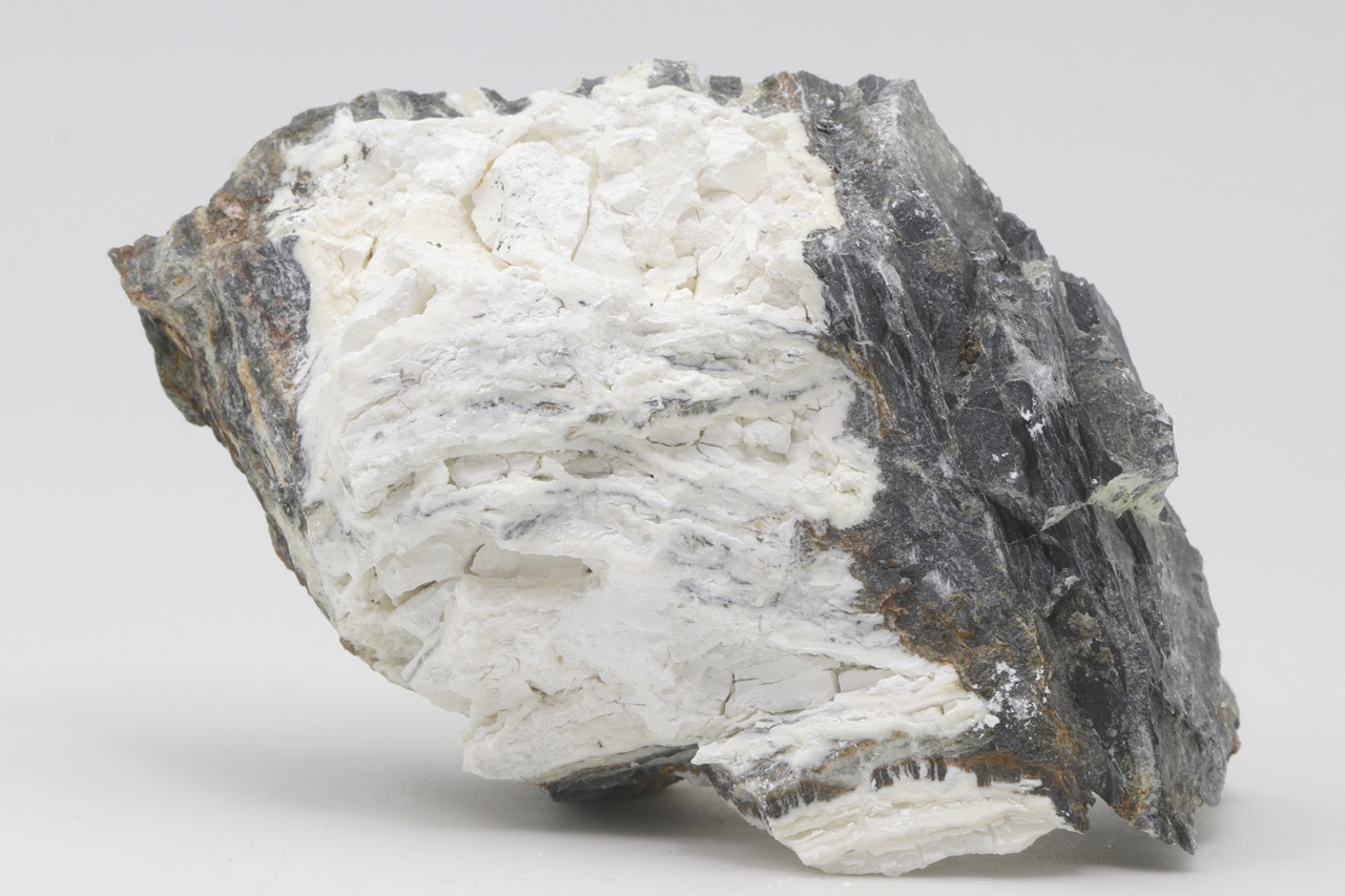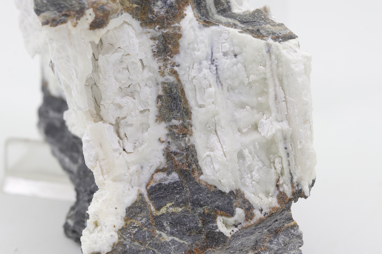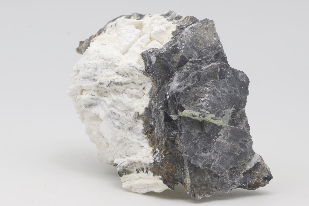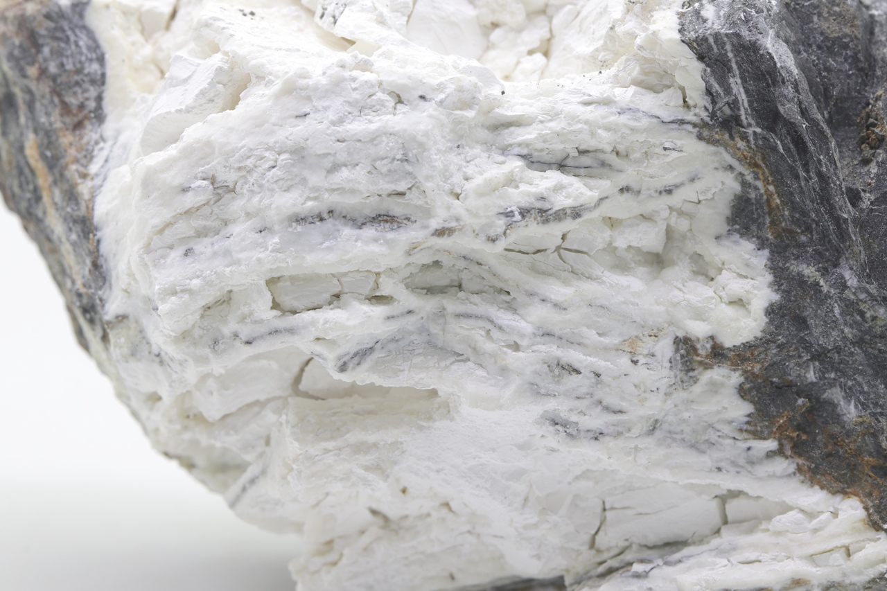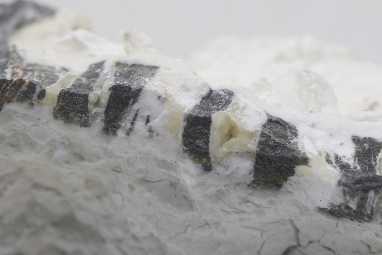 Křídově bílý huntit narostlý na světle žlutém aragonitu.