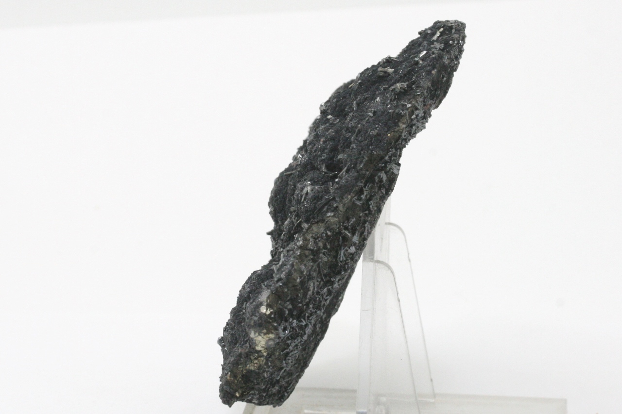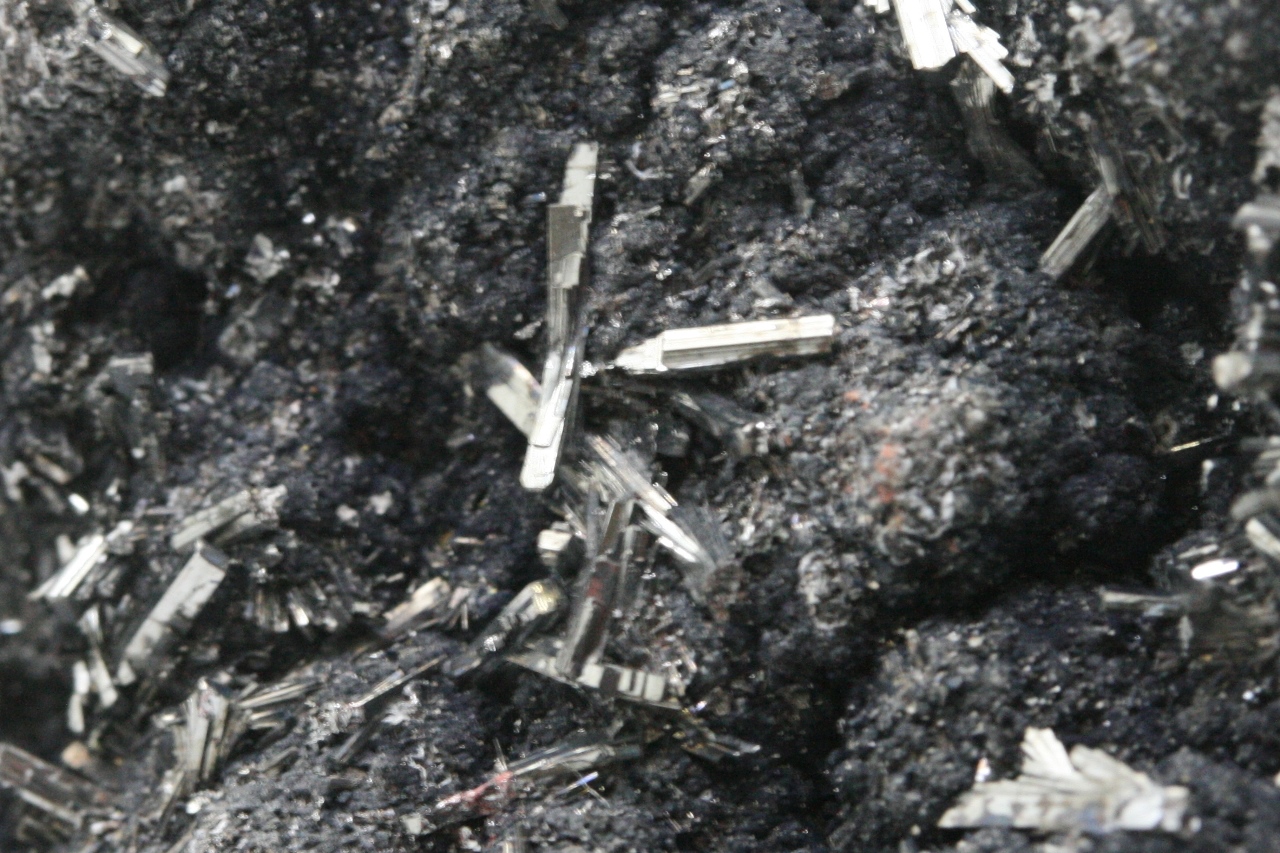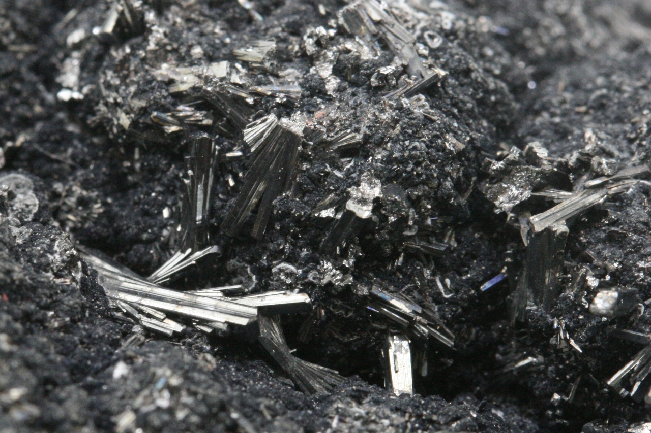 Collection Specimen of unusually large black crystals of hutchinsonite. This thallium, arsenic, and lead sulfide is known from only about eight localities worldwide. The largest crystals are up to 6 mm in size.
