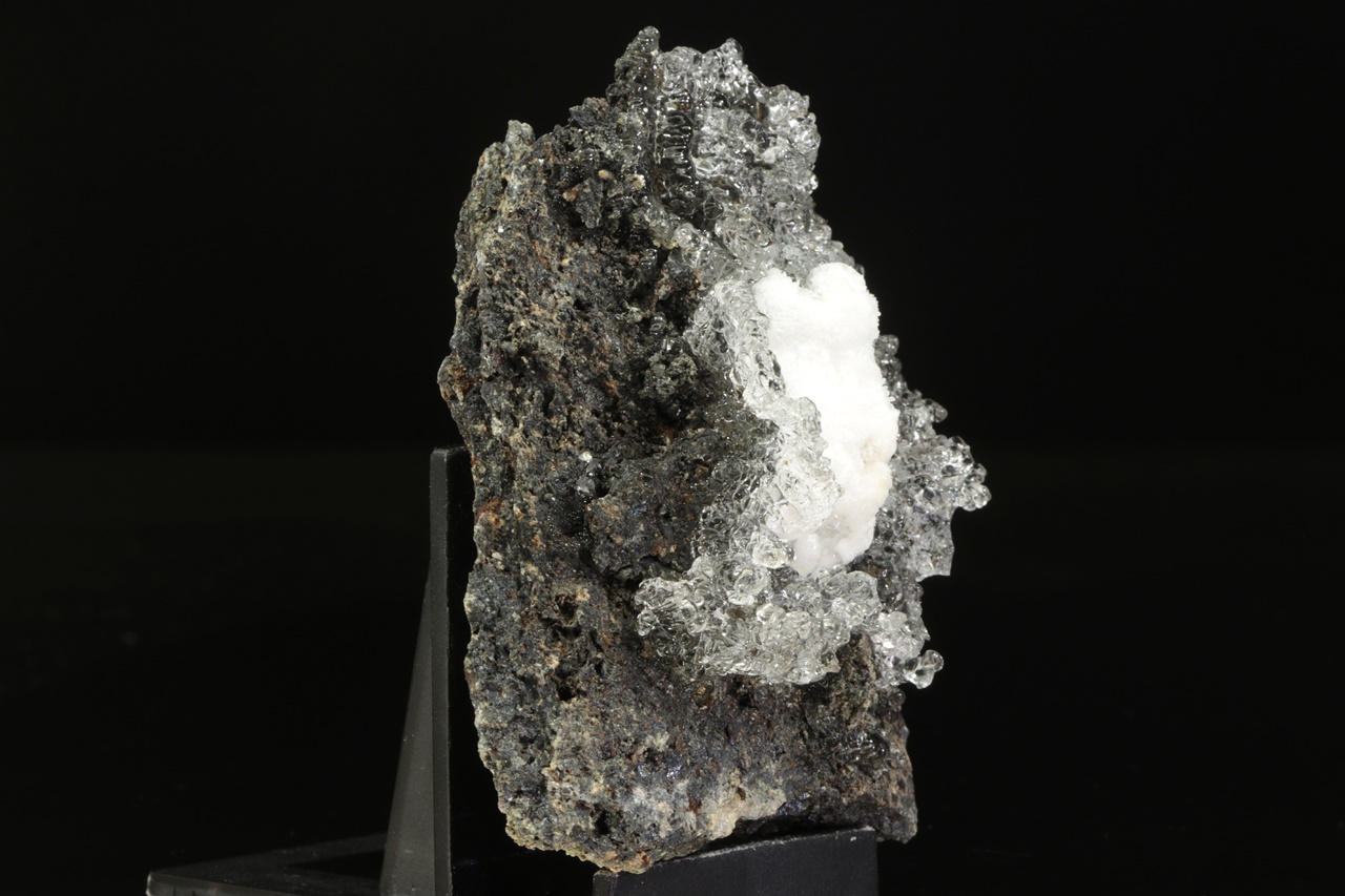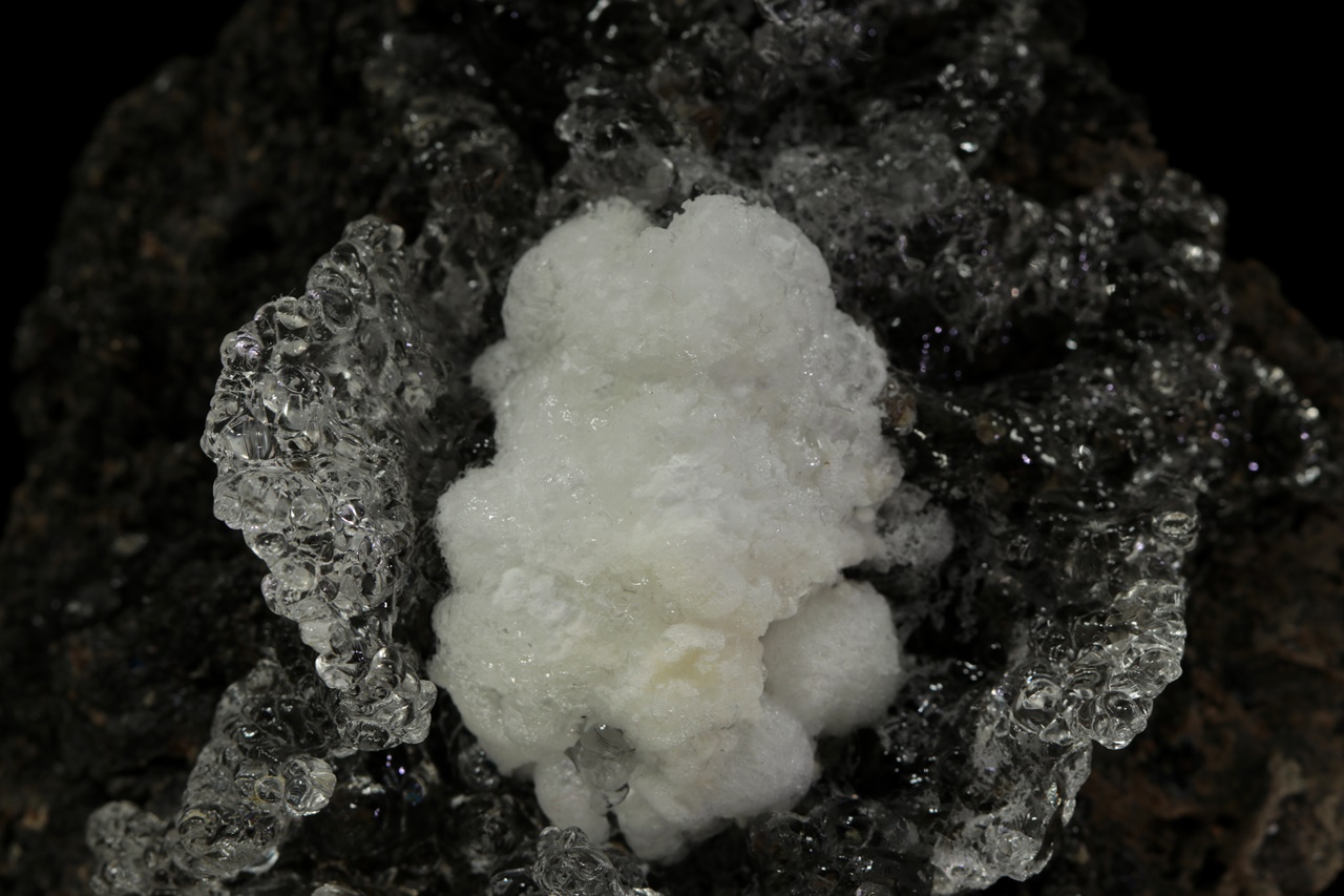 Beautiful crown of clear opal on dark creating the impression of a splashed water surface. The crown is lightly damaged in two places at the bottom right. The sample glows green under UV.