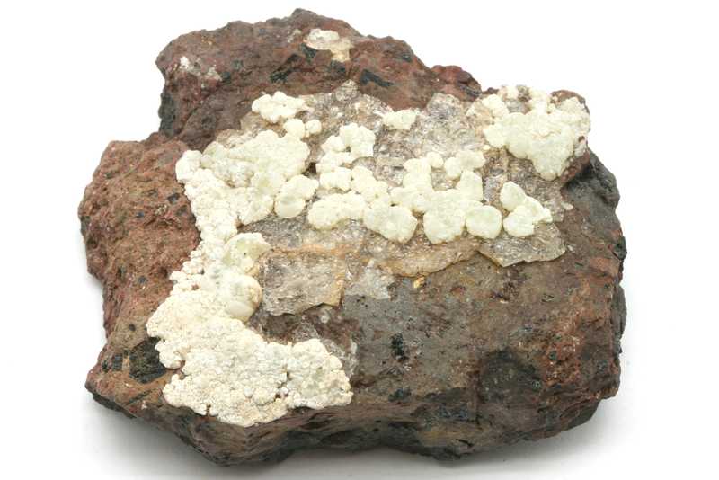 Specimen of volcanic rock with transparent hyalite and white apatite aggregates with a historical label from 1956. Specimen covered with amorphous aggregates and crusts of vitreous opal with apatite from a classic global locality.