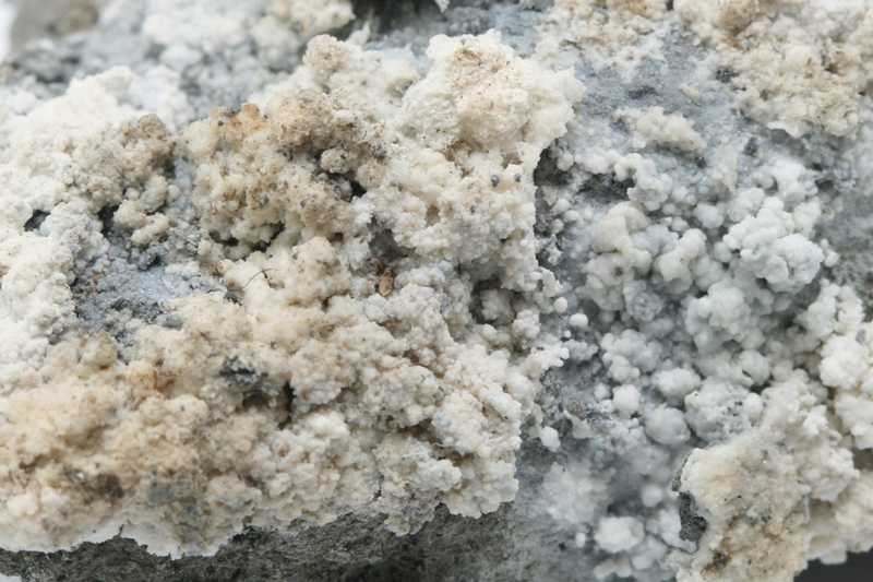 White aggregates of magnesium carbonate. Several mm large reniform aggregates of hydromagnesite.
