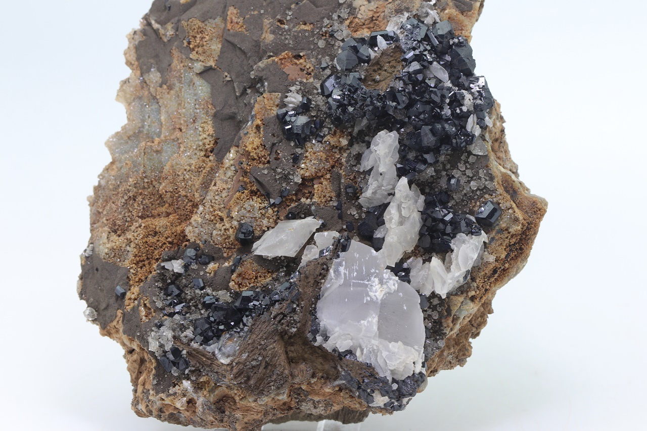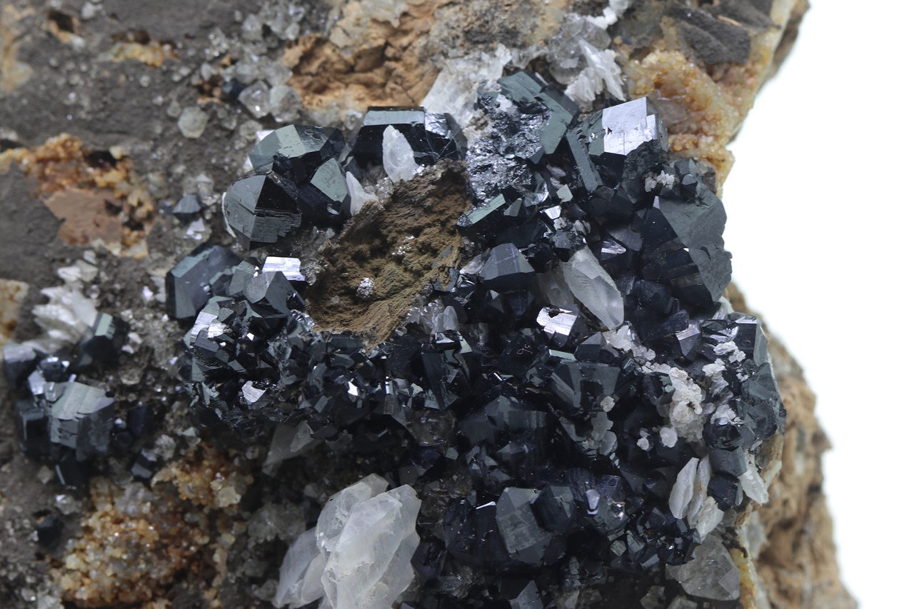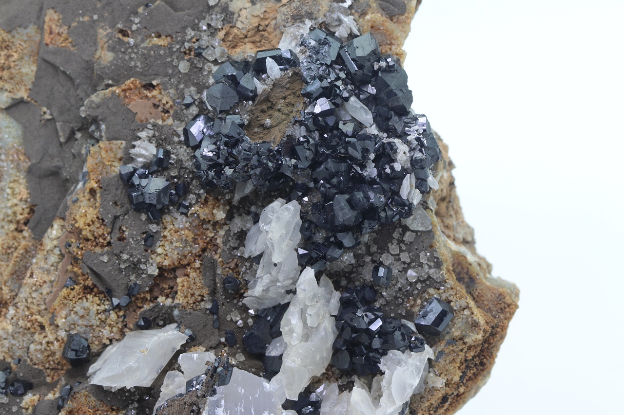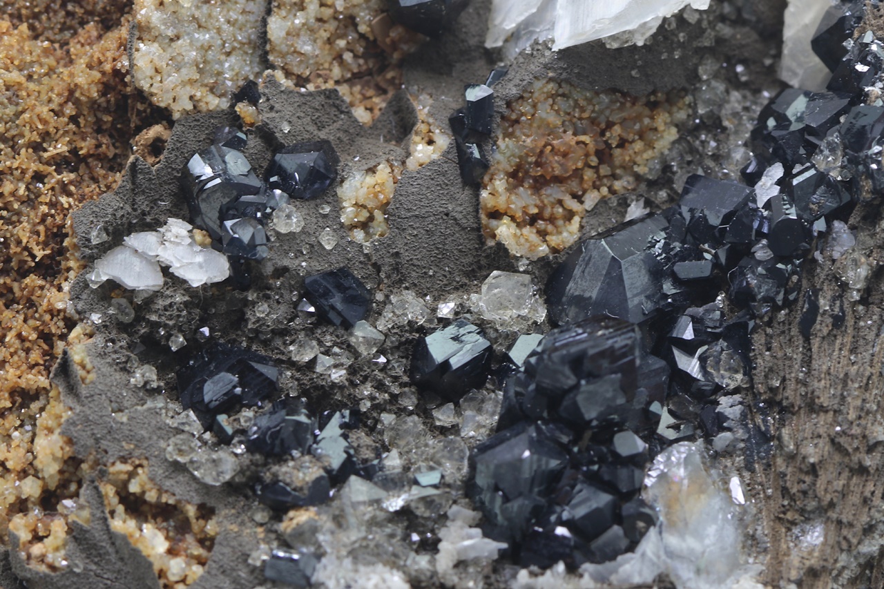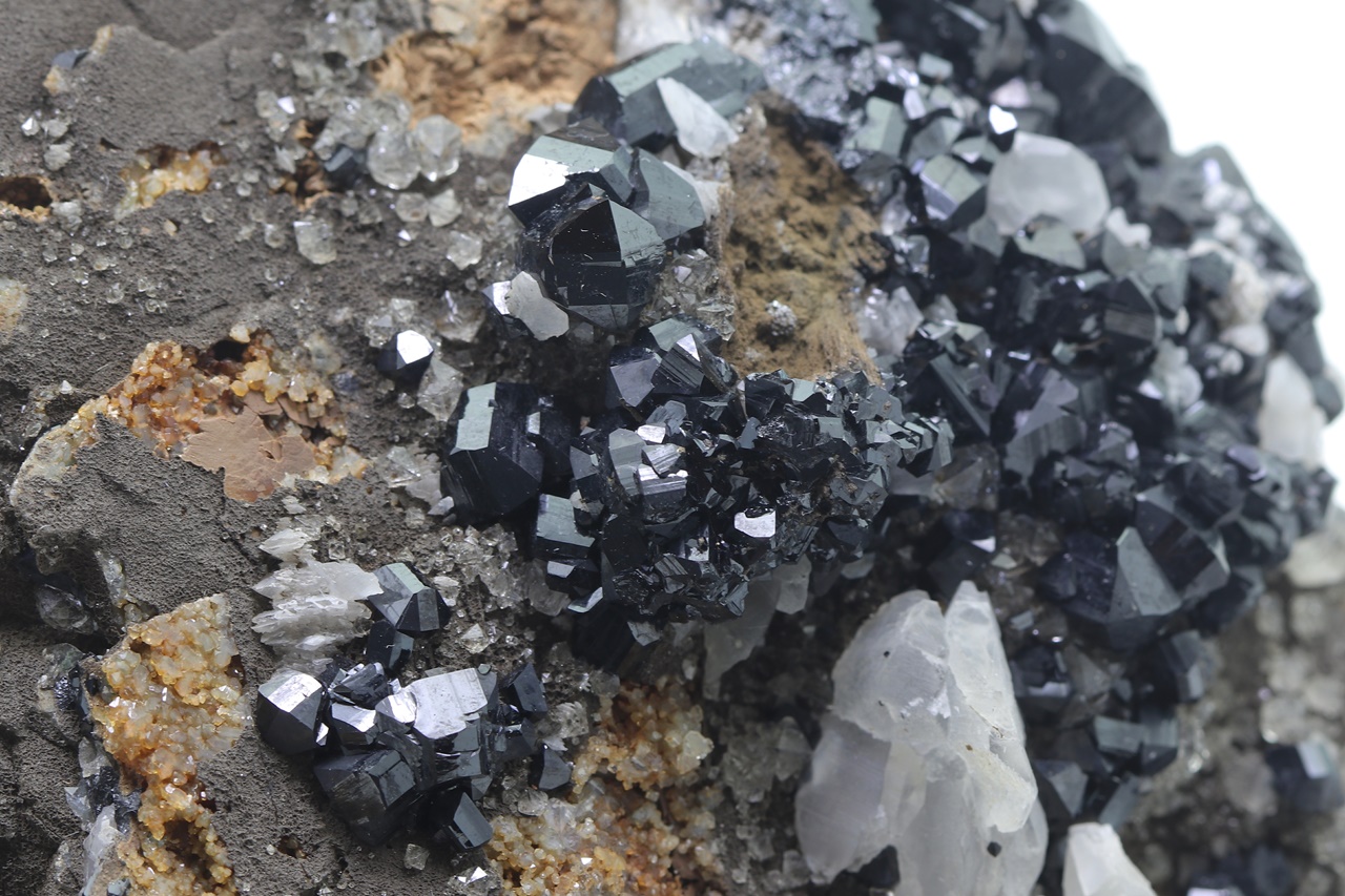 Rich specimen of black, very lustrous ilvaite crystals with white calcite grown on radial aggregates of massive hedenbergite. The largest ilvaite crystal is 7 mm long, co-type locality of ilvaite .