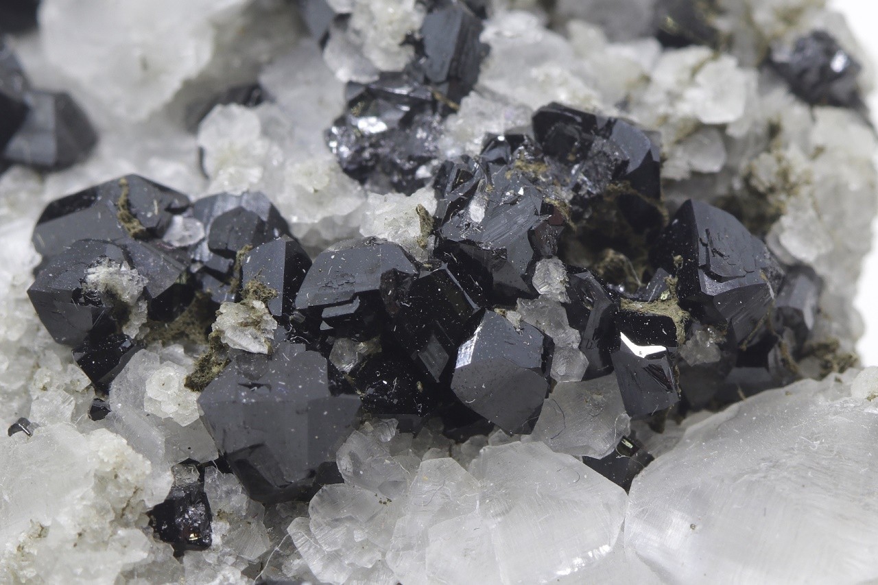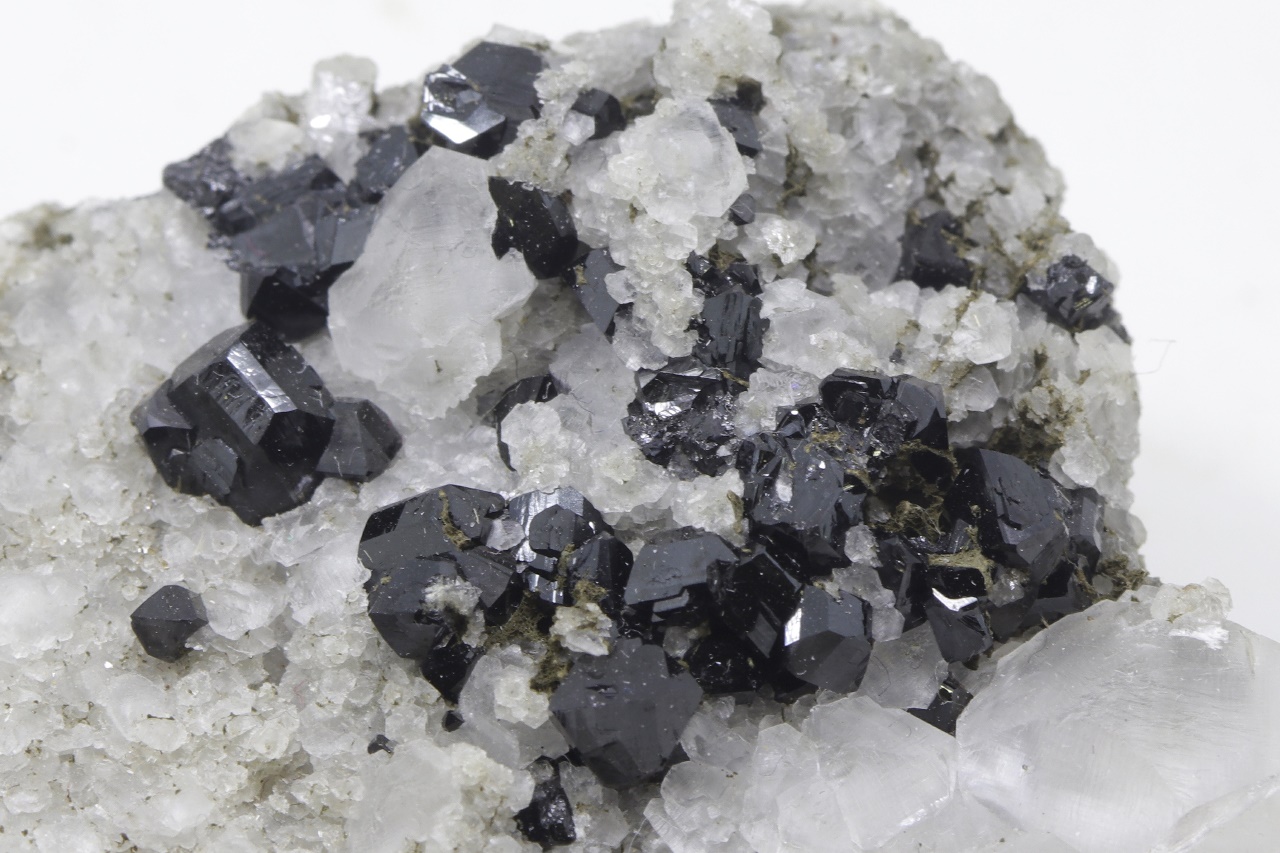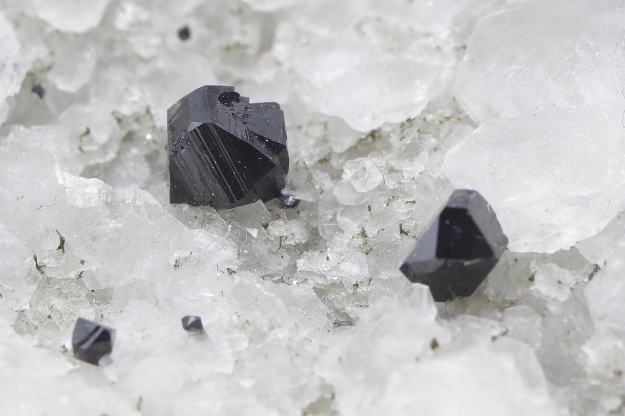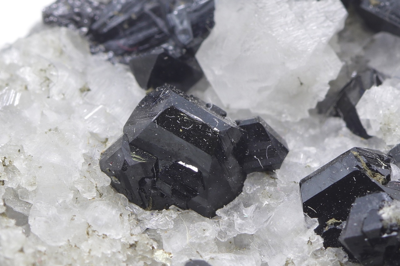 A druse of black, highly lustrous Elbaite crystals grown on a contrasting white Calcite. The largest Elbaite crystal is 5 mm in size .