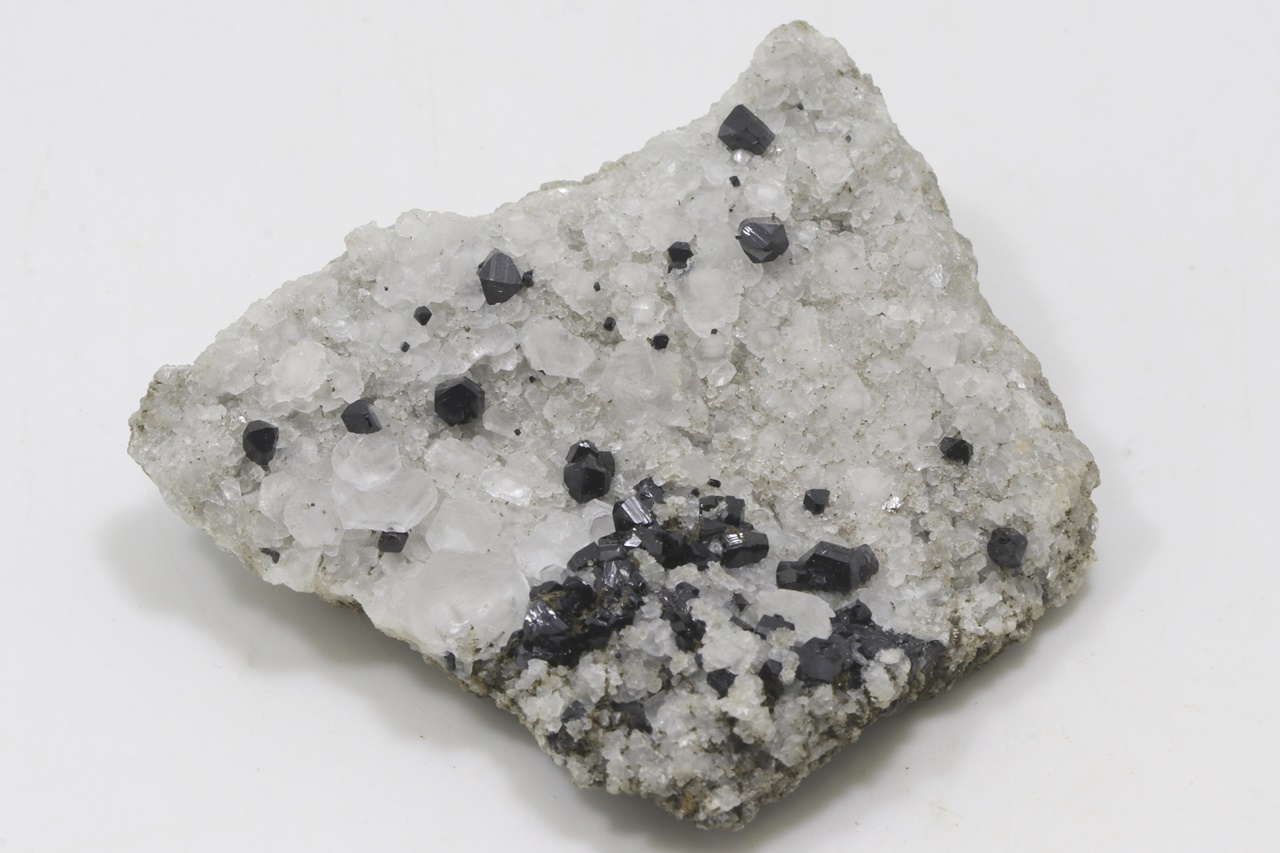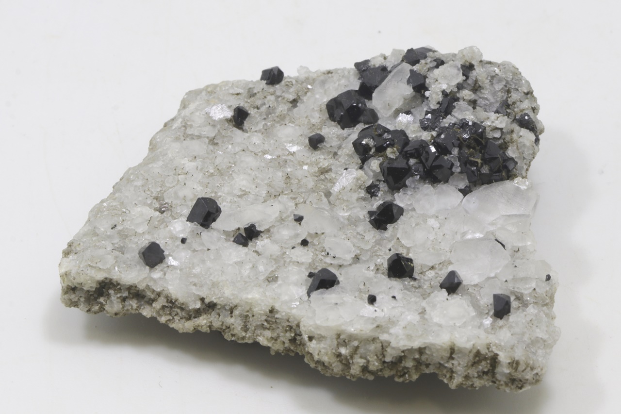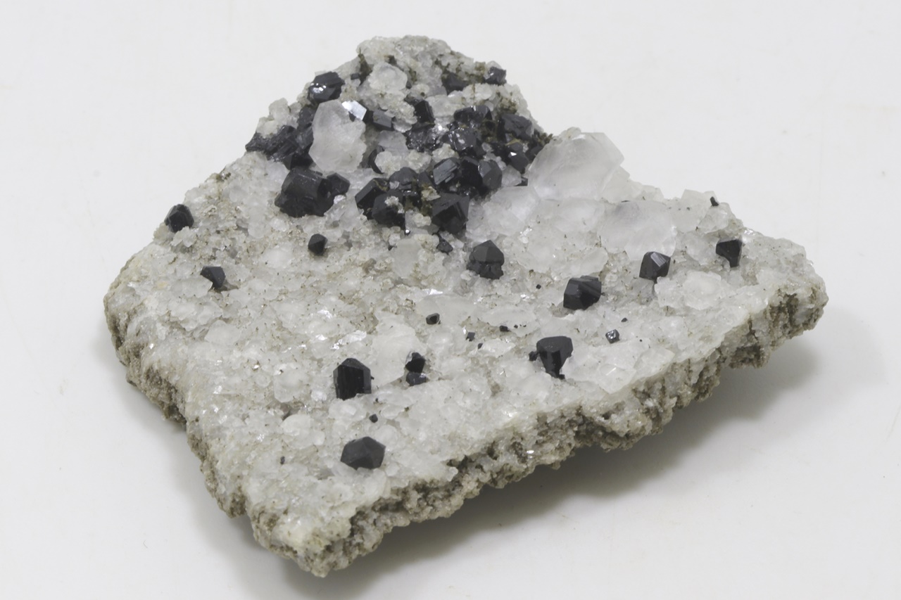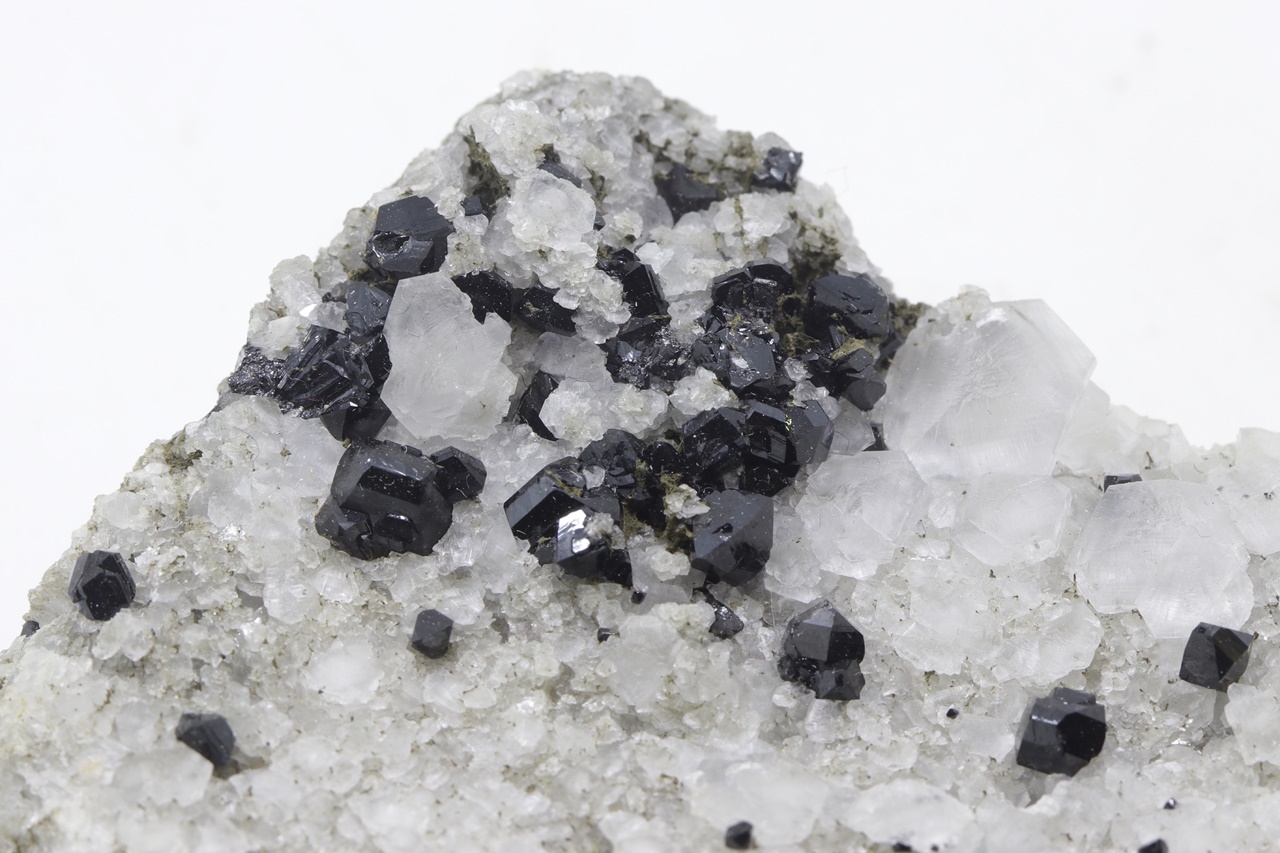 A druse of black, highly lustrous Elbaite crystals grown on a contrasting white Calcite. The largest Elbaite crystal is 5 mm in size .