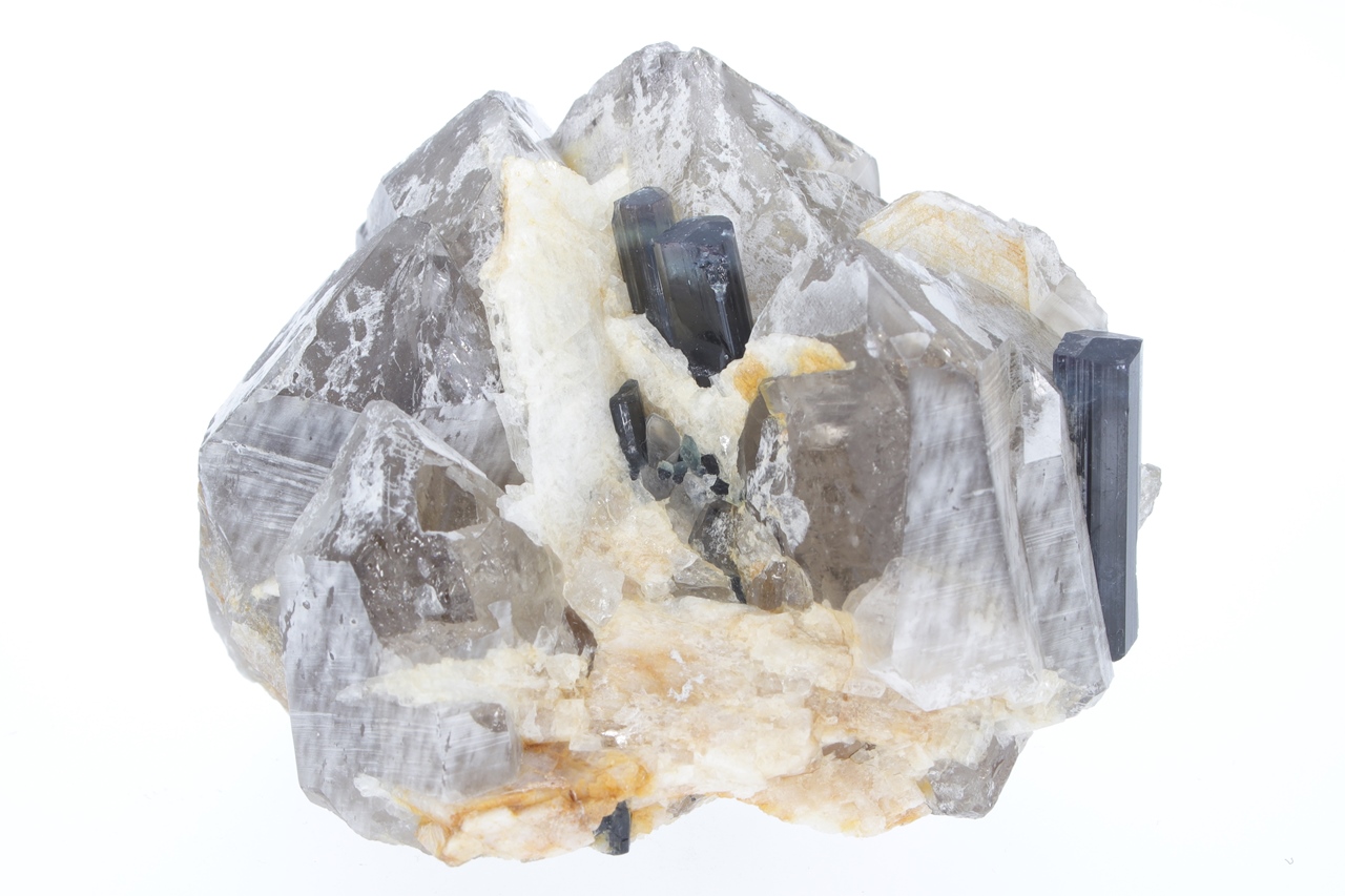 A beautiful display of several deep blue Tourmaline crystals with lighter tips associated with Smoky quartz and Muscovite. The largest crystal is 28 mm, the smaller ones are 10 mm. The smaller crystals are damaged on top .