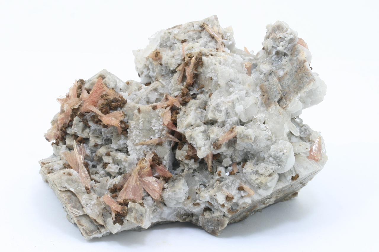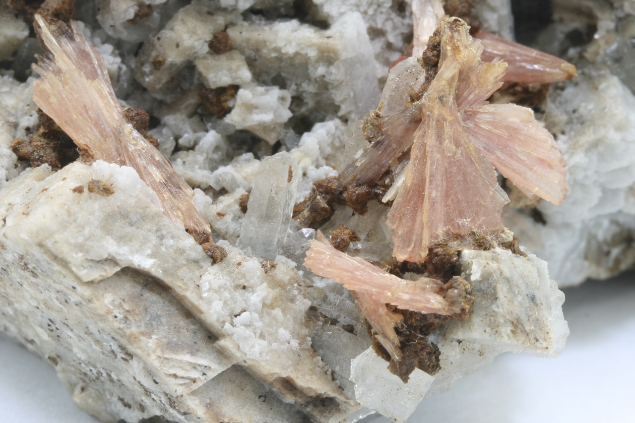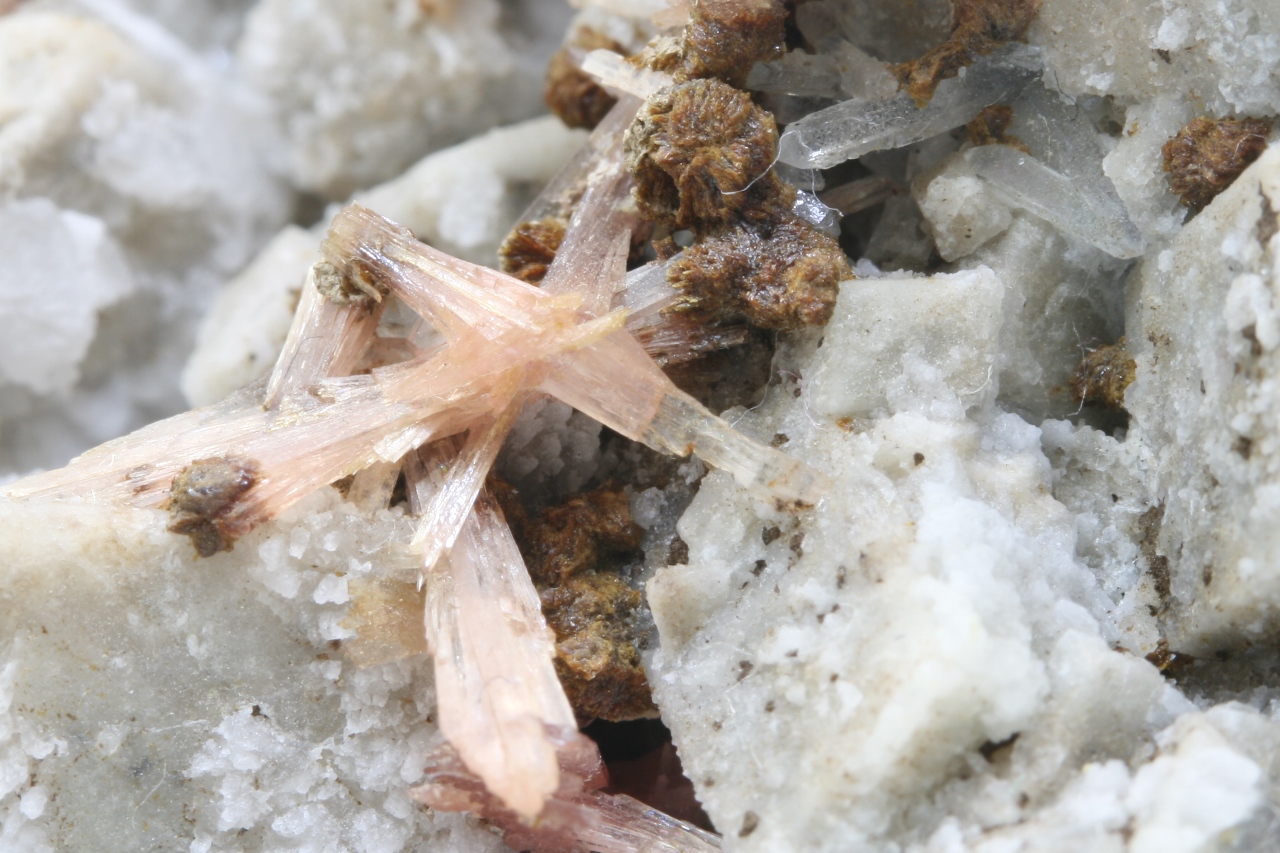 Fans of needle-like crystals of pink rare silicate inestite up to 13 mm in size with spherical aggregates of tabular crystals of brown hubite (a rare silicate known only from two locations) up to 2 mm in size grown on gray dolomite.