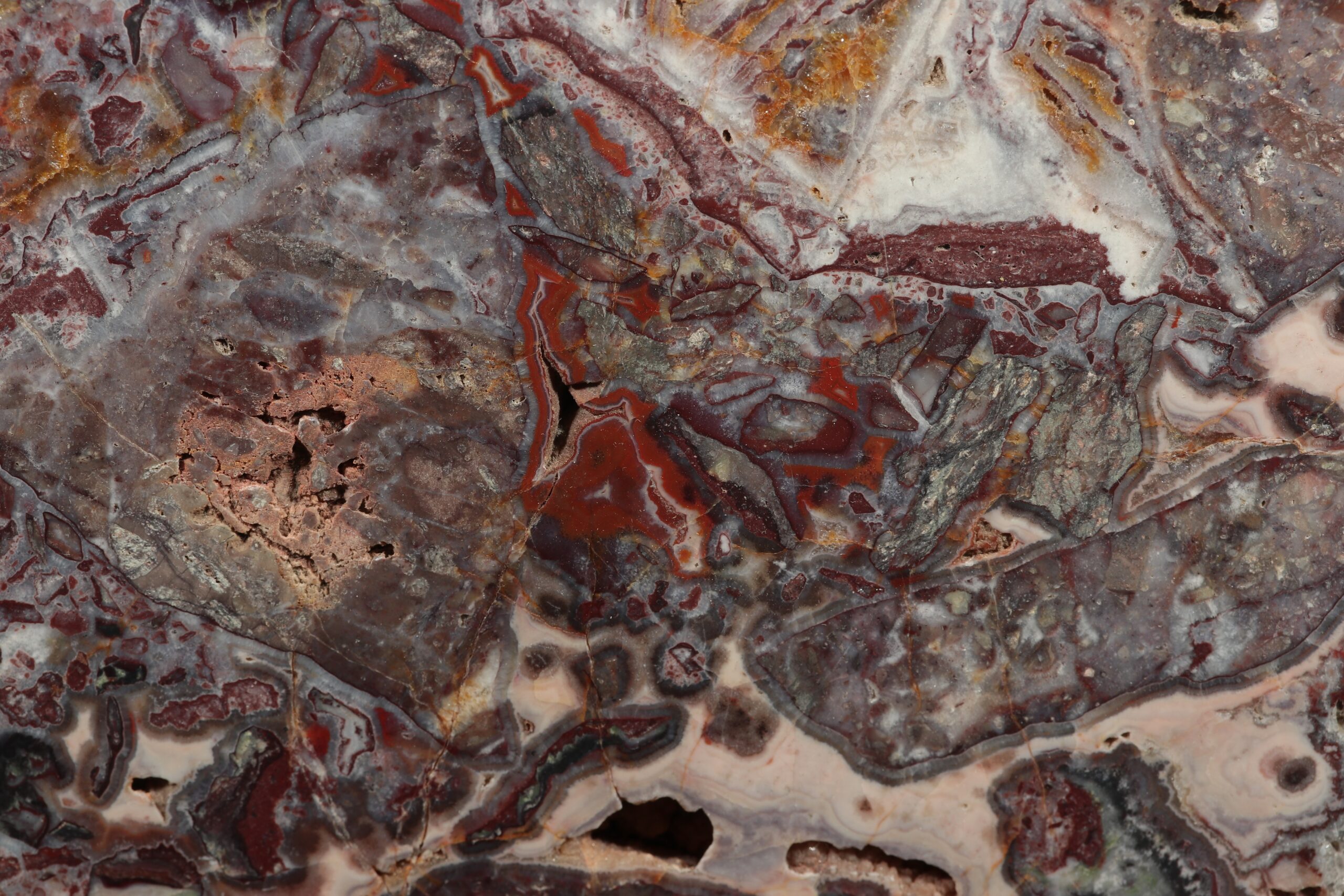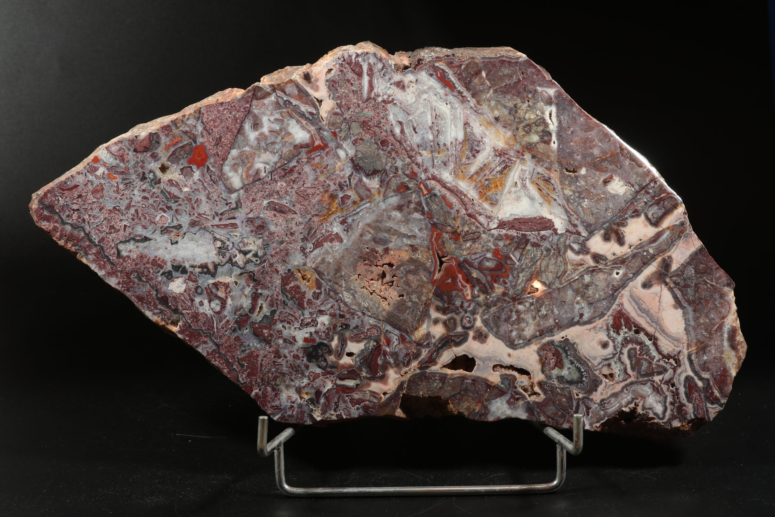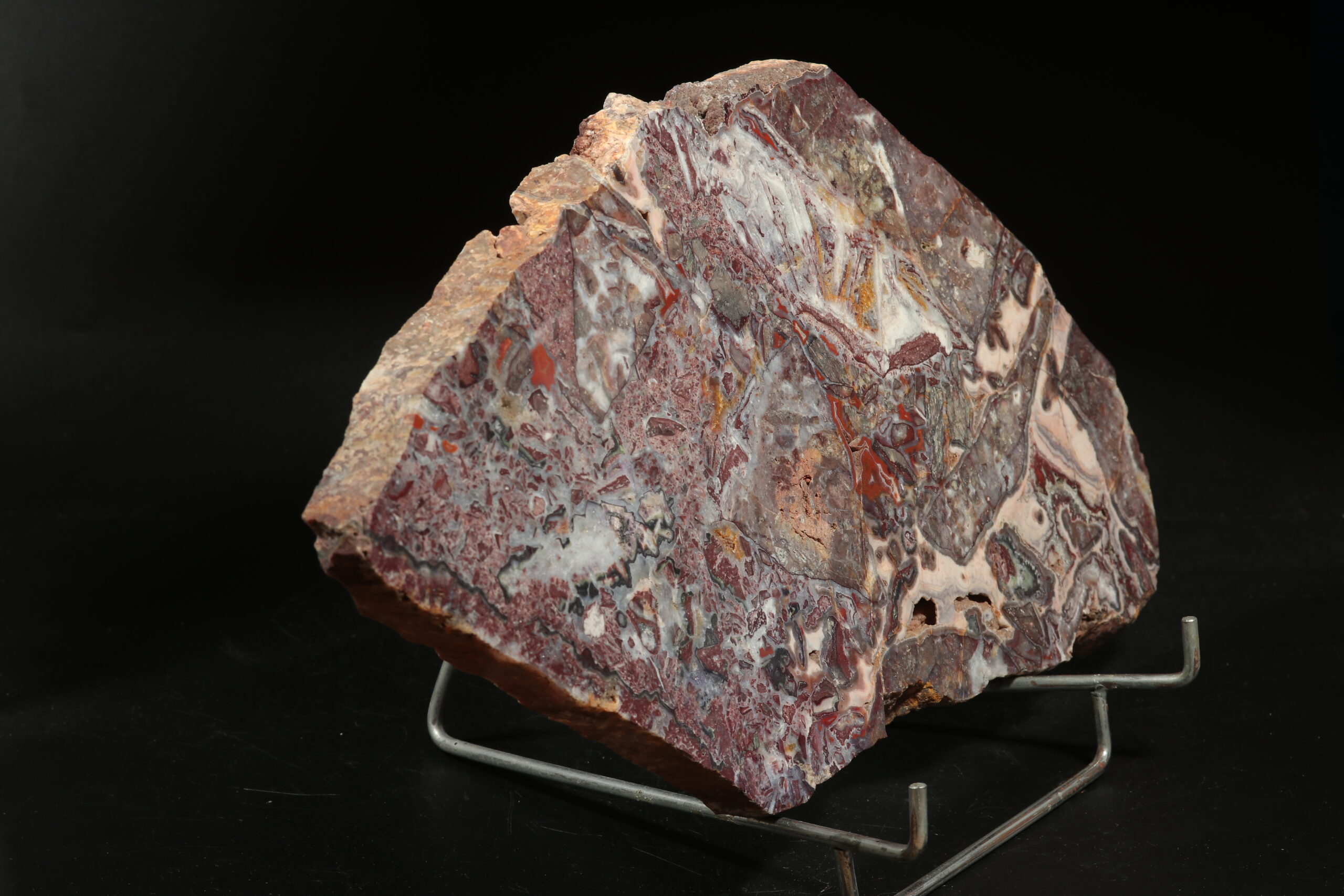 A beautiful sample of jaspis with agate drawing from the area around Horní Halže locality. It is a cut that is perfectly polished on one side. It is a specimen with a very diverse pattern, complemented by small cavities filled with crystals.