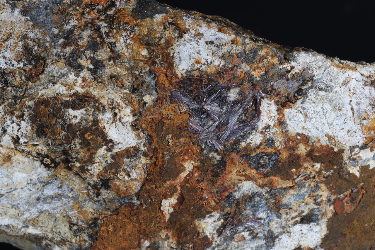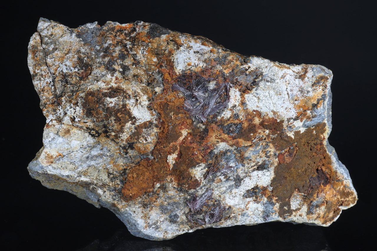 Thin flat specimen up to 8 mm of needle-like kermesite crystals aggregates on massive fine-grained stibnite from the classic locality Pernek. The specimen is trimmed on the back side.