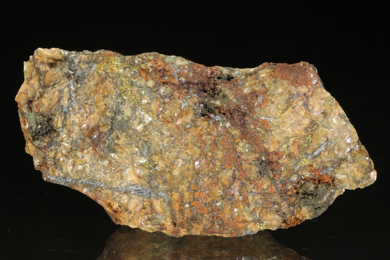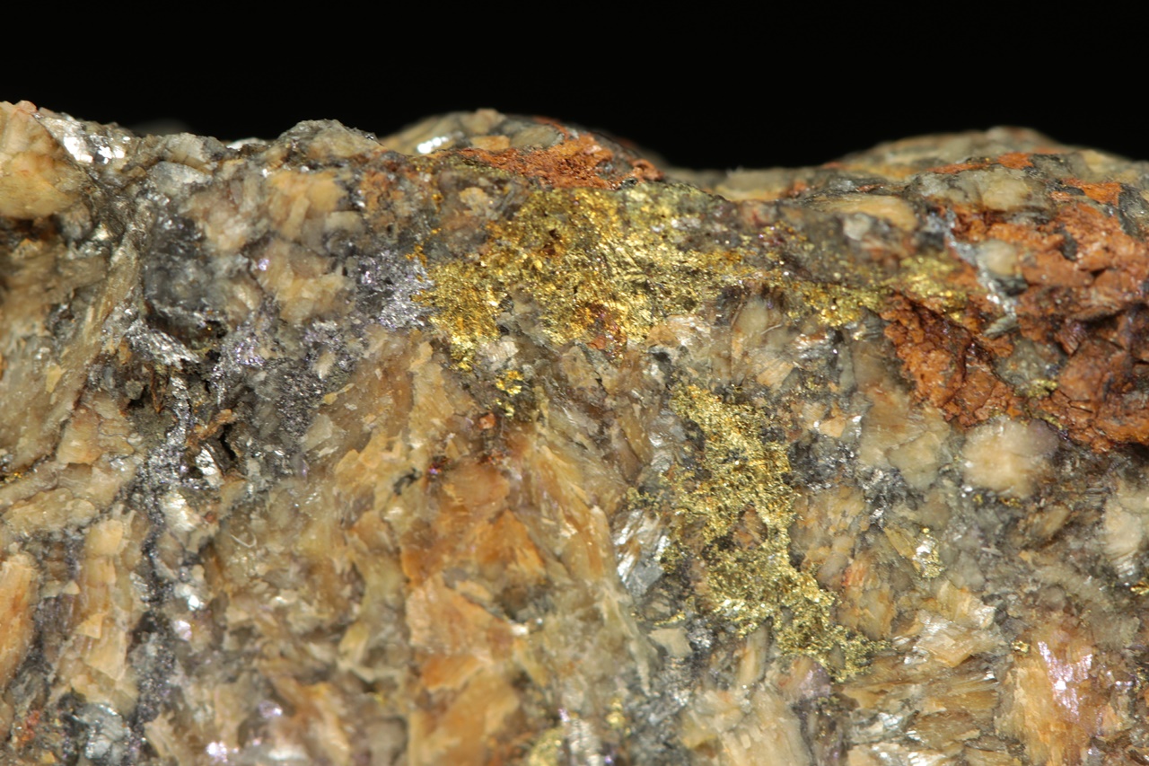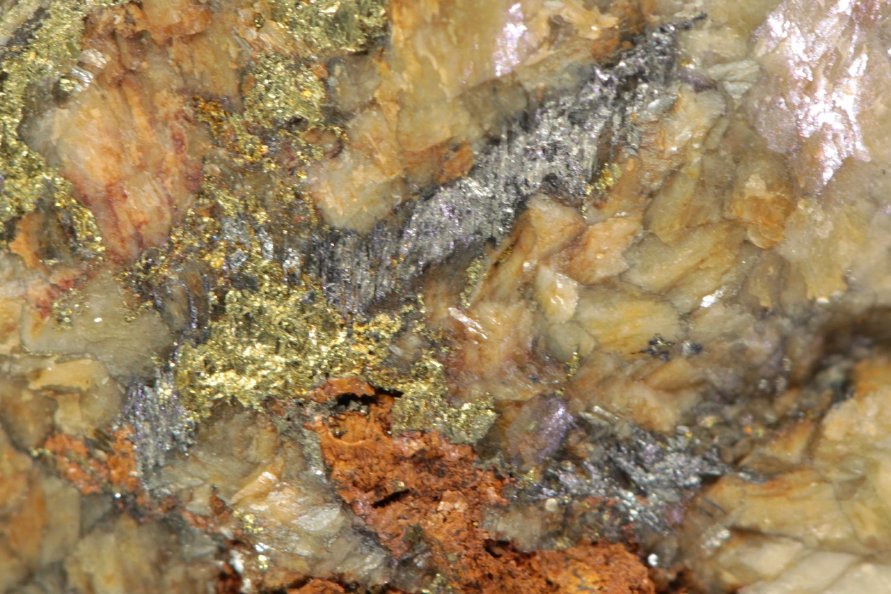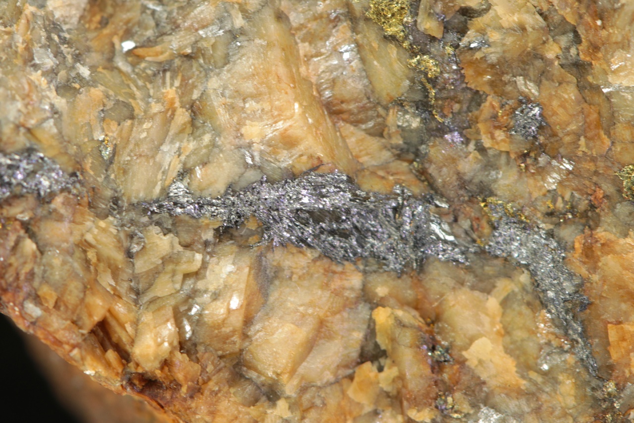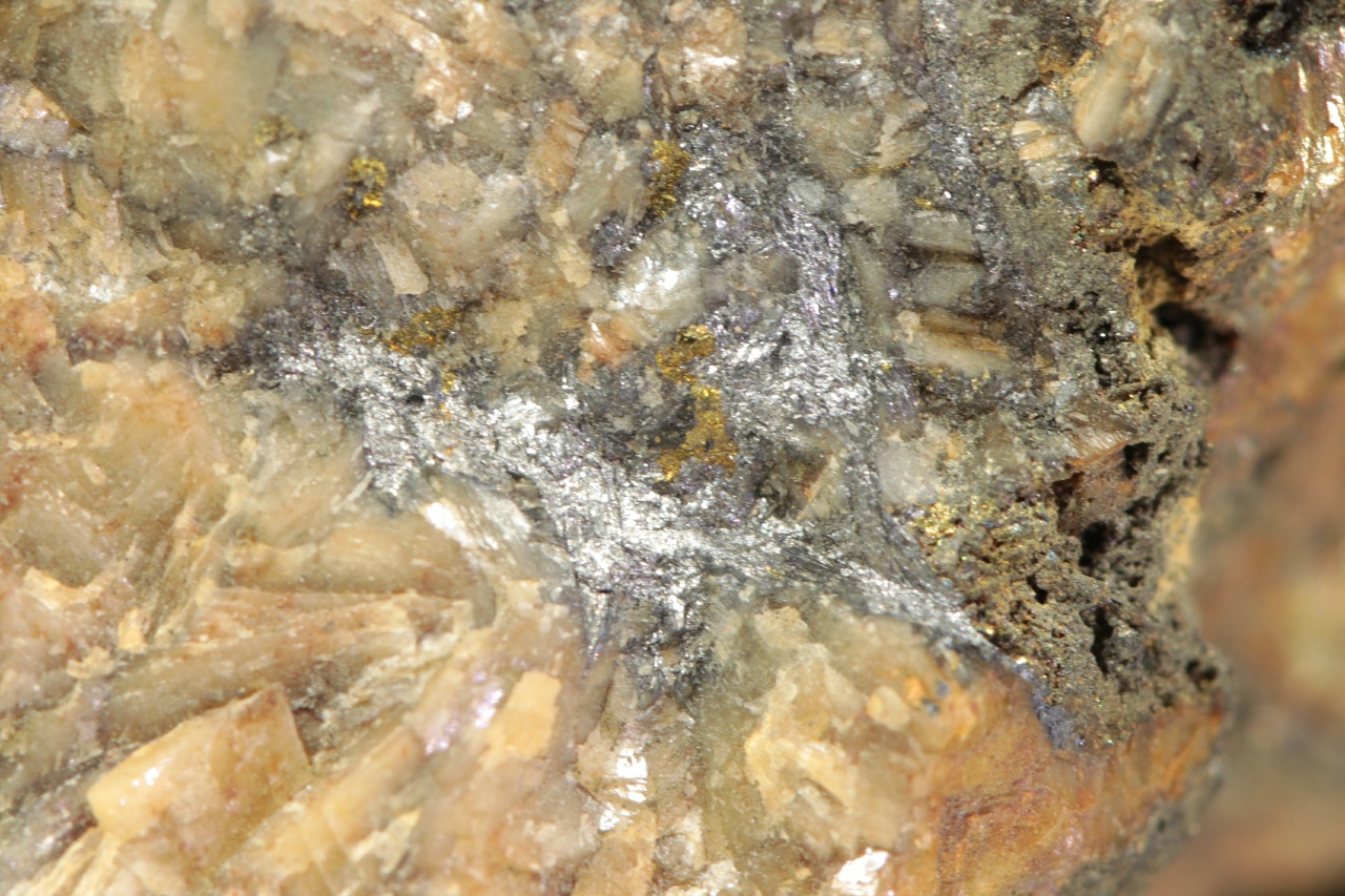 Gray metallic-looking bars in the rather rare world of kobellit with beige siderite and golden chalkopyrite. The largest bar is 2 cm long.