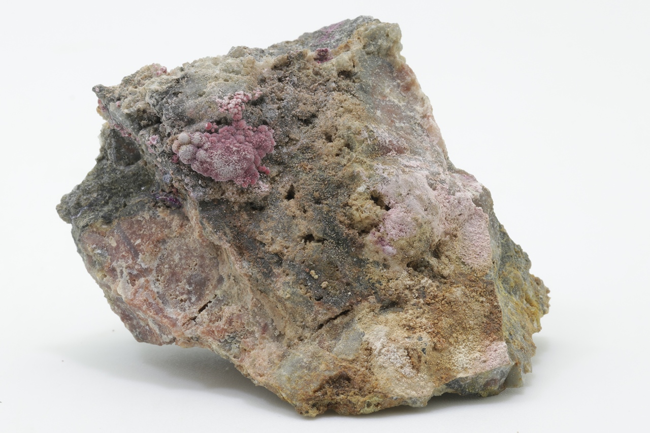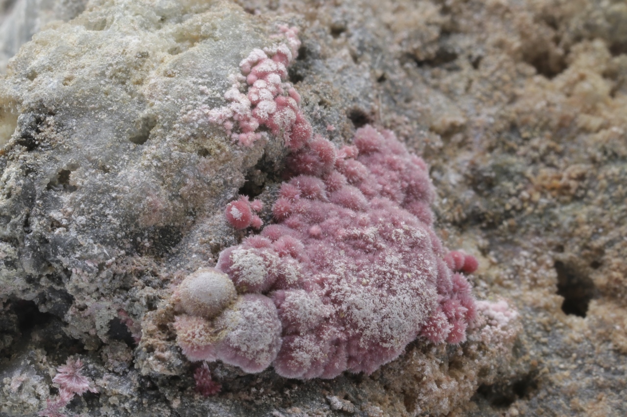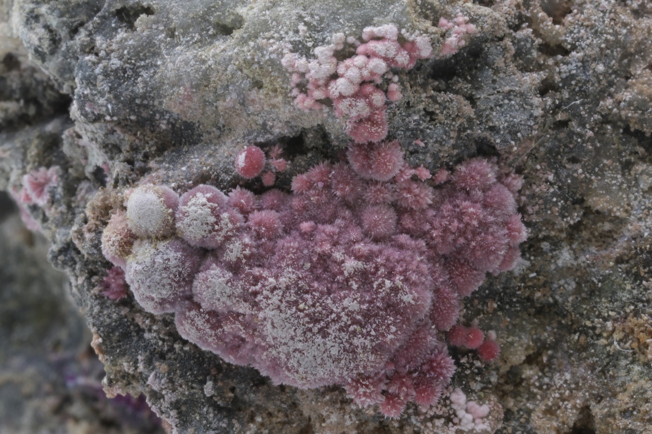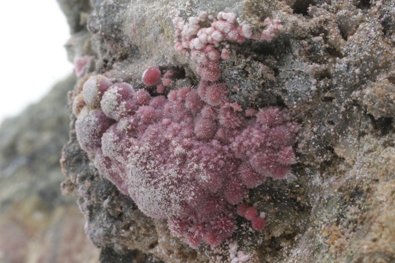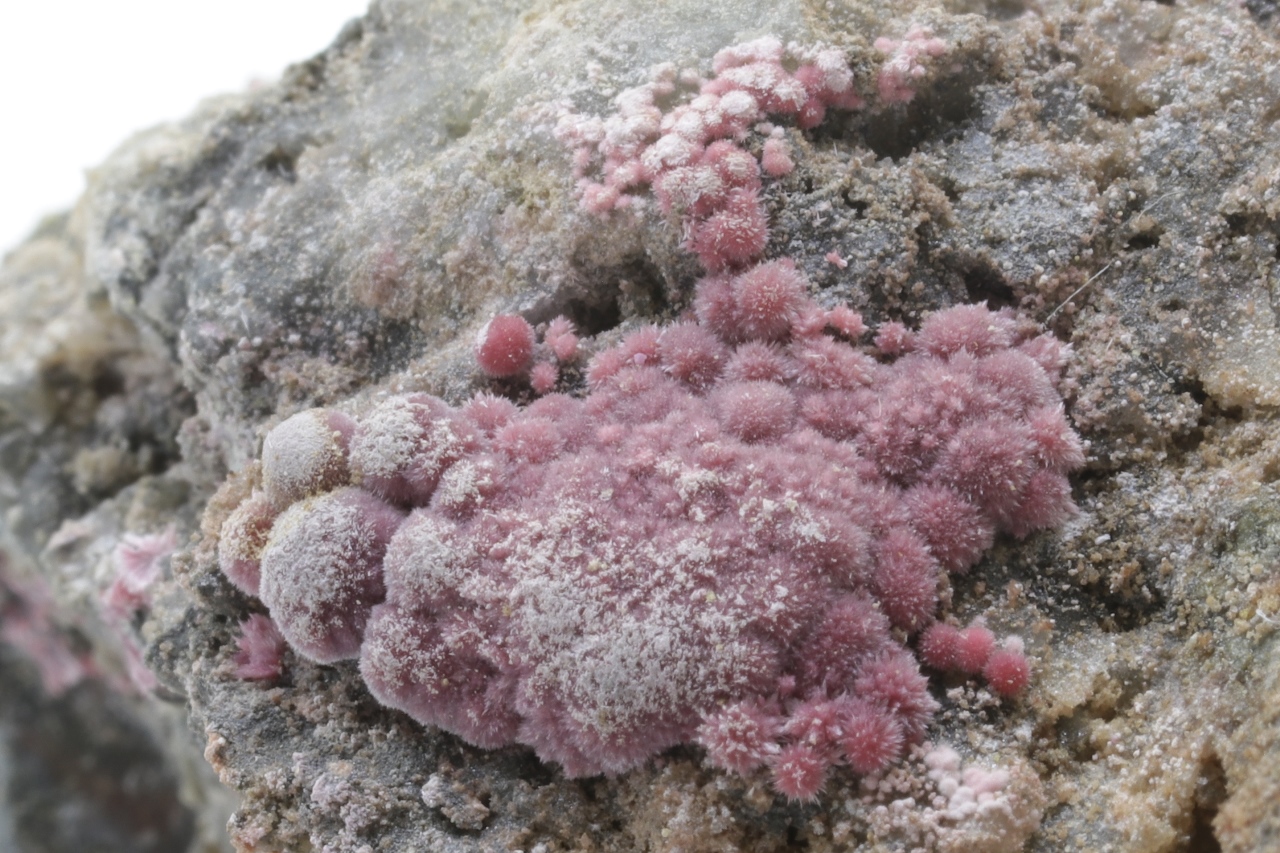 Growth (13 × 8 mm in size) of spherical aggregates of zinc arsenates with a typical pink color for this locality.