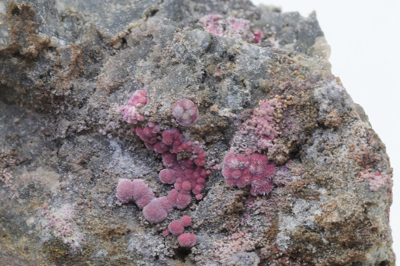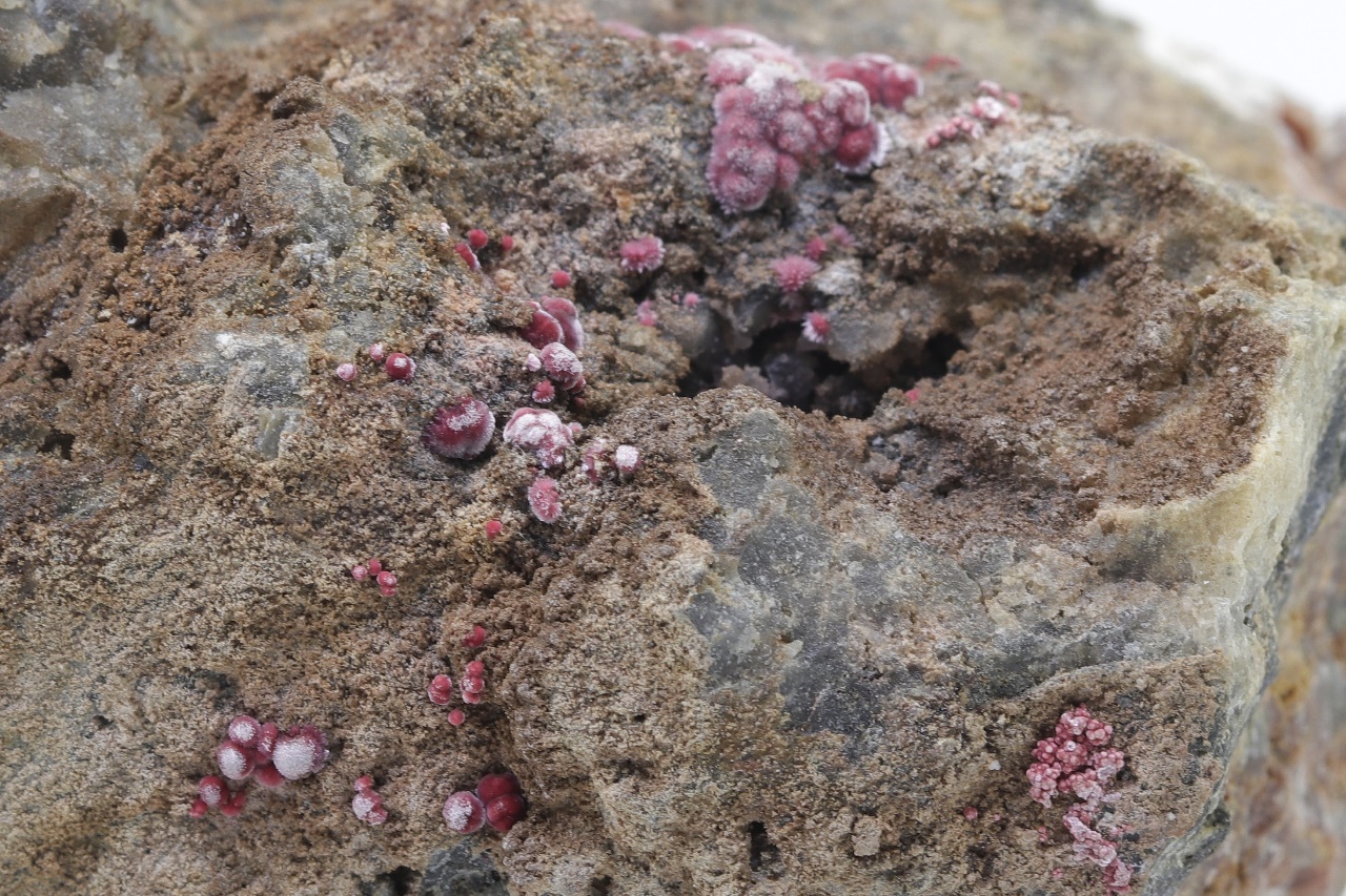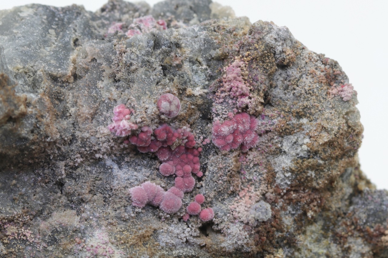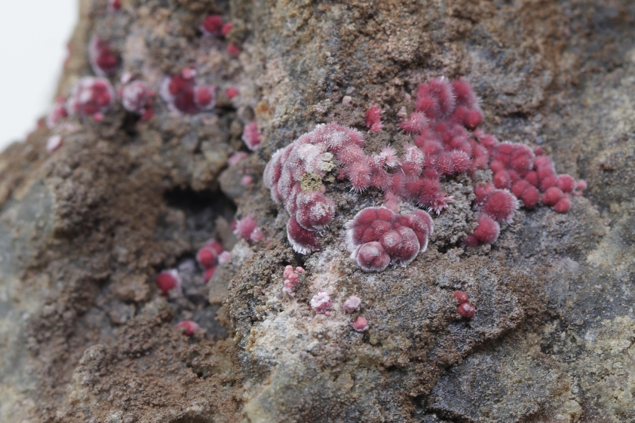 Beautiful spherical aggregates of intensely pink köttigite needles that transition to white at the top. The size of the spheres is up to 2 mm.