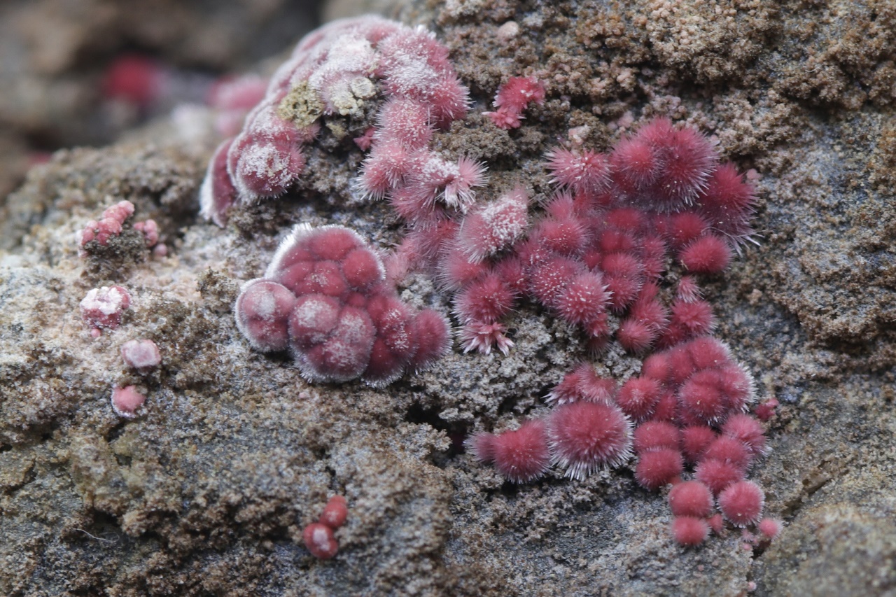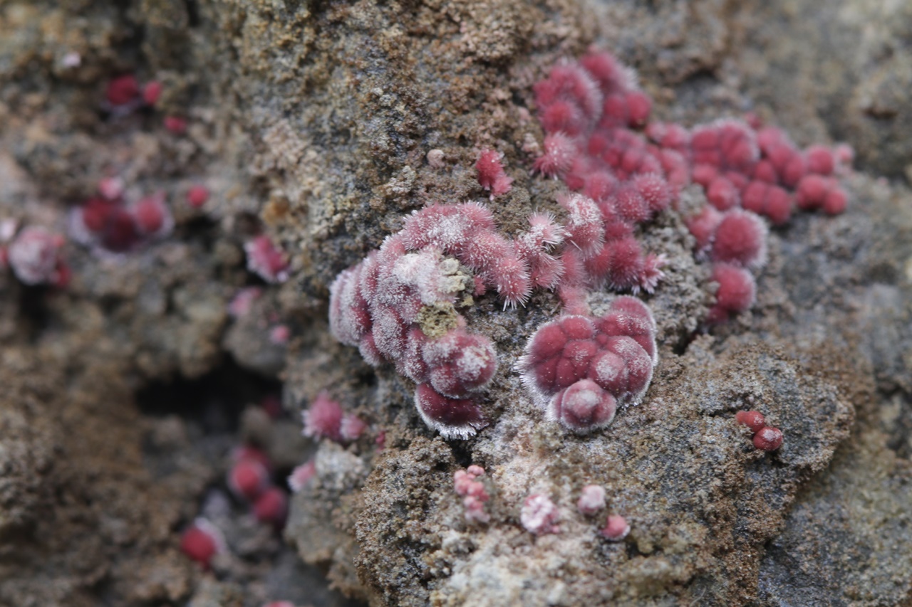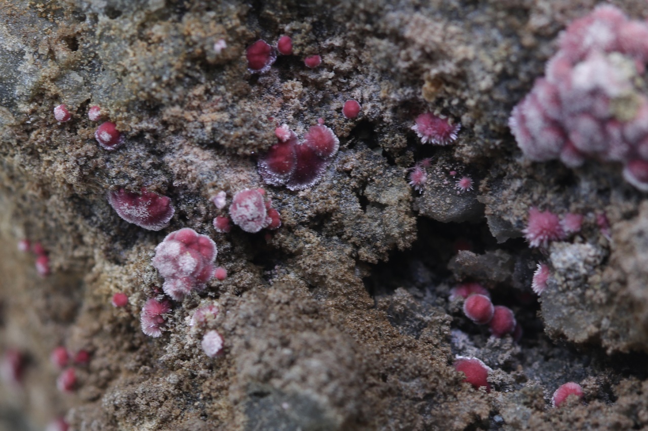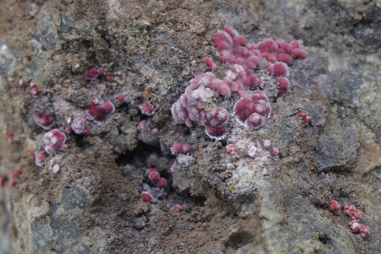 Beautiful spherical aggregates of intensely pink köttigite needles that transition to white at the top. The size of the spheres is up to 2 mm.
