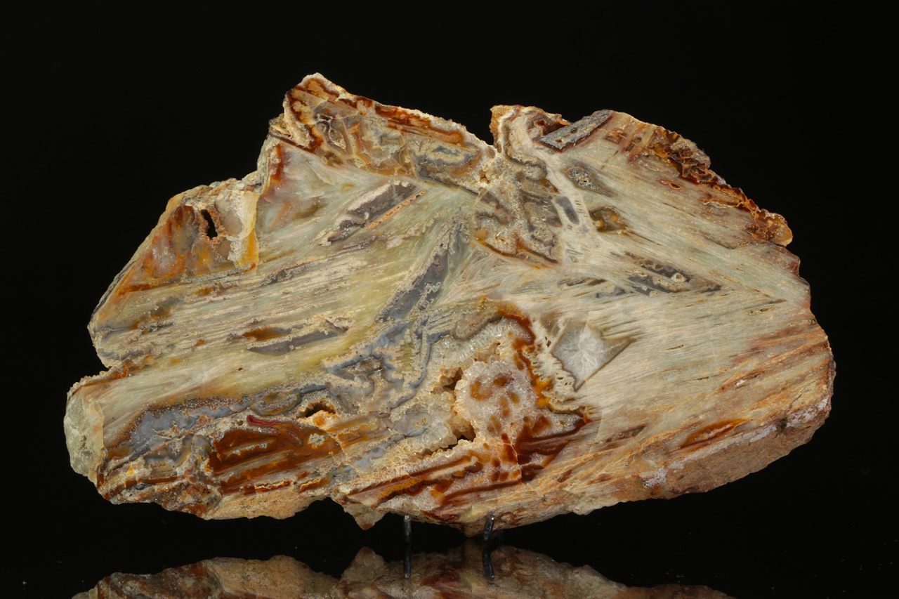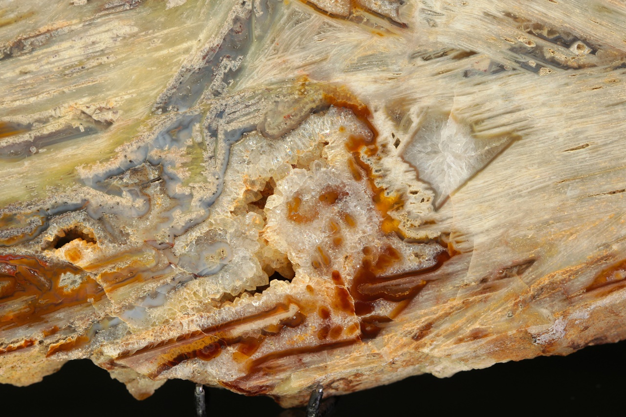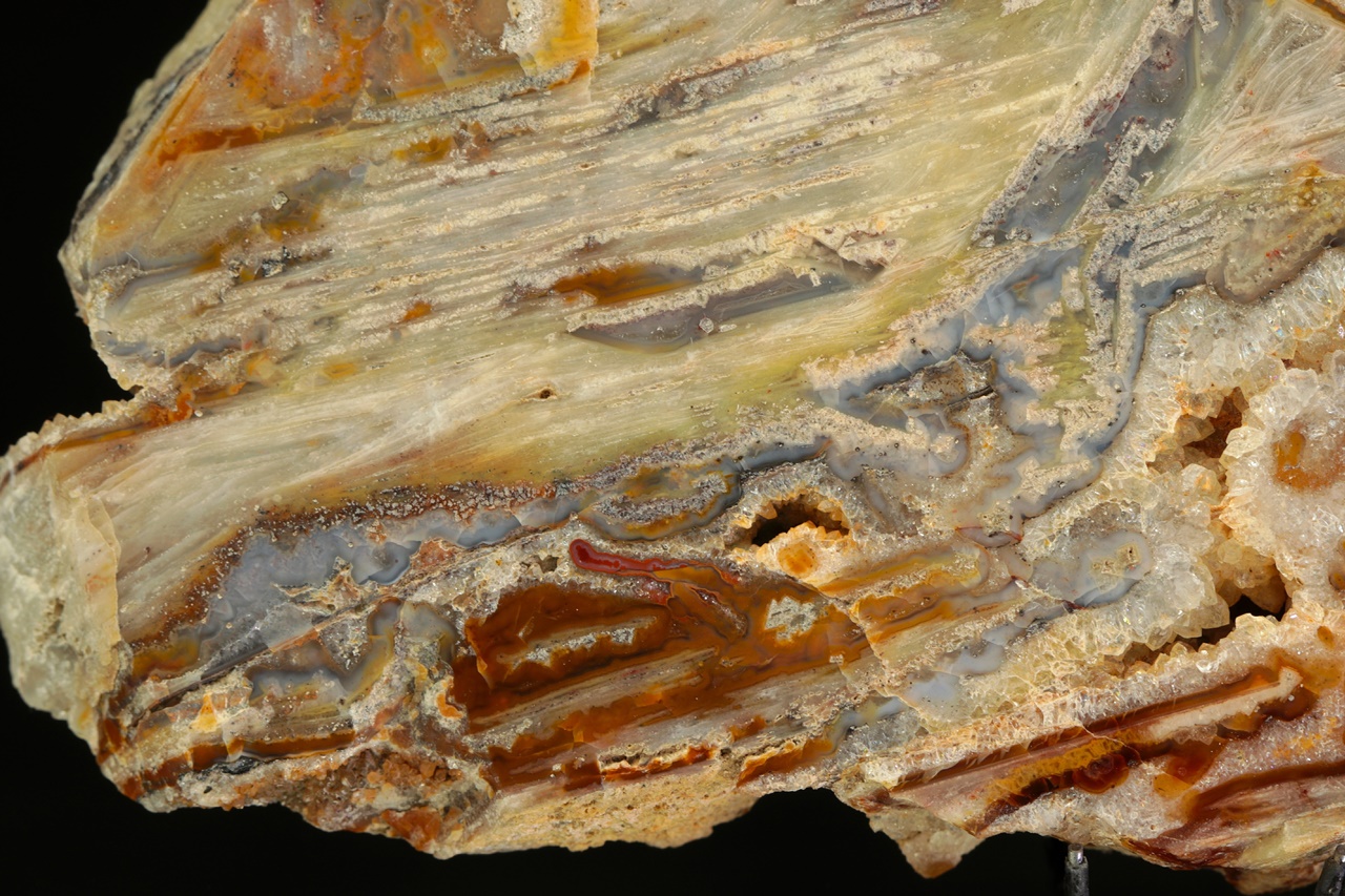 Leštěný vzorek vrstevnatého křemene s dutinami achátů.
