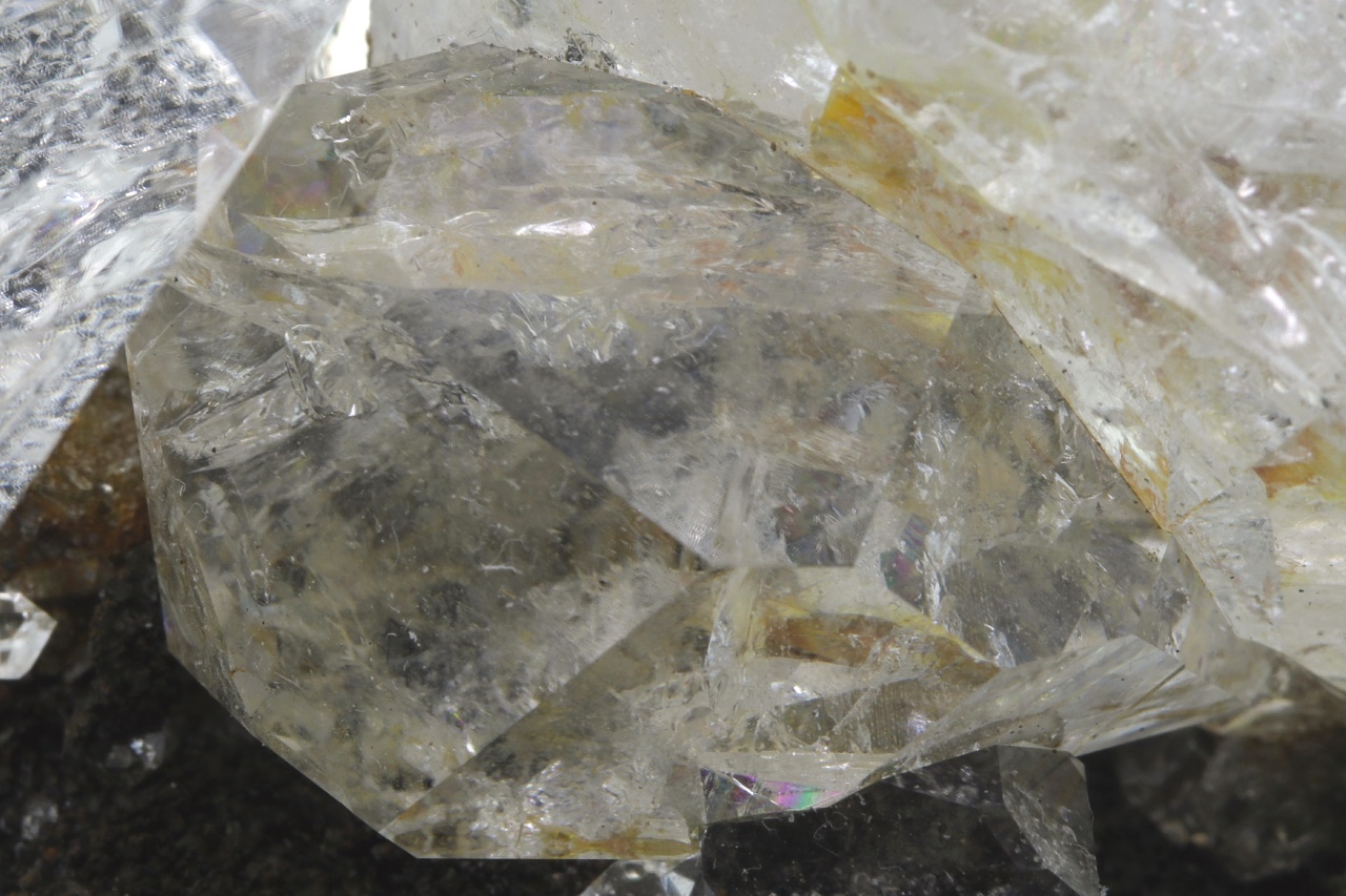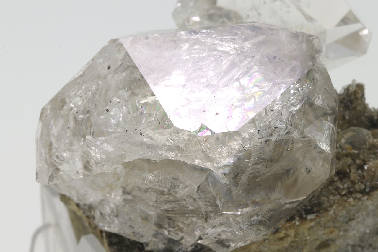 Nádherný vzorek čistých oboustranně ukončených krystalů křišťálu s dokonale lesklými plochami diký kterým se křišťálu přezdívá “herkimer diamond”. Horní větší krystal (45 mm) je absolutně neobitý. Spodní krystal (59 mm) je zespodu odlomený a má ťuklou špičku.