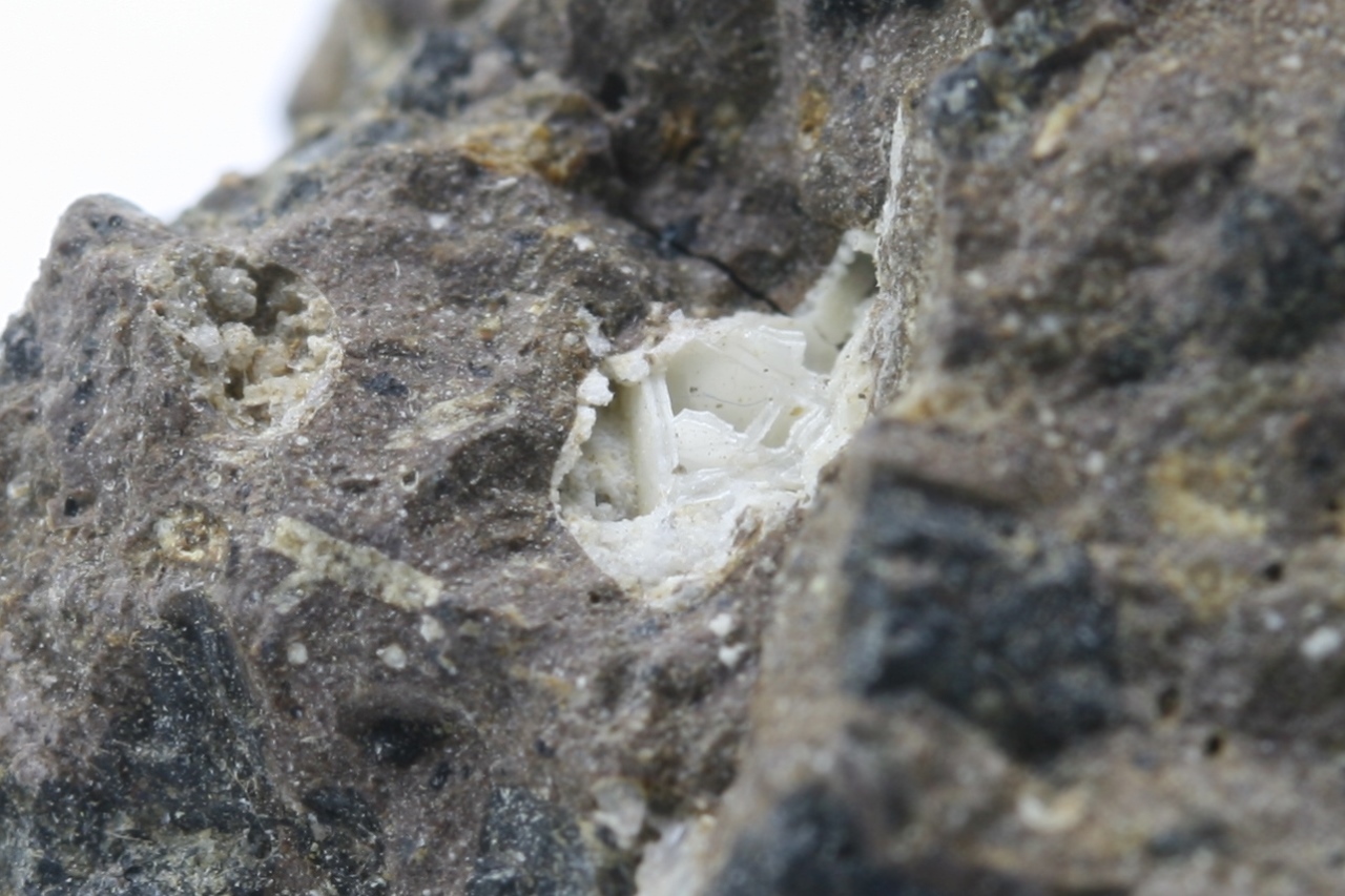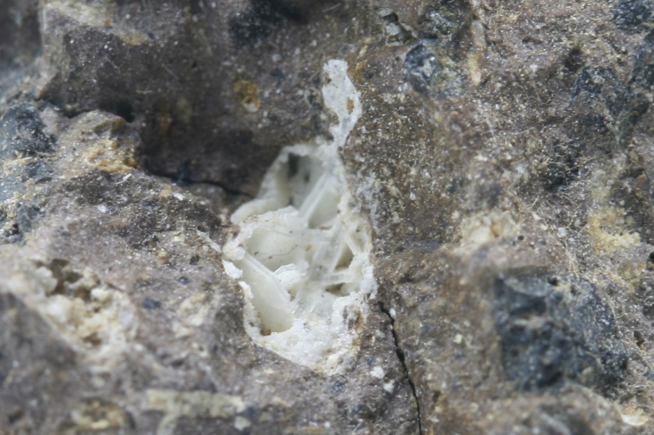 White plates of lévyn growing in a cavity, 4 mm in size .