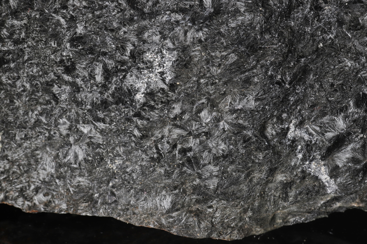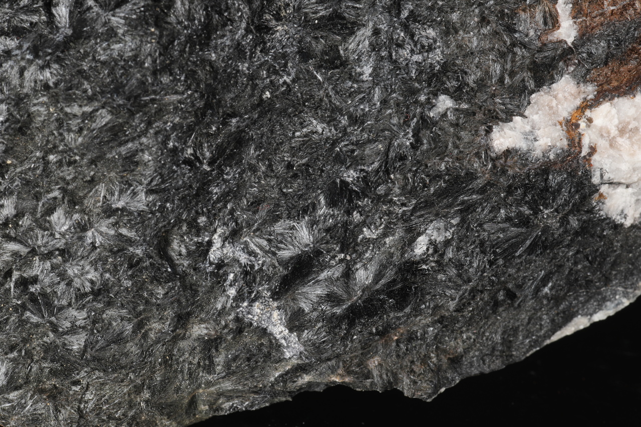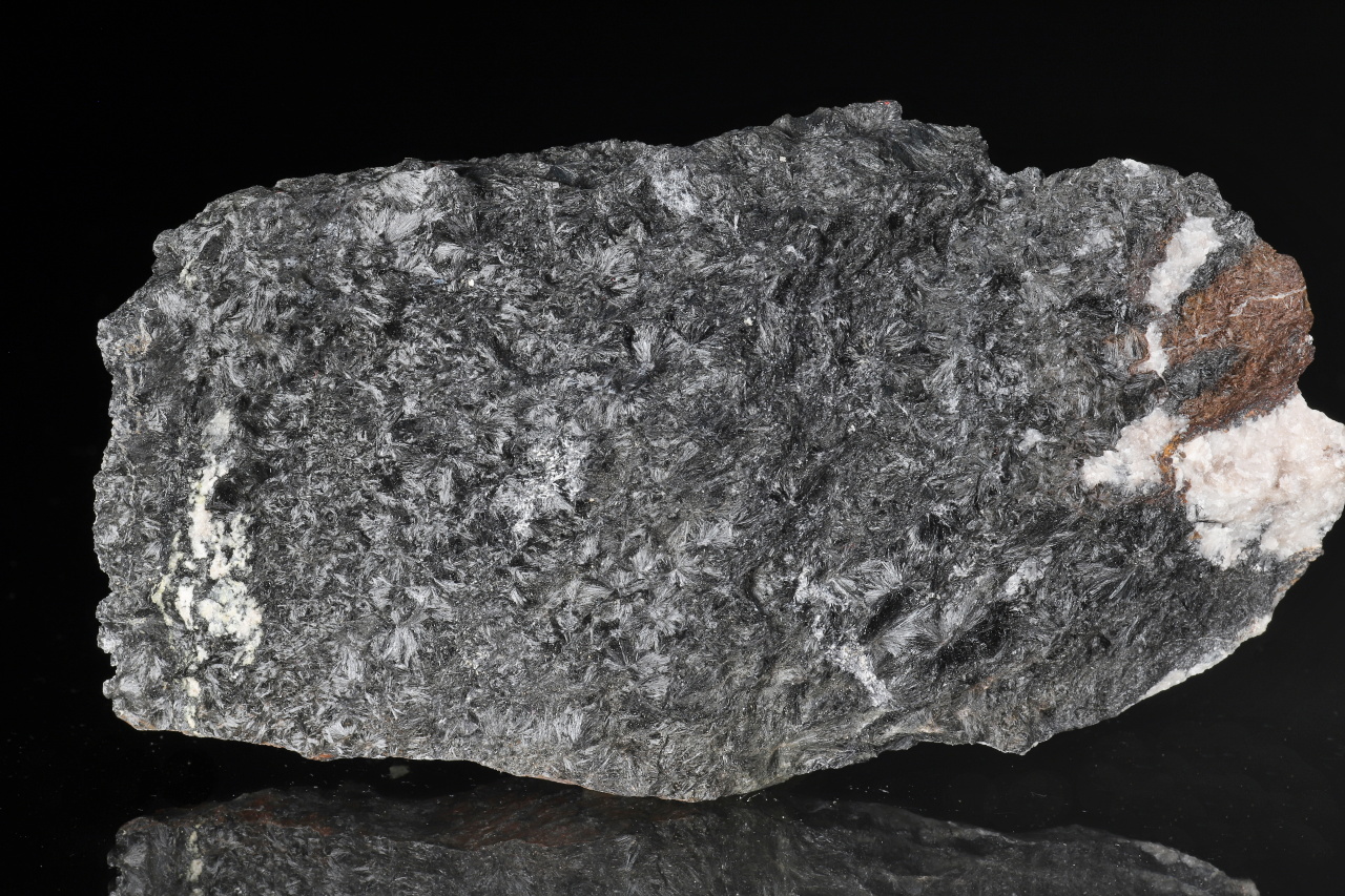 A massive specimen composed largely of fibrous radially divergent black ludwigite. Ludwigite is a relatively rare iron and magnesium borate. This rich specimen comes from its type locality Ocna de Fier in Romania.