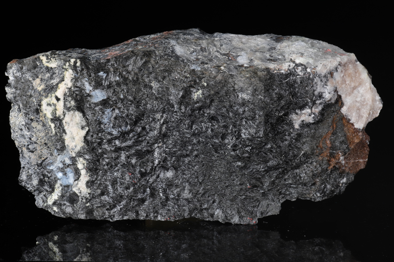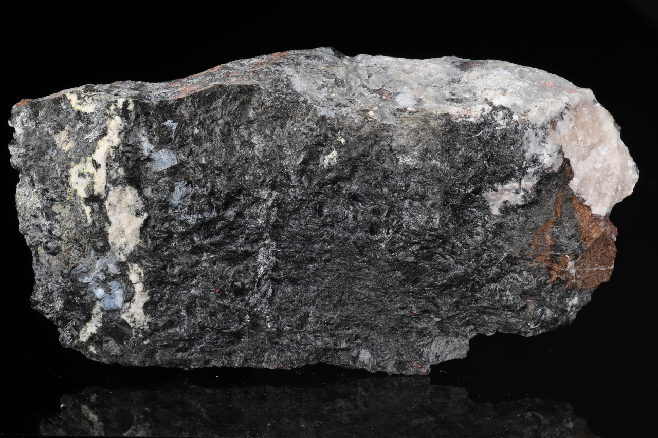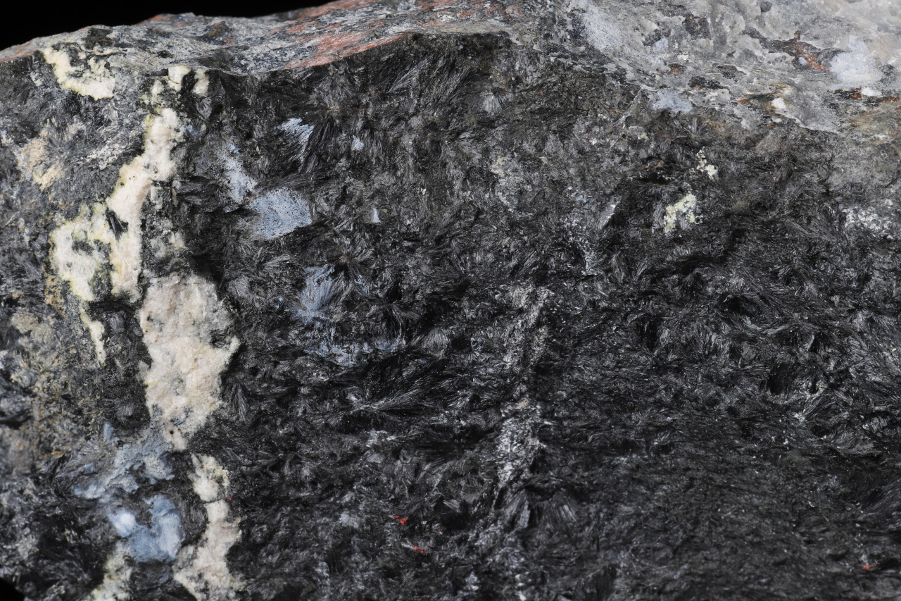 A massive specimen composed largely of fibrous radially divergent black ludwigite. Ludwigite is a relatively rare iron and magnesium borate. This rich specimen comes from its type locality Ocna de Fier in Romania.