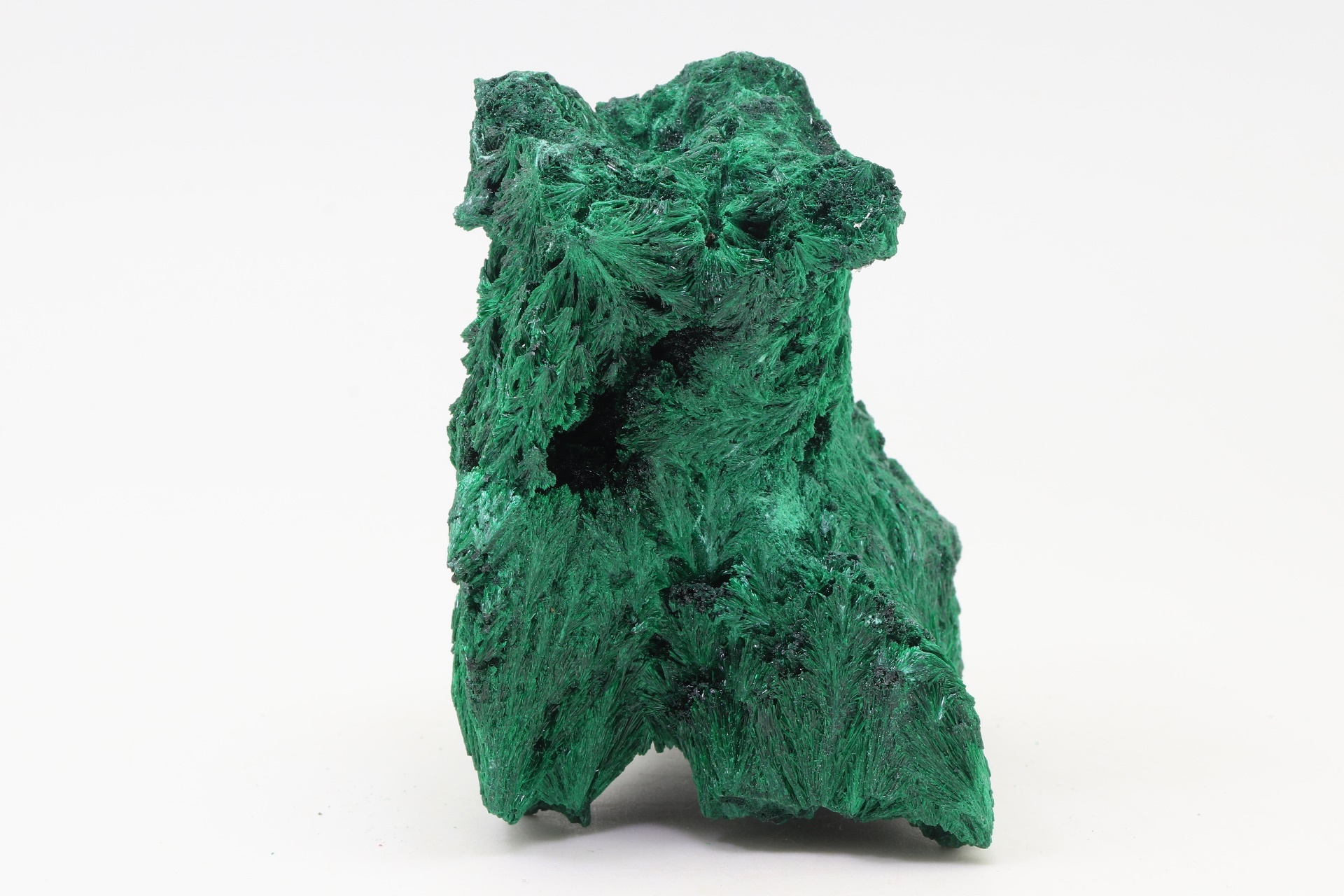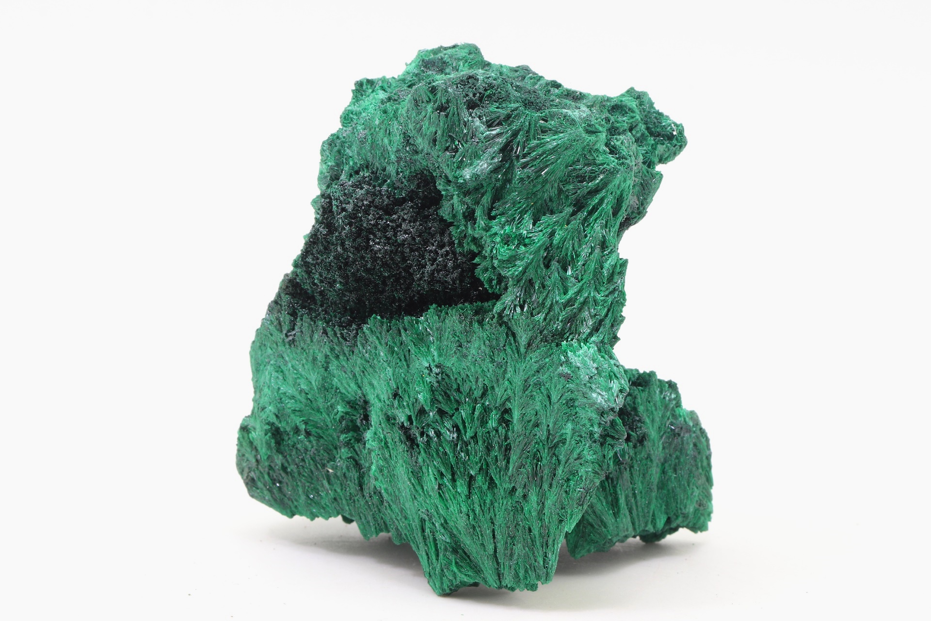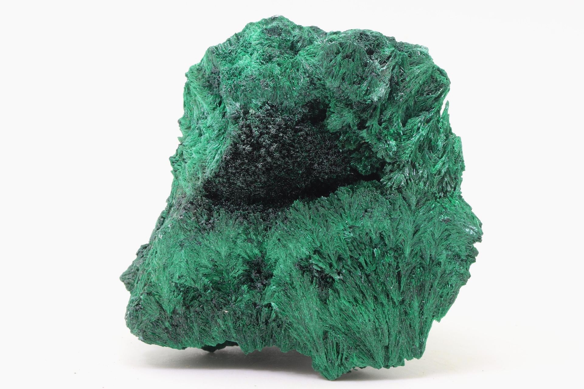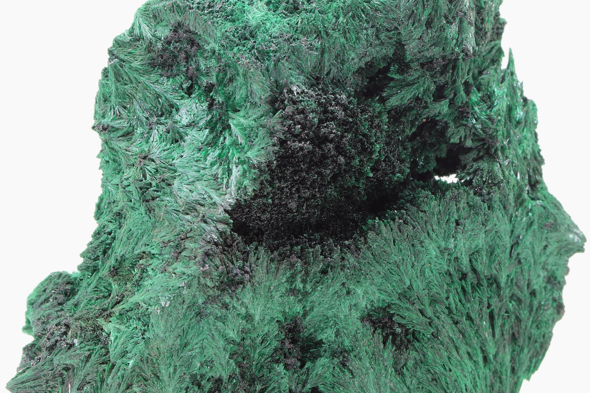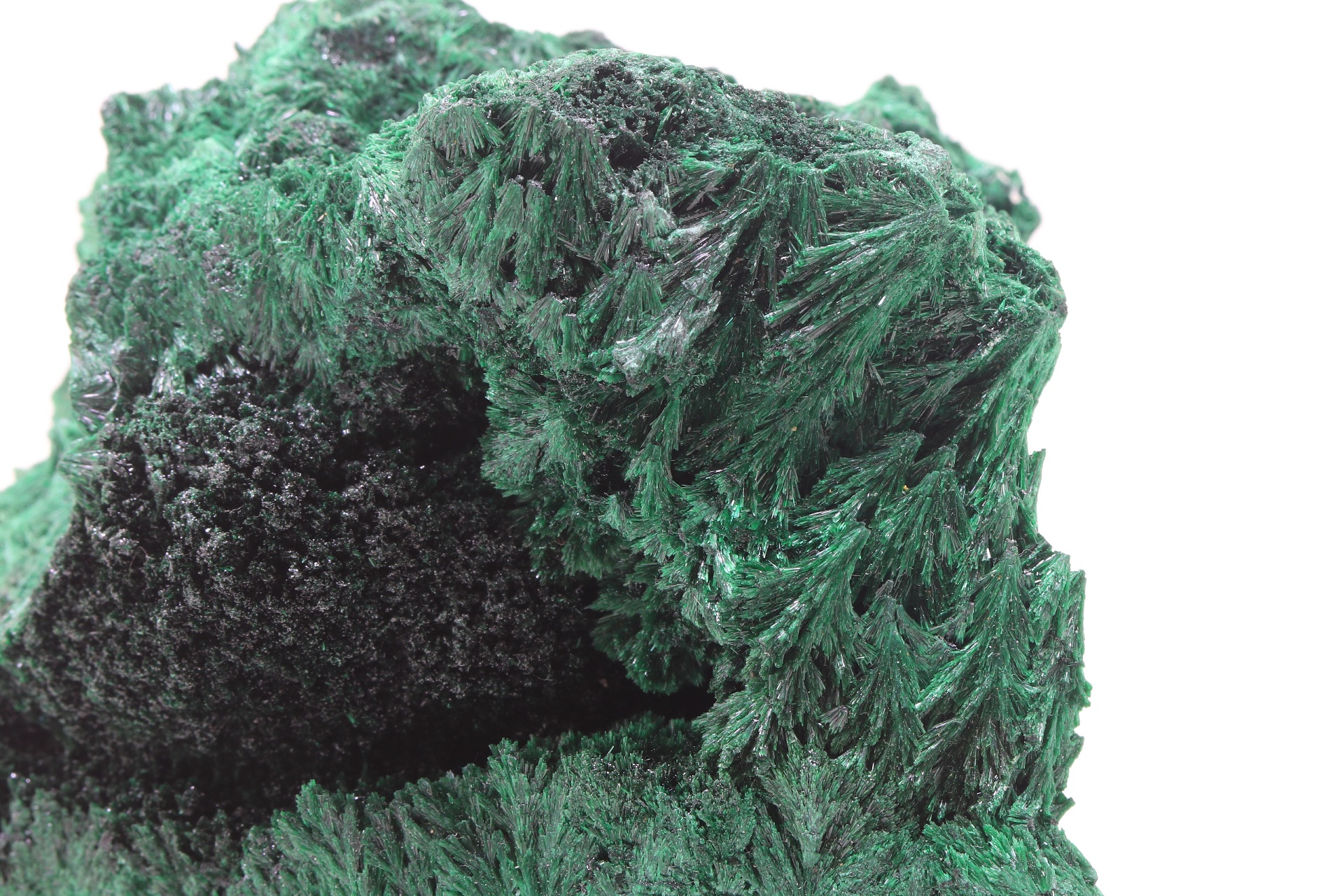 Fan-like aggregates of fibrous, dark green malachite leading into a dark green cavity approximately 7 × 3 cm in size.