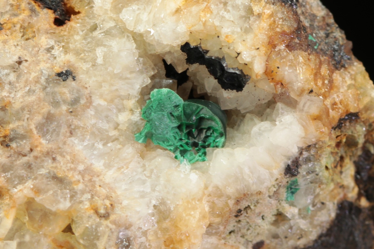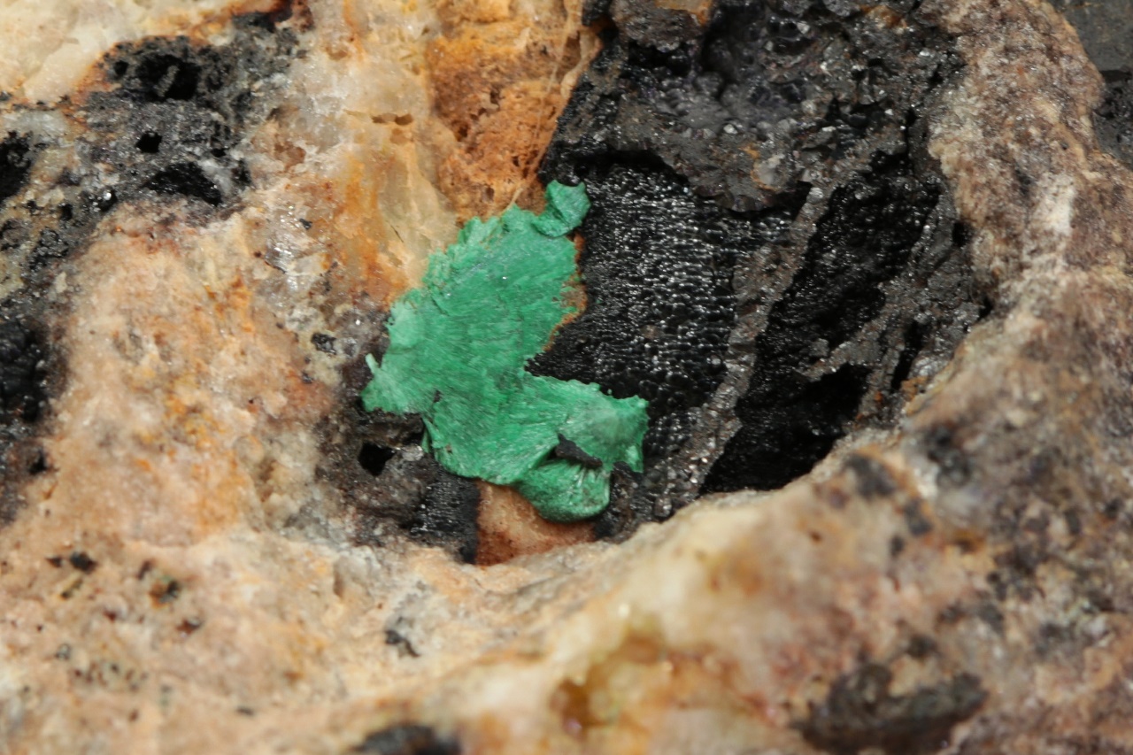 Filamentous aggregates of light green malachite. The largest aggregate is 8 mm in size.